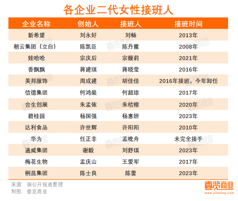 出品/壹览商业 作者/蒙嘉怡 编辑/木鱼 图/网络 2月25日,娃哈哈集团发布讣告,娃哈哈集团创始人、董事长宗庆后因病医治无效,于当日10时30分逝世,享年79岁。宗庆后的女儿宗馥莉正式接过父亲的职位,成为娃哈哈新一代掌门人。 值得注意的是,此次是女承父业,同时壹览商业也注意到,除了娃哈哈,不少到了退休年龄的创一代们,并没有把位子留给儿子,而是选择让女儿掌管商业帝国。根据壹览商业不完全统计,包括碧桂园、新希望、香飘飘在内的13家企业,由女性已经或者即将接过父辈手中的接力棒,成为家族企业新一代话事人。 其中,通威集团的刘舒琪虽已接过权杖,但其父刘汉元依然在董事会中,且在官方履历中排名居首;2023年4月1日至9月30日期间,孟晚舟当值轮值董事长,并未完全定下接班人身份;胡佳佳在接班7年后,卸任董事长、总裁,其父周成建再度出山。 ![]() 商圈里的女性力量 在娃哈哈宣布宗庆后离世后,“女继承人时代来了”这一话题迅速引爆网络,登上热搜。 女性继承者们能够如此备受瞩目,一方面是因为固有的社会结构更偏向男性继承,在女性主义崛起的今天,需要强调这种变化;另一方面,具备差异化、新闻性的内容更容易抓住大众眼球。传统认知中“男性接班”更符合常识,“女性继承者”就像一片绿叶中突然出现一朵红花,因制造了与常识相反的冲突感,反而更易引发各界关注。 而女性继承者们能够脱颖而出,有着多种原因。 首先,根本原因在于企业继承是优胜劣汰的过程,性别并不能代表一切。君智战略咨询首席战略专家陈方超指出,谁更能引领企业高质量发展并不断创造价值,才是一代企业家看重的关键。 合生创展创始人朱孟依为广东省梅州人,身后有两子一女。大哥朱一航热衷于电竞与新能源产业,更广为人知的身份是EDG电子竞技俱乐部负责人;二哥朱伟航毕业于中山大学金融学专业,核心操盘金融领域,现任珠江人寿保险集团董事长、广州珠江投资股份有限公司董事长。 哥哥们擅长的领域并不在合生创展的主业之内,权衡利弊下,朱孟依选择培养朱桔榕。朱桔榕于2011年进入董事会,并担任执行董事,2013正式接任集团董事局副主席之位。同年,合生创展实现销售额112.67亿元,2019年,公司再上一个台阶,销售额达212.58亿元。 这些成绩,比哥哥们要优秀不少,朱孟依看到了朱桔榕的价值与潜力,坚信她能够带领企业走向更高更强。2020年1月13日,合生创展集团宣布,董事会主席朱孟依退出董事会,女儿朱桔榕正式接任集团掌门一职。 与之相对的,是几位“不堪大任”的儿子们。2003年,时任全国工商联副主席,有着“钢铁大王”之称的山西海鑫钢铁董事长李海仓在办公室遭枪杀遇害,其子李兆会继任,10年后李海仓留下的钢铁帝国在李兆会手里清零,企业崩盘,李兆会也不知去向。2014年6月,陶华碧让出老干妈一把手的位置,由大儿子李贵山、小儿子李妙行接棒掌管老干妈。结果大儿子热衷投资,变成“老赖”,小儿子“节省成本”,让老干妈口碑一夜崩塌,陶华碧只能再度出山掌管大局。 其次,绝大部分继承者们都有较高的教育水平,具备一定的全球视野,理念较为先进:陈蕾是英国帝国理工大学的风险管理和金融工程专业硕士;孟晚舟毕业于深圳大学,后进入华中理工大学深造;刘舒琪毕业于英国伦敦女王玛丽大学;宗馥莉14岁赴美留学,后在美国洛杉矶佩珀代因大学主修国际商务专业。 在求变的“老”企业家们眼中,先进的理念以及敢于创新的做法代表企业活力。香飘飘创始人蒋建琪的女儿蒋晓莹一直想要创业,在2014年推出露营预订管理平台“易露营”,次年易露营获得1000万元的A轮融资,2016年开启创业项目“订单来了”,不到一年时间,“订单来了”的网站成交金额破亿。这些成功的创业经历让蒋建琪看见了女儿的天赋,他把原来的电商部调整为互联网事业部,让蒋晓莹亲自挂帅。 除此以外,有些女性继承者的出现纯属意外。达利食品许世辉有一儿一女,儿子许亮亮早年被当成接班人进行培养,担任达利集团副总裁,但许亮亮在2012年遭遇车祸去世,无奈之下,女儿许阳阳接手公司。 值得注意的是,部分继承者没有完全接手企业。继承前期,权力主要集中在公司治理层面而非管理层面,如孟晚舟、宗馥莉、刘畅,她们都在公司底层部门工作过,并非一进公司就“挑大梁”。 陈方超表示,继承者在刚接手时,往往会在企业各个部门端流转以了解整体业务,经营端则靠职业经理人协助代管,避免在交接时出现因“人”的事造成公司业绩波动。也造成初期继承者在治理而非管理的局面,因为治理是虚,管理是实。 目前,家族企业的传承模式主要有两种:子承父业、职业经理人。而对于传统企业而言,绝大部分会选择家族传承而非职业经理人。一方面,他们从小在父辈身边耳濡目染,青年时期既获得了商业学识,又有实践积累。另一方面,比起职业经理人,他们才算“自己人”,懂商业、懂行业,更懂家族,他们才是真正“站在巨人肩膀上”的人。 对于家族企业而言,最重要的是传承,只要能力强,基本不局限男女。并且继承者们不是“享清福”,他们也面临不小的挑战。 比一代更难 首先,大部分继承人接手时企业或行业呈下行状态,对他们而言守成困难。 桐昆股份2023年宣布陈蕾担任董事长,并出任桐昆集团总裁,而桐昆股份2022年净利润为1.3亿,同比下降98.26%;胡佳佳2016年11月接任美邦