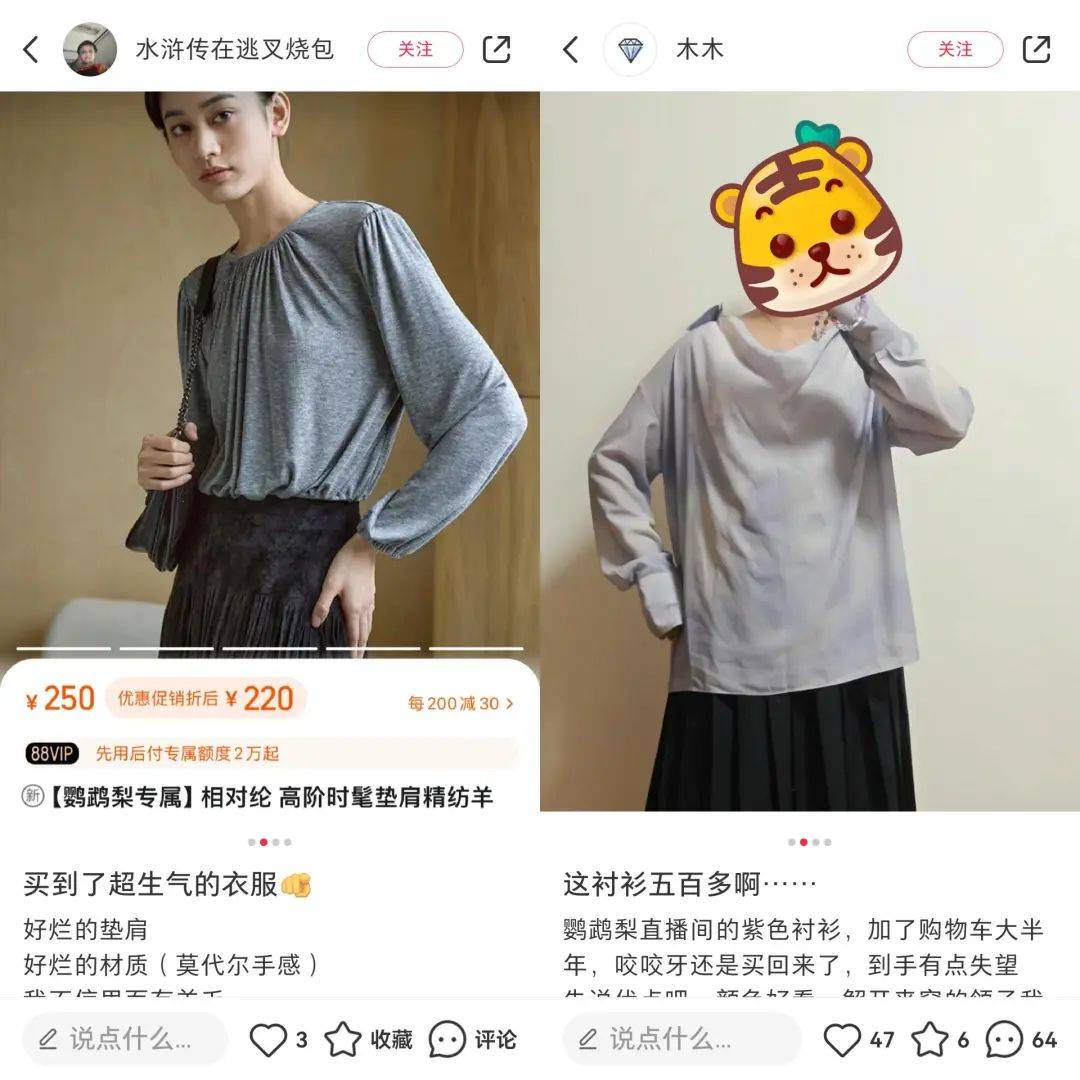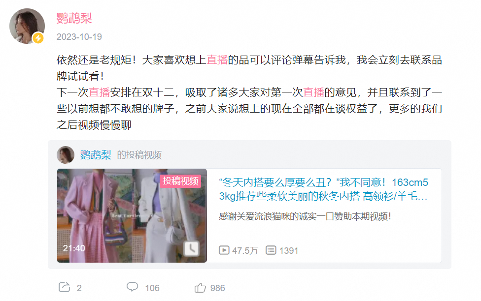 文|王崭 编辑|斯问 来源 | 电商在线 “B站身材最好的女人”,带货能力有多强? 在消费降级,直播电商平台混战之际,B站一位名叫“鹦鹉梨”的UP主,却在“闷声发大财”。哔哩哔哩官方的微信公众号“哔哩哔哩商业动态”显示,鹦鹉梨单场直播带货GMV达到5000万元以上。 5000万GMV,在淘宝或抖音可能不算什么,但在B站可谓一骑绝尘,直接和小红书章小蕙的首播带货成绩持平。 ![]() 鹦鹉梨 观看整场直播,没有低价叫卖,也没有引流商品,但作为“B站身材最好的女人”,鹦鹉梨本身就足够有话题性。 视频中的鹦鹉梨,连跳四小时钢管舞,大谈“漫画胸”和性感穿搭,鲜明的个性吸引了众多女性粉丝。84—64—97的沙漏型身材更是鹦鹉梨粉丝进去直播间的一大“招牌”,让众多观看者一起“舔屏”,有时甚至还没介绍完商品,直播间链接就显示已经售罄。 B站直播带货,鹦鹉梨不是第一个入局的头部UP主,前有“大祥哥来了”“盗月社食遇记”,后有“宝剑嫂”“大漠叔叔”,只是这些头部UP主的带货成绩都不及鹦鹉梨。就像小红书拿出董洁和章小蕙一样,补票上直播电商这趟车的B站,同样急需一个自己的标杆案例。 现在,单场卖出5000万的鹦鹉梨,是否能成为B站的“章小蕙”? 01.B站“带货一姐”,一场带货5000万? “观众朋友们,欢迎来到我的直播间,你们的网络试衣间!”2023年12月10日下午,鹦鹉梨穿着一件衬衫和百褶裙在B站登场。 ![]() 这场“双十二”期间的直播预热了近一个半月,正式开播时采用了竖屏直播的方式。直播间和她日常拍摄的场景并不同,整体走复古路线,右侧还放着一个尺码数据的PVC板供直播间用户参考。 直播间除了鹦鹉梨本人,还有两位模特作为助播,试穿同款服饰给观众参考,主要负责讲解商品的是鹦鹉梨和模特布林。 作为“B站身材最好的女人”,鹦鹉梨不算多高,却靠沙漏型身材直接把直播间变成了淘宝“卖家秀”,优秀的穿着效果也让众多粉丝直接下单“买买买”。 比起其他直播间的催单话术,鹦鹉梨的直播间更多时候都在介绍商品的特色和优势,话术多了几分“B站特色”,夹杂着一些“二次元”词汇。 在介绍letm圈圈羊毛呢大衣时,她表示:“看这个红像什么,彷佛在看你最喜欢的纸片人脸红!朋友们,真的是一个非常非常有情感的红色!”轮到相对纶羊毛衫时,她又表示:“贴身穿的话就像没穿衣服,就跟你遨游在这个世界里面幸福地光着膀子一样。” 整场直播长达8个半小时,涉及210多个商品,全部来自淘宝,以女装服饰、配饰和鞋包为主,主要是有一定设计风格的淘品牌以及海外品牌,客单价集中在150—2000元。 直播间最明显的,就是没有一分钱以及9.9元低价引流商品,最贵的是3306元的Fabrique毛呢大衣,最低的是16.8元的Every Minute挂饰。 ![]() 不做低价引流款,可能是受B站观众氛围的影响。 2022年,彼时在B站有着472万粉丝头部UP主“大祥哥来了”开启直播带货首秀,直播间的9块9秒杀和爆款直降引发了不少争议,催单、“把价格打下来”的短视频直播带货风格,也让众多B站网友直言是“恰烂钱”。 鹦鹉梨的操作,反而让不少粉丝觉得“靠谱”,但不和谐的声音同样出现在直播间,“感觉穿搭很挑人”“搭配不日常”等弹幕夹杂在一片抢购声中。 作为直播带货新手的鹦鹉梨,对于直播带货的节奏把握也不够准确。 直播间多次出现失误,观众点击进入直播购物链接发现没改价,主播喊出“上链接”时链接却没弹出,前期给出的直播商品时间表也和实际直播时的讲解对不上,产品优惠机制、购买价格等内容也出现了错误,让直播间观众直言“购物体验太差”。 ![]() 粉丝截图中,直播间价格(右)仅优惠了2—4元 而作为话语权并不算太高的带货主播,鹦鹉梨的直播间优惠力度也不算大。有粉丝发现自己在电商平台加购的商品凑单后比直播间便宜,还有粉丝发现直播间只是便宜了几块钱,“没必要专门蹲直播等讲解”。 B站官方表示鹦鹉梨单场直播GMV突破5000万,也没有透露具体是哪一场直播,或者具体的直播带货金额等数据。 ![]() B站官方招商信息中,显示鹦鹉梨单场GMV5000万+ 通过查询B站官方花火平台可知,鹦鹉梨近90日的直播电商GMV为1771.1万元——这一数据已经包括了鹦鹉梨“双十二”期间的两场直播带货。 02.“B站身材最好的女人” 如果不关注B站的时尚区,那多半会对“鹦鹉梨”这个名字感到陌生。 作为2023年B站“百大UP主”之一的鹦鹉梨,靠着沙漏形身材和众多穿搭视频被调侃是“B站身材最好的女人”,坐拥近195万粉丝,其近期发布的10条视频中有6条视频播放量突破了100万。 ![]() 鹦鹉梨最早的视频是美妆测评 点进鹦鹉梨的B站主页,可以发现她早期并没有确定风格和赛道。 最早的一条视频发布于2017年9月,主题是测评美妆产品,播放量只有3万,后续发布的也多是关于美妆的视频内容,直到2019年3月才发出了第一条穿搭视频。 这时的鹦鹉梨,并没有把穿搭和服装测评作为重点,后续更新的内容中,美妆、穿搭和健身内容混杂在一起,直到2020年2月才逐渐专注穿搭赛道,又在2021年3月靠着一条播放量达到544万次的“测评正品和山寨网红裙”的视频,在B站实现破圈。 ![]() 鹦鹉梨最早出圈的穿搭视频 观看鹦鹉梨的穿搭视频和弹幕,很容易发现她风格。 色彩鲜艳、大胆和跳脱是她最明显的风格,大红色、翠绿色和橙色等色彩在她的视频中并不少见,视频还采用了“去头”模式,只放出