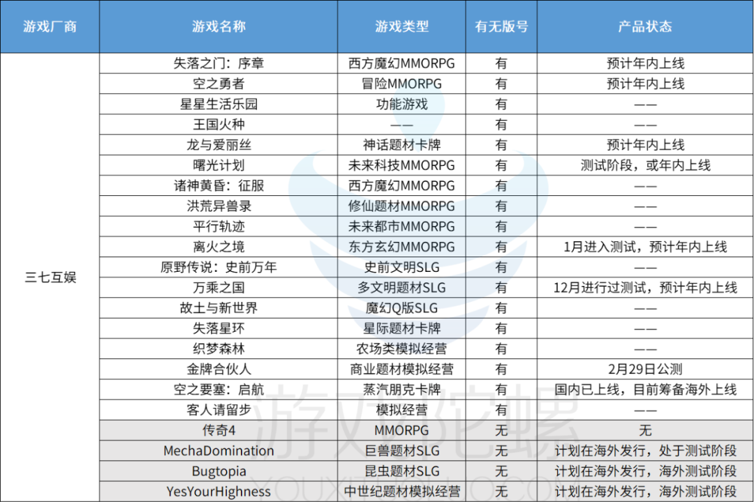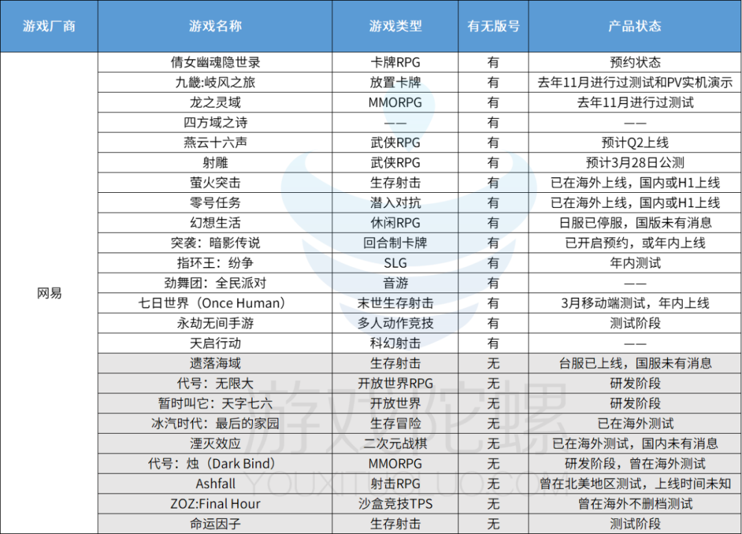 来源:游戏陀螺 今年游戏圈比往年更热闹。 一来,版号发放频次和数量正在增加;二来,厂商新品测试和上线的速度加快。特别是近一个月,多款新游宣告定档或测试。 例如,多益网络的《幻唐志:洪荒现世》定档3月7日;完美世界《女神异闻录:夜幕魅影》、网易《射雕》定档3月28日;西山居《剑网3:无界》官宣4月25日推出;腾讯《创造吧!我们的星球》预计4月第二季上线…… 此外,《物华弥新》《地下城与勇士:起源》《永劫无间手游》《三角洲行动》《七日世界》《鸣潮》等新游纷纷透露内测时间。其中,《物华弥新》与《地下城与勇士:起源》都已在近期开启小规模测试。 为了摸清各大游戏厂商的新游情况,游戏陀螺根据各家财报透露的新品,以及可公开检索的具备一定知名度的产品信息,整理了一份45家厂商超280款新游表格。一起来看看,头部、肩部厂商还有多少“余粮”?这些产品背后蕴藏着哪些新趋势?(注:文末附图表,部分厂商“代号”产品未入列,手工统计难免错漏,仅供参考!) 逾190款获得版号,RPG、SLG、卡牌大行其道 与去年类似,今年大抵也是新游暴增、大作云集的一年。在陀螺君整理的283款产品储备中,有189款已获得版号。其中,超70款定档或预计在年内上线。 版号获取上,腾讯、三七互娱、网易都是“大赢家”,分别获得21款、18款、15款版号。恺英网络、雷霆互动、心动、完美世界、4399等厂商也多有所获。 ![]() 细分赛道中,RPG(包括MMORPG与ARPG)竞争最激烈,共有69款产品。其次是卡牌、SLG与模拟经营,分别有35款、28款、19款。此外,开放世界、二次元、国风武侠、射击FPS、IP改编都是大热的新游关键词。 ![]() 值得注意的是,这些热门赛道“内卷”程度严重,头部产品虹吸效应显著。 例如,《绝区零》《鸣潮》《心动小镇》《归龙潮》《女神异闻录:夜幕魅影》《燕云十六声》等游戏未上线就已积累了一大波人气,仅TapTap平台预约人数均破百万,关注度远超一般新品。还有一些仅靠曝光物料就迎来阵阵欢呼声,如《黑神话:悟空》。 ![]() 进口游戏《地下城与勇士:起源》《刺客信条:侠隐》《决胜巅峰》《炽焰天穹》等,要么有知名IP支撑,拥有庞大粉丝群体;要么已在海外市场得到验证并取得了优异成绩,具备一定的先手优势。 ![]() 因此,在赛道竞逐上,游戏厂商要思考的是在立项初避开争夺,还是在热门赛道中选择更细分的切入点,如SLG赛道走买量,二次元赛道做叙事RPG,卡牌赛道做小游戏…… 当然,最能摆脱头部产品虹吸效应的还是开辟新的赛道或者做品类融合,如主打女性向的叠纸做潜行+RTT游戏《逆光潜入》;IGG探索RPG+SLG+卡牌融合;壳木游戏研发融合模拟经营玩法的SLG新游。不过,这本身是要承担一定的风险。 ![]() 腾讯、网易“粮仓”充盈,恺英、中手游强IP赋能 现有的统计资料中,腾讯、网易、三七互娱、恺英网络的“粮仓”最充盈,储备新品均超过20款。雷霆互动、心动、完美世界也有逾10款“储备粮”。 腾讯是目前“粮仓”最充盈的一家厂商,共有27款,包括自研和合作代理。其中超7成拿到版号并进入测试或上线阶段。 ![]() 在腾讯产品列表中,《地下城与勇士:起源(DNF手游)》是玩家等待时间最长,期待值猛增的游戏。该游戏曾在2020年宣告公测后因各种客观原因推迟。如今,经过长时间地迭代调优,DNF手游的成熟度很高。有观点认为其将在业内掀起狂潮,对同档期产品造成较大影响。不过,最终成绩如何还得再等一等,目前游戏已在加速测试,或年内上线。 除了DNF手游,腾讯旗下还有《极品飞车:集结》《大航海时代:海上霸主》《刺客信条:侠隐》多款IP游戏将在年内陆续推出。IP改编仍是腾讯的重点方向之一。 目前,腾讯还有《王者荣耀世界》《异人之下》《代号:破晓》《洛克王国手游》等多款游戏正在等待版号。其中,腾讯旗下头号IP“王者荣耀”衍生新游《王者荣耀世界》据说坐拥了腾讯海量研发资源支持,非常重磅。 ![]() 网易方面,约24款“储备粮”。《射雕》《零号任务》《萤火突击》《燕云十六声》《七日世界》《永劫无间手游》均已获得版号,有望在年内上线。其中主打“开放世界”特色的武侠RPG游戏《射雕》定档3月28日,这是一款由战魂工作室 600 人团队研发 6 年,投入成本超 10 亿,竞争力不一般。 ![]() 网易其他已获版号待发行的细分产品有《天启行动》《幻想生活》《突袭:暗影传说》《指环王:纷争》《九畿:岐风之旅》等。 其中,《指环王:纷争》是一款出口转内销游戏,已在海外获得不错的成绩;《天启行动》则是网易自研的全新原创IP东方科幻射击游戏,于日前因获版号而被曝光。武侠MMO、射击是网易重金加注的赛道。 除此之外,网易旗下尚未取得版号但已经获得大量关注的新游有《无限大》和《暂时叫它:天字七六》。这两款皆属于二次元产品,目前都在研发阶段。从官方放出的PV及业内人透露的信息来看,这两款产品品质、内容在线,走红几率高。 ![]() 三七互娱“储备粮”数量与网易不分伯仲,并且有好些“代号”产品未入列。《金牌合伙人》《失落之门:序章》《空之勇者》《龙与爱丽丝》《曙光计划》都有望今年内上线。MMO游戏《空之勇者》已在日本上线,国内暂还没有进一步消息。 其余自研游戏多面向全球市场并且有不少正在海外进行测试,如《MechaDomination》《Bugtopia》《YesYourHighness》等。从产品矩阵上看,三七互