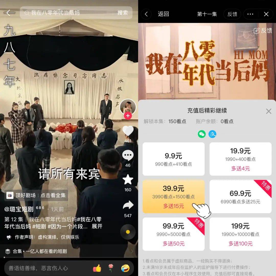 来源|电商在线 文|刘奕琦 编辑|斯问 付费短剧在2024年春节档,迎来了井喷式爆发。 “原来觉得土,看了以后才发现到底有多上头”。今年春节,短剧成了街头巷尾、田间地头里的谈资。在城里忙活了一年,好不容易有了空闲时间的年轻人,和在乡里生活了大半辈子的七大姑八大姨们找到了共同的话题。 他们一边嗑着瓜子,一边倚着门框精精有味地讨论着“这集男主女主到底亲上没”“讨人厌的小姑子后来怎么样了”“昨天男主怼女主养父母那段,看着太痛快了”等相关剧情。 预估数据显示,今年过年短剧的最高日消耗破亿,总票房高达8亿元。快手平台发布数据显示,春节期间,短剧播放量同比上涨41%。《授她以柄》《大过年的》《我在八零后当后妈》等热剧频频登上微博热搜。 ![]() 其中,《我在八零后当后妈》凭借着独特的故事背景和讨喜的男女主人设,成为不少人一头栽入短剧的入坑之作。据传,该剧单日最高充值达到2000万元,因为给这部剧充值的人太多,还一度出现服务器宕机的情况。 网传,该剧背后的制作出品方是“毒鸡汤鼻祖”咪蒙(马凌)。她曾成名于流量,也受制于流量,如今又再一次扎入了新的流量场。《我在八零后当后妈》上线前,咪蒙团队还相继推出了《黑莲花上位手册》《腹黑女佣》《李特助如此多娇》等多部作品。 ![]() 往年,电视台的晚会、影视公司的电影、电视剧填充了大众在春节期间的大半闲暇时间。如今,短剧的加入正逐渐打破这一格局,今年的开年红,也让许多人嗅到了商业的气息。 “后妈剧”,开播即爆火 和大部分短剧一样,《我在八零后当后妈》节奏快、剧情爽。一共82集,平均一集约2分钟,全长相当于一部电影。 为了吸引用户,平台通常会设置10集免费观看。在前面集数的吸引下,对剧情感兴趣的用户就会忍不住下单购买。以“网剧吧”为例《我在八零后当后妈》,一集剧情需要150看点,最低充值9.9元,获得1400看点,大约可以看十集,充值越多,送的看点数越多。不同平台的价格各不相同,看完这部剧,花费的价格在9.9元-99元不等。 ![]() 这部剧有多火,数据上可窥一斑。2月12日,《我在八零后当后妈》正式上线,上线当天就冲到了DateEye短剧热力榜第二名,2月14日又攀升至第一名。截至发稿前,抖音平台上关于这部剧的讨论数据已经超过6亿,女主腾泽文的抖音粉丝人数涨到30万。 和大部分短剧一样,戳中观众们的“爽点”是该剧受到关注和讨论的关键,剧情也踩中了穿越、复古、反转、甜宠等多个爆款元素。但不得不承认,在选题、背景、服化道、人设、剧情等多个方面,《我在八零后当后妈》的确与市面上大部分爽剧拉开错位竞争的差距。 市面上短剧的背景大多以“现代豪门剧”、“古代宫斗剧”为主,而这部剧则将场景设为“80年代的农村”。在大屁股彩电、红色热水壶、搪瓷盆等极具年代感的道具的加持下,复古的氛围扑面而来。 ![]() 女主的人设也是推动剧情的一大亮点,虽然自称“脆皮大学生”,但她全程更像一个“呛口小辣椒”,爽句连连,将奇葩亲戚们怼得哑口无言。在亲戚讽刺她“城里人就这素质”时,她大门一摔,抱拳回怼“素质不详,遇强则强”。 “有爽剧的爽点,主演演技也比较流畅,不像别的短剧一样容易让人出戏”,剧粉在社交平台上这样评价道。据澎湃新闻报道,该剧爆火后,演员的日薪涨到了原来的3—5倍。 背后站着“毒鸡汤鼻祖”咪蒙 《我在八零后当后妈》的爆火,引发了外界对于该剧的种种猜测。 短剧从业者王云霄曾在小红书平台爆料,《我在八零后当后妈》的拍摄时间仅为10天,后期就进去了8万元。不少行业人士,对于“投入8万”这个数据的真实性表达了质疑。不过,王云霄所表达的“8万”应该是剪辑相关的后期制作费用,而并非所有投入。 爆剧的背后,我们也看到了一个熟悉的身影。娱乐资本论报道:据业内人士透露,《我在八零年代当后妈》,和1月16日上线的《裴总每天都想父凭子贵》,背后都是短剧厂牌听花岛。而听花岛的背后实控人是咪蒙。 ![]() 提到咪蒙,很多对她的第一印象就是“毒鸡汤鼻祖”。公众号时代里,她曾靠着极具夸张的标题,以及贩卖焦虑和引起对立,站在流量的金字塔顶端,五年前,因为一篇《一个出身寒门的状元之死》,她结束了自媒体生涯。 从文字到视频,咪蒙的短剧之路早就已经拉开了帷幕。 去年11月16日,一部付费古装宫斗短剧《黑莲花上位手册》在微信、抖音、快手上线,并很快成为了爆款。这部剧的出品方银色大地,其法人及执行董事正是咪蒙深度绑定的合作伙伴张静思,而银色大地此前公开使用的邮箱前缀,也和咪蒙的“mm_hr”相同。 两个爆剧之间,我们也同样能看到不少相似之处。比如,《黑莲花上位手册》一样和《我在八零后当后妈》均改编于网文小说。相较于市面上三、五天写一本的批量短剧剧本,内容上先天更为扎实。 相较于校园小清新,咪蒙更偏好于女频内容和具有强烈人物反差的角色。比如“嫁给养猪厂帅哥的女大学生”、“扮猪吃老虎去复仇的二小姐”。内容上也会设置更多的冲突性,并不断放大,对立角色通常从一开始的趾高气昂,到最后无奈吃瘪。女主一次次回击,也一次次戳中了大众们的爽点。 而撇开剧情结构本身,投流和宣发也是《我在八零后当后妈》能够出圈爆火的关键因素。“又被我找到一部良心剧,停不下来”,小红书、微博、