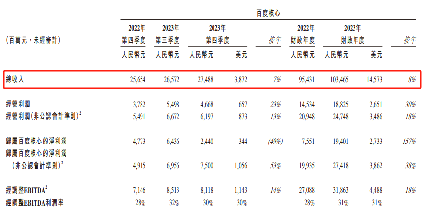 来源 | 港股研究社 作者丨土耳其热气球 AI正“当红”,而百度也迎来了属于自己的丰收季。 近日,百度集团公布了2023年四季度及全年的财务报告。财报数据显示,百度集团2023年实现总收入1345.98亿元,同比增长9%;归属百度的净利润(非公认会计准则)28.75亿元,同比增长39%。 此时,拉长时间线来看,我们会发现,百度集团总收入于2023年首次突破1300亿元大关,创下历史新高。探其原委,百度究竟是如何做到的? 23年净赚287亿 整体表现正如市场预期 财报数据显示,百度集团核心总收入达1034.65亿元,同比增长8%;归属百度的净利润(非公认会计准则)274.18亿元,同比增长38%。 ![]() 花旗研究指出,百度2023年第四季总收入按年增长6%,整体符合市场预期,其中百度核心业务营收按年计算增长达7%,主要来自于核心广告收入增长6.4%及云业务收入恢复增长11%的推动。 仔细来看,百度核心业务中广告收入增长为6.4%,仅符合其引导和调低后的预期5-6%,似乎不尽如人意。而广告业务收入波动的背后,受多重因素所牵动。 一方面,百度自身广告业务渠道优势逐渐被新兴社媒侵蚀。2023年四季度及全年,市场仍以电商广告和短视频广告居多,而百度相比其他同行,在广告类型上并不占优势。 从媒体平台类型收入结构看,CTR媒介智讯数据显示,2023年电商平台广告收入规模达2070.06亿元,稳坐互联网广告市场头把交椅。 短视频平台的广告收入紧随其后。市场规模占比上,电商平台占36.1%,短视频平台占18.5%,两者瓜分了互联网广告市场规模的半壁江山。 而百度擅长的医疗、旅游等线下广告板块则处于相对淡季。因此,百度处于“以己之短攻彼之长”阶段,所以未超出预期也属于情理之中。 另一方面,外部环境也并不利好在线广告。在经历了艰难的2022年后,线下消费率先被激活,线上零售增长缓慢,线上广告行业也因此陷入阶段性疲软。 “内忧外患”之下,百度依旧维持5%以上的增长,足见其根基深厚。而稳定增长背后的依仗,首先是庞大的用户量。四季度,手机百度APP的月度用户数环比增加400万,达到6.67亿,持续增长的用户基数给百度营造了良好的规模效应。 其次则源于百度的搜索流量生态本身,其用户粘性和时长处于稳中求进的趋势。Statcounter最新数据显示,截至2023年12月,中国搜索引擎市场份额排名前第一毫无疑问仍然是百度,占比66.52%,第二是bing,占比13.32%,360搜索(好搜)占比6.43%。 此次业绩增长背后还有另一“推手”——云业务。财报数据显示,2023年Q1,百度智能云首次实现盈利,收入同比增长8%至42亿元;Q2百度智能云持续盈利,收入同比增长5%至45亿元;时至Q4百度智能云总收入猛增至84亿元。 对此,百度创始人李彦宏在财报电话会上表示,第四季度AI大模型为云业务带来的增量收入已经达到6.56亿元人民币,预计2024全年或将增长至数十亿元人民币。来自外部客户的模型推理相关收入也显著增加,虽然目前模型推理这部分收入仍然较小,但相信将成为收入长期增长的重要推动力。 他同时表示,除了与AI相关的增量机会,GenAI和基础模型也为传统云业务带来了新的机遇,百度智能云正继续赢得基于CPU的云客户和项目。 因此,AI能否带来“可观”增量值得关注。海外的AI领域巨头Google和Meta都已或多或少的尝到AI对广告转化效率提升等板块带来的甜头,因此百度接下来的“增长速度”能否承接市场较高的期待非常关键。 百度的AI还有多大想象力? 在移动互联网时代,百度作为老牌互联网巨头似乎已经错过先机。但在2023年,AI时代的开启让百度站在了新赛道的前排。 “重压”之下的广告市场,百度“屹立不倒”。很显然这是生成式AI正在重构百度。百度通过文心大模型,打通了品牌营销的全链路,企业的内容生产和广告投放效率显著提高。 而具体的业绩表现,合并报表口径后,四季度AI给智能云业务带来的增量收入约占4.8%左右。面对这一增量,再加上“率先实现盈利且稳定增长”的云业务,创始人展望的“数十亿元”目标似乎在变得触手可及。 那么,百度能否“履约”? 今年2月,OpenAI发布文生视频模型Sora后瞬间刷屏。实际上,AI“爆改”已经在各个行业上演。 百度最早的“立身之本”——搜索领域也成为被“爆改”的一员。2023年10月,百度将旗下的简单搜索升级为AI互动式搜索引擎,在搜索页面内置文心一言大模型技术,实现Chat AI对话功能。 从传统搜索引擎行业的行业渗透率来看,百度搜索在全端位居行业第一且领先优势巨大。 从PC端行业渗透率来看,百度搜索行业渗透率达64.1%,同样稳居搜索行业第一。 ![]() 在漫长的行业发展史中,百度成功守住阵地。不仅超越了谷歌等海外搜索引擎,也抵挡住了360、搜狗等国内玩家的攻击。当然也只有拥有绝对优势,百度才有可能一步步靠近目标。 如此来看,百度的“树干”已经十分结实,那么向外生长的“树枝”呢? 一方面,大模型逐渐成为百度To B服务用户增长、利润增长的推手。 作为百度一切AI服务“基石”的文心大模型,其推理成本目前已降低至去年3月版本的1%。而推理成本的降低和功能的丰富、易用性的提高,将促使越来越多的用户和企业开始使用文心大模型。数据显示,截至2023年12月底,文心一言用户规模已经超过1亿,目前文心大模型的调用量也位居国内首位。 这意味着,过去被中小微企业视为成本很高、门槛却不低的人工智能、云计算服务,也能因为文心大模型大高速发展