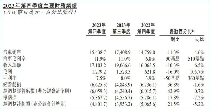 来源/华尔街科技眼 文/陈昊 编辑/吴妍 时间拉回至2023年3月1日,当时在2022年的财报电话会议上,蔚来CEO李斌曾公开表示,公司希望在2023年第四季度实现盈亏平衡,2024年实现全年盈利。 但李斌蔚来的希望落空。 ![]() 一年亏掉200亿 3月5日,蔚来发布2023年第四季度及全年财报。先说一些相对正面的数据,2023年蔚来总营收556.179亿元,同比增长12.9%,再创历史新高;汽车销售额492.573亿元,同比增长8.2%。 ![]() 相比之下,财报当中另一些数据似乎更引人关注。 蔚来去年共交付新车160038辆,同比增长30.7%,但这一数据的增速已经是连续3年放缓了。结合同年183.507亿元的经调整净亏损,蔚来平均每卖出一辆车就要亏11.47万元。与此同时,蔚来新车的销售成本也水涨船高,达到525.661亿元,同比增长19.1%;汽车毛利率9.5%,连续第二年下滑,还不到2021年的一半(20.1%)。 蔚来去年全年毛利率5.5%,同比下降4.9个百分点,明显低于李斌去年定下的18%~20%的毛利率目标。但李斌表示:“蔚来品牌全年毛利率会达到15%~18%,长远看,我们对毛利率到20%有信心。” 诸多因素的叠加让蔚来继续巨额亏损。财报显示,蔚来2023年全年净亏损207.2亿元,同比增幅达到43.5%,比去年又多亏了将近60亿元。 李斌在2016年时曾表示造车的门槛是200亿,那么也就是说,单单去年一年,蔚来就亏出了一条“门槛线”。而在过去仅仅5年半的时间里,蔚来的累计亏损已经高达700亿元。 比亏钱更可怕的,是蔚来的余粮也不多了。 ![]() 截至2023年年底,蔚来持有的现金及现金等价物为573亿元,较上一年增加151亿元。但如果扣除297.7亿元的应付贸易款和票据,以及98.2亿元的供应商欠款,蔚来的现金储备也只剩170多亿。如果今年不再拉几个中东土豪入股,蔚来可能真的就要把家底亏完了。 研发支出下不去,新车交付上不来 巨额的研发费用显然是导致蔚来亏损的主要原因之一。财报显示,蔚来去年的研发费用为134.314亿元,同比增长23.9%,平均每天烧掉368万元,而这也已经是他们连续两年研发支出破百亿了。如果从2016年开始算,蔚来在研发上的投入累计已超过438亿元。 蔚来在研发上的高支出在短时间内也并不会有所改观。官方表示,2024年公司的季度研发支出仍然会保持在30亿元的水平,也就是全年研发支出将在120亿元左右。换句话说,这个支出上的大窟窿今年并不会被堵上。 在研发光速烧钱的同时,蔚来的新车交付量却没上去。 ![]() 在2023年年初,蔚来定下的全年销售目标是25万辆,只有达到这个销量,公司才能在年底实现盈亏平衡的目标。但是新能源汽车市场去年的竞争之惨烈是有目共睹的。上半年交付量的大幅缩水让曾经豪言“蔚来坚决不会降价”的李斌服了软,在6月份将全系车型的起售价下调3万元。 但降价带来的销量增长并没有达到预期。结果就是蔚来去年全年的新车交付量刚刚超过16万辆,只完成了原定目标的六成多一点。而且加入价格战之后,蔚来的汽车毛利率也有所下滑。 根据财报中的业绩展望,蔚来在今年第一季度的汽车交付量预计在3.1万~3.3万辆之间,但数据显示他们前两个月的交付量分别只有8132辆和10055辆。李斌对此表示,他相信从3月开始销量会越来越好,有信心达到两万辆的月销量。 但即便蔚来接下来能够实现两万辆的月销量,他们今年全年的交付量也将只有20万出头,能不能实现盈亏平衡都让人捏一把汗。 蔚来的救命稻草在哪里 从去年的销售情况来看,蔚来汽车在价格战中的表现也并没有预期中那么好。而在今年,在价格战中冲锋陷阵的重任将会交到子品牌阿尔卑斯手上。 李斌在电话会议中透露,阿尔卑斯品牌将于今年第二季度发布,首款车型第三季度发布,第四季度交付。这个品牌销售网络独立,享受蔚来部分的售后体系,且与蔚来共用换电网络。 据悉,阿尔卑斯首款车型直接对标特斯拉Model Y,成本比后者低10%左右,且这个子品牌追求销量的优先级会高于毛利率。参考Model Y 25.89万元的起售价,阿尔卑斯这款车型的起售价可能会下探到20万元左右。 ![]() 虽然李斌对阿尔卑斯的前景相当看好,称其单车型就能达到4万~5万的月销量,但对于一家企业而言,只有在本身已经发展成熟,并且拥有较高市场认知度和品牌影响力之后,才能算作是推出子品牌的理想时机。Model Y去年在中国市场45万辆的销量或许令人艳羡,但特斯拉和蔚来之间,恐怕还隔着好几个理想。 换电网络是蔚来引以为傲的另一个“杀手锏”,但这项重资产投入在营收层面至今仍未带来回报。 ![]() 财报显示,蔚来2023年“其他销售”(以电力解决方案为主体)收入63.607亿元,成本79.786亿元,算下来一年亏了18个亿。其中第三季度亏损3.94亿元,第四季度亏损5.59亿元。从中我们可以看出,即便是在蔚来去年6月份将换电权益从车辆价格中剥离、对其进行收费之后,这项服务仍然没能扭转常年亏损的颓势。 而换电服务亏损加大,可能和蔚来扩展“朋友圈”有关。 去年年底,蔚来先后与长安汽车、吉利控股达成换电战略合作;今年开年又和江淮汽车、奇瑞汽车签署《换电战略合作框架协议》。很显然,蔚来想通过此举来分摊换电网络的建设和运营成本,推动这项服务实现盈利。 ![]() 合作带来的换电需求增加,自然也就意味着蔚来需要扩大换电服务的覆盖面,而这将会是一笔不小的投入。 根据业内人士分析,蔚来第一代换电站建设成本超过300万元,其后三代换电站的成本在150万~200万之间,