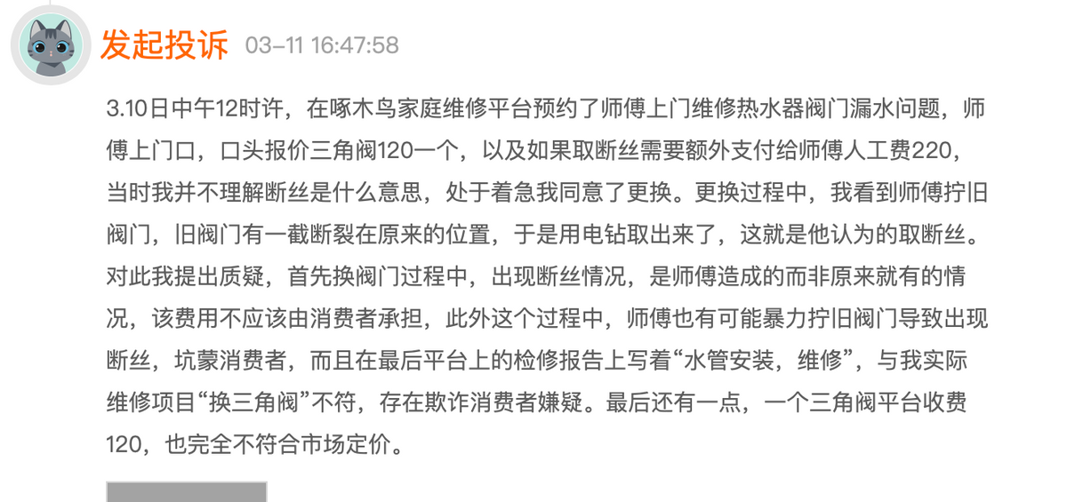文:互联网江湖 作者:刘致呈 当下,消费成为经济增长的重要推动力,如何让人们愿意消费、敢于消费,安心消费是激发消费活力,促进经济增长的关键。 2024全国消协组织消费维权年主题为“激发消费活力”。一年一度的“315消费者权益日”即将到来,我们也聚焦消费热点事件,带来“315消费观察”系列选题。 今天我们来聚焦家庭3C维修、家电维修服务行业。 3C维修、家电维修,一直以来都是个痛点颇多的“柠檬市场”,这个消费市场,不仅关系每个家庭,也关系到人民的生活体验的幸福感。家庭维修难,家庭维修贵的问题如何解决?第三方维修平台的价格、服务质量如何保障? 这些消费难题,亟待解决。 家庭维修的“价格刺客”:真高价、难省心 自前几届315晚会曝光家电维修乱象之后,家庭维修行业乱象仍存。 在第三方消费者服务平台黑猫投诉上搜索啄木鸟家庭,有相关的2700多条投诉,其中不乏“高价、乱收费”等投诉。 ![]() 2月14日,有平台用户投诉:“电视维修和师傅检测后沟通确认换个控制面板小电容,半个小时搞定,没有换任何别的东西,没有维修明细,统称服务费,收费500元太不合理,要求退还部分费用。” ![]() 2月20日,有用户投诉称,啄木鸟乱收费、乱定价,换个12块钱水龙头收费280元…… 一方面,用户投诉不断,另一方面,“正规家庭维修,就找啄木鸟”的广告语,遍布地铁、电梯。 根据此前啄木鸟维修公布的招股书显示。2021年至2022年及2023年前三季度,啄木鸟维修的销售及营销开支分别为1.78亿元、2.91亿元及3.18亿元。 在营销上花这么多钱,自然就需要更多的订单以及客单价来支撑。 从已经公布的招股书来看,同期,啄木鸟维修的客单价其实并不低。 招股书显示,2021年,木鸟维修平台每单平均交易额为231.8元,2023年三季度,平台每单平均交易额涨到了254.4元。 数据背后,广告费用不少,服务费用不低,也许是啄木鸟维修“感情不修啥都修”的口号背后的另一面侧写。 客单价升高,对平台来说意味着营收盘子扩大,但对于消费者来说可能意味着更高的家庭维修成本。 从第三方投诉来看,在维修服务的过程中,不少消费者都认为维修师傅会“小病大修”,以各种名目增加服务项目提高收费。 ![]() 3月11日,有用户投诉称,在啄木鸟平台预约师傅上门维修,热水器阀门漏水问题,师傅上门,口头报价三角阀120一个,以及如果取断丝需要额外支付给师傅人工费220。在维修服务后,消费者发现,实际维修项目与检修报告不符,认为存在平台欺诈消费者嫌疑。 客观来看,第三方消费平台用户投诉内容真实性有待考证,但至少从笔者自身真实的经历来看,“价格高,不省心”,似乎也是当今维修平台服务的真实写照。 2023年11月29日,笔者家中洗衣机故障,于是在家庭维修平台啄木鸟下单,经维修后支付维修费用100元,一个月后,洗衣机再次故障,平台派了另一位师傅维修,最终检测结果是主板故障,维修费用559元。 ![]() (笔者自己的下单截图) 事情到这还没结束。在更换主板约一个月之后,洗衣机再次发生故障,联系平台检测后又被告知是电机故障,维修费用会更高,建议换新…… 站在消费者的视角来看,多次维修,花了大几百块,已经足够买一台小型洗衣机的钱,而多次维修后,花了更多的钱,却带来的是更差的体验,既没能省钱也没能省心。 屠龙勇士终成“恶龙”?家电维修难题待解 啄木鸟维修是中国最大的家庭维修平台,根据灼识咨询数据,去年前三季度啄木鸟平台有逾700万单交易,合计总交易额17.9亿元。 天眼查APP显示,啄木鸟家电2014年成立,到2023年已经在准备上市,Pre-IPO轮融资数亿人民币。 ![]() 啄木鸟维修创始人王国伟的初衷,就是希望改变家庭维修行业“散乱差”的生态。让消费者把钱花得更明白,维修师傅挣钱更有方。 可从现实来看,“价格乱、服务乱”的情况仍然存在,家电维修行业的“屠龙者”恐终成“恶龙”。 从名字来看,啄木鸟是益虫, 整个家庭维修行业价格贵、乱加价问题的存在,使得客观上平台成了巧立名目乱收费的受益者。 毕竟客单价和营收做上去了,财务数据就好看了,平台也能在资本市场获得相对不错的估值,而消费者却成了高价低质维修服务消费的受害者。 平台作为交易的第三方,是撮合者也是秩序的维护者,而在秩序维护上,家电维修平台做得还远远不够。 一个是平台对维修师傅并没有真正意义上的强约束关系。 啄木鸟根据公布的招股书,平台工程师(维修师傅)并非啄木鸟的雇员、调度雇员或分包商。也就是说,维修师傅与啄木鸟维修之间并没有雇佣关系。 那怎么保证服务质量呢?啄木鸟的方式是以“上门率、成功率、客单价”等指标来约束,不达标就罚款。此外,维修师傅还需要给平台交服务质量保证金。 招股书显示,到2023年三季度末,啄木鸟平台的质保金结余高达1.05亿元。 理论上,虽然有质保金在,但质保的是服务质量,而以上门率、客单价等考核指标来作为约束,也就不难理解三方平台上“乱收费、小问题大修”此类投诉不断的原因了。 此外,抽成过高带给维修师傅的压力,也可能是导致维修师傅私自增加项目提高价格的原因。 啄木鸟的商业模式,是经典的互联网O2O模式,将有“维修需求的消费者”与“平台注册的维修师”相匹配,平台从中抽成。 这个抽成有多少呢? 根据啄木鸟的招股书,2021年至2022年及2023年前三季度,平台完成的服务订单产生的收入除以总