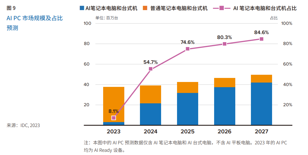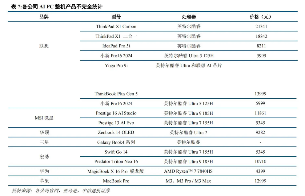 文|刘俊宏 编|王一粟 来源 | 光锥智能 苹果这回终于不“挤牙膏”了,急不可耐地扎入了AIPC的“名利场”。 就在2月28日,苹果CEO库克还在股东大会上宣称:“目前市面上用于人工智能的电脑,没有比Mac更好的”。仅一周过去,苹果在没有预告的前提下,突然发布了新款Macbook Air,并大肆宣扬了新款电脑的AI能力。 ![]() 图片:新款Macbook Air的AI能力宣传 来源:苹果官网 苹果“闪击”AIPC的节奏不可谓不快。不过要论落地的步伐,终究还是慢了一步。 单论目前已经推出的AIPC,有荣耀的MagicBook Pro 16;联想在MWC(世界移动通讯大会)发布的Think Pad T14/T14s第五代、ThinkPad T16第三代等一系列AIPC产品;戴尔在Inspiron 灵越 16 Plus也标注了“满血AIPC”标识。除此之外,微软也将在3月21日发布Surface Pro 10和Surface Laptop 6,并以此向苹果的iPad Pro和MacBook Pro公开叫板。 PC俨然成为继手机之后,AI对智能硬件改造的又一浪潮。 在PC进行AI改造的路线上,PC与手机同为个人智能硬件,底层实现原理较为类似。基本原理都是以大模型端云协同的共识下,加强芯片AI能力实现端侧部署。例如高通在PC端上推出了支持搭载130亿参数大模型的X Elite;英特尔在全新酷睿HX和U系列CPU,增加了核显数量来提高AI性能。 不过,聚焦在具体使用场景中,与AI手机偏向生活和便利的方向不同,AIPC更倾向于创意和生产力。例如微软用Colpilot改造升级了包括画图、视频编辑器、截图和照片等基础功能。联想搭载了向量数据库,让AI利用本地资料做PPT。 “生成式人工智能具有令人难以置信的突破潜力”,或许AI改变一切的潜力正如库克所强调一般。从生活到生产,从工作站到智能穿戴,AI改造全部电子设备的进程已不可阻挡。 我们似乎已经临近第四次科技革命的春天。 PC已经被AI包围了? 在AI改造智能终端的道路上,与手机厂商主导的AI手机不同,AIPC在产业链上汇聚了更多厂商的共识。 率先进军AIPC的,是微软和英特尔两大分别位于软件和芯片的巨头。 2023年9月,英特尔CEO帕特·基辛格在创新大会上认为,AI将通过云与PC紧密协作,进而从根本上改变、重塑和重构PC体验,并高呼称,“我们正迈向AIPC的新时代”。另一边的微软,在Windows 11上内置了Copilot,将AI助手集成到PC系统层级。 ![]() 从时间节点来算,英特尔和微软是AIPC时代的揭幕者。但对于AI植入PC的看法,英特尔和微软显然各有各的算盘。 在英特尔这边,根据创新大会聚焦开发者云平台的规划,不难看出英特尔希望通过AI普及到终端的方式,拉动其近两年不断失利的数据中心及AI业务。根据英特尔2023年报显示,其两大营收支柱之一的数据中心及AI业务营收155亿美元,同比下滑20%。并且,其数据中心业务在整个市场中已经呈现边缘化趋势,市场营收份额已下降至如今的20%区间。 而对于“半控制”了OpenAI微软来说,PC系统内置AI(Copilot),更像是Windows和ChatGPT的整合。在自然语言的交互下,降低用户使用操作系统的难度,顺便推广更新Windows 11。 不过,不论PC产业链上游的玩家(英特尔和微软)最初对AIPC的想法如何,AIPC的落地,随着2024年CES上英伟达、英特尔、AMD围绕AIPC推出多款AI能力增强的芯片,PC整机厂商联想一口气推出10余款AIPC产品的密集节奏下,更多PC整机厂商也披露(或发布)了AIPC产品的落地计划。 其中,除了联想和微软、苹果,单论整机厂商是惠普将在星Book Pro 14上搭载酷睿Ultra 7处理器,用于支持本地200亿参数大语言模型;戴尔在灵越13 pro、14 Plus、16Plus上搭载酷睿Ultra处理器;三星将在Galaxy Book4(搭载酷睿Ultra)上深度集成微软Copilot;宏碁在Swift和Aspire笔记本支持Copilot按键(一键呼出Copilot功能);华硕将推出灵耀14等AIPC。 从PC厂商们的产品规划来看,准备发布(或已发布)的AIPC产品具备两个明显特征。其一是,现阶段披露的产品,大多AI的落地规划并不完整,AI功能主要靠芯片能力(搭载酷睿Ultra)或依赖第三方实现(Copilot);其二是2024年的PC市场将在不同定位和价位上,涌现大量AIPC产品。 ![]() 图片:AIPC将覆盖不同定位和价位 来源:中信建投 PC厂商们在AI能力的缺位,或因PC厂商对AI大模型的投入并未如手机行业“人手一个大模型”般“狂热”。不过,从PC厂商宁可“先拿硬件顶上”也要扎堆推出AIPC的举动上,能够看到PC的AI迭代窗口期可能非常短。 以中国PC市场为界,根据IDC数据显示,处理器集成AI加速引擎的AIPC(包括笔记本电脑和台式机)在2024年便成为市场主流。2027年,AIPC的市场份额预计将达到85%,基本完成对PC市场的渗透。预期的销量解释了,PC厂商为何纷纷将2024年作为推出AIPC产品的重要时刻。 ![]() 图片:AIPC预计渗透率 来源:IDC 或许AIPC的落地节奏,正如去年12月联想集团副总裁、中国首席战略官阿不力克木・阿不力米提所言,“AIPC首先会经历一个AI Ready阶段,芯片架构会率先升级到混合AI架构,并加速AI应用创新;随着个人大模型、个人智能体、AI应用开放生态等的嵌入,AIPC将加速迈入AI On阶段”。当前阶段的AIPC产品落地,暂时处于先推出具备AI能力硬件(AI Ready),等待PC端应用生态和使用场景完全开发(AI On)的阶段。 不过,参考手机行业的AI变革,一味依赖硬件和第三方支持的AI终端会丧失产品差异,表现弱于平均值(例如国行三星Galaxy S24的部分AI功能表现较差)。 AIPC的先行者们,已经开始寻找独属于PC上的AI应用场景了。 AIPC如何设计? 什么是AIPC?位于PC产业链不同生态位玩家的思考不尽相同。 咨询机构IDC认为,“一台具备