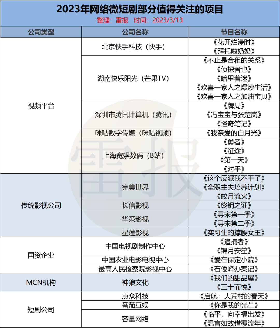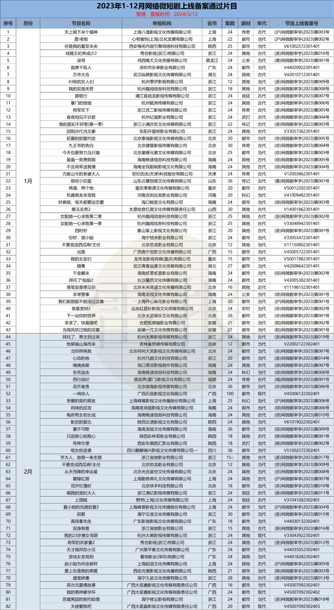 作者:段轻 编辑:努尔哈哈赤 来源:雷报 谈到2023年的大热门赛道,短剧依旧会被频繁提起。尽管在政策监管下,“短剧热”暂时降温,但每部爆款背后的高额收益还是让大众眼红不已。 如今,短剧持续被各大机构、平台看好并争相押注,据艾媒咨询预计,到2024年这一市场的规模将超过500亿元。 不久前,广电总局公布了《2023年12月网剧、网络电影、微短剧、网络动画片“上线备案通过片目”》,2023年全年通过上线备案的网络微短剧片目已经全部公布。 据雷报统计,全年12个月,重点网络影视剧上线备案通过的网络微短剧多达572部。其中,都市题材279部,传奇题材55部,科幻题材25部,青少题材10部,武打题材9部,公安题材9部,农村题材8部,宫廷题材7部,传记题材6部,军事题材3部,司法题材2部,国家安全题材1部,其他题材158部。 从题材上看,都市题材占全年总备案半壁江山,高达49%,其他题材占28%,传奇题材占10%;从年代上看,古代占了总被备案片目数量的29%。 可见,都市剧与古装剧依旧是短剧市场的主流,这是由观众对短剧的偏好决定的。不过,如传记、科幻、军事等小众题材也有备案,短剧的题材创作较为多元化。 ![]() ![]() ![]() ![]() ![]() ![]() ![]() ![]() ![]() 那么,全年通过上线备案的这572部网络微短剧作品中,都有哪些值得关注的公司以及项目?热门IP背后是否还有什么关联的平台? 平台加码,影视公司、国营厂入局,短剧“点石成金”只是童话故事 雷报整理了2023年通过上线备案的微短剧中,部分值得关注的项目以及其涉及的公司。大致可以分为五类公司:视频平台、传统影视公司、国资企业、MCN机构以及头部短剧公司。 ![]() 视频平台方面,由快手直接备案的短剧有2部,分别为《花开烂漫时》以及《拜托啦奶奶》,均属于快手星芒短剧,目前快手站内播放量分别达到了3.1亿以及9.6亿。 其中,《花开烂漫时》由北京市广播电视局指导,以中国传统绒花文化传承为主题;《拜托啦奶奶》则围绕农村留守老人与城市叛逆少女的反差故事展现了人与人之间的情感故事。 芒果TV直接备案的作品有5部,分别为《不止是合租的关系》《侦探者也》《暗里着迷》《欢喜一家人之爆炒生活》《欢喜一家人之加油宝贝》。 其中,最值得一提的“影视剧版剧本杀”短剧《侦探者也》,该作改编自番茄同名小说,是2022年番茄小说与芒果TV大芒计划工作室、最小光圈影业达成战略合作,并于当时就已经开始筹备的五部IP之一。另外四部IP分别是《念念无明2》《渴肤症患者的贴贴指南》《名媛女法医:在高冷探长的心尖起舞》《诱她陷落》。 腾讯备案了《牌局》《冯宝宝与张楚岚》《怪奇笔记》共3部作品,均改编自国产人气漫画IP。 其中,《牌局》改编自腾讯动漫平台同名漫画作品;《冯宝宝与张楚岚》是大热国漫IP《一人之下》的衍生短剧;《怪奇笔记》则改编自由朱江创作的悬疑奇幻推理漫画,该漫画连载于腾讯动漫、快看漫画、咚漫等漫画平台,目前尚未播出,腾讯视频站内已有1.5万人预约。 不过,IP也不是万能的,例如《一人之下》IP已有电视剧《异人之下》珠玉在前,《冯宝宝与张楚岚》短剧的播出反引起了网友声讨,称其制作水平不足,远比不上电视剧。 ![]() B站也在2023年直接备案了4部短剧作品,分别是《勇者》《征途》《第一天》《对手》。但目前在B站尚未找到这四部作品的播出信息。 咪咕视频有1部短剧《我亲爱的白月光》通过上线备案,是一部都市情感短剧。除了这一部上线备案作品,2023年,咪咕视频还规划了《小月光》《未来恋爱指南》《明月皎皎佑君安》等多个微短剧项目,这意味着咪咕视频也正式入局微短剧赛道。 随着2023年,国家对微短剧产业提出了进一步的规范化要求,很多传统影视公司以及国营厂也入局微短剧,这些公司均具备长剧甚至电影的制作经验,对短剧的制作水平和质量带来了进一步的提升。 传统影视公司方面,完美世界近年在影视方面深度布局,并加码微短剧,2023年通过上线备案的作品有3部,分别为《这个反派我不干了》《全职主夫培养计划》《皎月流火》。 其中,《这个反派我不干了》在腾讯视频播出,《全职主夫培养计划》上线抖音,《皎月流火》的播出平台则是优酷。三部作品里,《全职主夫培养计划》热度最高,曾登上抖音短剧热度TOP1,目前在抖音平台总播放量3.3亿。 长信影视备案了1部《终钥之证》,该作改编自腾讯动漫同名科幻动漫IP宇宙《终钥之歌》。该项目在抖音的待播短剧片单内,是抖音推出的“二次元+软科幻”元素结合的项目,目前尚未播出。 ![]() 华策影视有2部作品通过2023年的上线备案,分别为《寻宋第一季》《寻宋第二季》。《寻宋》和华策影视的另外一部作品《我的归途有风》于春节档在抖音上线,华策影视还有一部待播剧《刺杀小说家之少女反击战》,是电影《刺杀小说家》的IP衍生作品,目前尚未开播。 此外,还有备案了1部《实习生的撑腰女王》的星莲影视等。 国营厂中,中国电视剧制作中心备案了《追捕者》《锦月安笙》,前者在优酷、爱奇艺、腾讯视频多个平台播出,后者预计上线腾讯视频;中国农业电影电视中心备案了《爱在保定小院》,是一部乡村振兴题材的微电影;最高人民检察院影视中心备案了《石俊峰办案记》,该作上线于腾讯视频。 不过,就算传统影视公司、国营厂入局,其相关作品的成绩也并没有达到大众预期的高度,