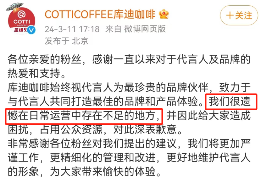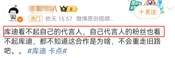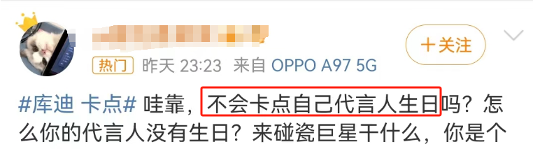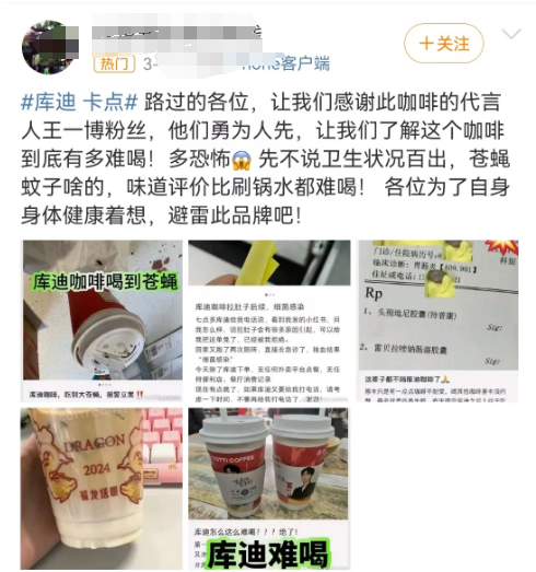 作者 | 杨阳 来源 | 顶尖广告 过完315才知道,平常最爱吃的、经常喝的无一幸免,果然各行各业都想要我的贱命... 尤其是奶茶,被曝光的就有古茗、书亦烧仙草、茶百道,罪名就是随意替换效期标签的,过期食材与未过期食材混用的......以后还能好好地喝奶茶吗? 眼看半个奶茶圈塌房,这不,有人感慨以后只喝咖啡,选择库迪、瑞幸、星巴克。 ![]() ![]() 不过看到库迪的名字,我瞬间迷惑了。 要知道315之前,库迪刚陷入肖战王一博“炒cp”话题风波,遭到两边粉丝的抵制,还被考古食品安全的黑历史。 ![]() 这会儿库迪居然因为奶茶的衬托,靠315洗白翻红了? 01 这个事情的主角,是被部分网友视为内娱神颜的两大男明星:王一博、肖战。 ![]() 简单来说,就是王一博代言的库迪,和肖战代言的德芙联动了,两边粉丝打得不可开交。 具体还要从库迪的一条微博说起。 前几天库迪发了一条微博,大概是说跟德芙联名,上线0糖黑巧、丝滑的流云拿铁。 ![]() 图源:库迪官微 这明明是一条看起来再正常不过的日常联动微博,但却把库迪德芙推向了风尖浪口。 库迪不仅被王一博粉丝喊话,还被带话题#库迪 卡点 送上了热搜。 ![]() ![]() 开始我还没反应过来是啥回事,直到看了一圈评论区算是明白了。 首先是发博时间遭吐槽。10月5日是肖战的生日,而库迪选在10:05分发微博被评价是卡点。 ![]() 其次是联动对象引争议。库迪联动的德芙,刚好就是肖战代言的。 ![]() 总结起来就是,库迪选择10点05发帖被质疑是暗示肖战生日,把自家代言人王一博、肖战拉一块去,让部分网友破防了。 ![]() ![]() 正如网友评论,在唯粉眼里看见两个品牌官宣联名,和看见肖战王一博官宣一样,再加上双方唯粉看不惯对方,一下子就炸了。 ![]() ![]() 也在同一天,库迪发了一则道歉的微博。 ![]() 图源:库迪官微 在道歉声明里,库迪只是含蓄提及运营问题,承诺以后维护好代言人形象,这一波道歉也不被网友买单。 ![]() ![]() 作为联名的另一方,德芙也躲不过被粉丝声讨,有网友扒到德芙比库迪更早发微博,于是也点名德芙。 ![]() ![]() 接下来更魔幻的一幕出现了。 肖战粉丝和王一博粉丝在互相盘点对方的代言微博,发现出现了多次卡点的现象。 ![]() ![]() 图源:微博网友 按理说,品牌方之间展开商业合作,该联名的联名,是很平常的一件事。 对于普通的消费者来说,该喝咖啡的喝咖啡,该吃巧克力的吃巧克力。 正如还有人反而支持两者的联名,支持王一博肖战的商务。 ![]() ![]() 但事实是库迪不只是联名翻车,连产品口碑也翻车。 库迪还被骂“咖啡届的刷锅水”,被扒出一些喝库迪喝到苍蝇、喝出胃炎等产品食品安全的黑历史。 ![]() ![]() 不得不说对于库迪而言,这一波辣评是致命的,毕竟这一周都是媒体报道315的高峰阶段。 这时间点有多敏感可想而知,品牌要是被网友曝光一丁点关于食品安全的负面,都会被舆论放大。 02 事情就是这么个事情,正常的咖啡的商业合作,结果吵到了饭圈,库迪这次多少降低了品牌好感度。 毕竟当时官宣王一博,可以说是敲锣打鼓,给足代言人排面。 当时流量有多大,现在反噬就有多快。 今年1月初,库迪咖啡预热官宣王一博时,只是克制地放出了一个代言人背影剪影,就已经上热搜。 ![]() 图源:库迪咖啡 正如有人评价:国内频繁接触赛车街舞滑板等【酷】品类的流量偶像,并不多。 库迪也很会,根据王一博“酷酷”的标签,以粉丝熟悉的王一博专属昵称“王耶啵”为灵感来设计产品,把谐音梗玩明白了: 在产品方面,上线生椰啵啵拿铁、蓝椰啵啵拿铁和粉椰啵啵三款新品。 在营销方面,库迪喊出口号“年轻就要「库」”。 ![]() 图源:小红书网友 当然库迪估计也是花了不少心思琢磨这句话。 既凸显王一博“酷盖”人设,还点到库迪slogan“喝库迪,更年轻”,堪称是一语双关。 更有意思的是,库迪在包装袋上写了一行免责说明,求生欲可以说很强了。 年轻,指的是心态而不是产品功效。 ![]() 图源:小红书网友 虽然不知道库迪是故意的还是不小心的,但必须承认这句话火了。 库迪还对门店下手,挂起宠粉横幅“欢迎王一博的老婆来喝咖啡”,把宠粉具象化。 ![]() 图源:蔚蓝的香气 不得不说,就库迪这几个官宣代言人的动作来看,确实做了一点的功课,才能在饭圈完成入圈到出圈。 03 除了代言人营销,库迪能圈粉,也离不开搞商战有两把刷子,贴着瑞幸打贴着瑞幸蹭。 说的更直接一点,库迪就是和瑞幸“杠上了”。 在价格上杠上了。 自从库迪打响了现磨咖啡9块9的第一枪,两家就开始你来我往降价了。 一旦开卷,就停不下来了。你降一块,我降一块。 ![]() 图源:库迪小程序 瑞幸库迪打商战,成功把中国人手里的牛奶豆浆,换成咖啡。 当时瑞幸官宣了茅台之后,酱香拿铁爆火。 这可把库迪看酸了,于是库迪也坐不住了,直接来个反向营销。 你玩联名,我也玩联名,瑞幸一滴酒,库迪一粒米。 库迪居然官宣五常大米,推出“米咖”系列产品——“原味米乳拿铁”“生椰米乳拿铁”“小柑橘米乳拿铁”,主打一个养胃。 ![]() 图源:库迪 说好是商战,库迪自然也没忘记“内涵”瑞幸:“深夜的酒伤你的肝,清晨的粥养您的胃”。 而且在一些社交媒体中,网友也发现了“烈酒伤你,米乳暖你”的宣传语遍地都是。 不难看出库迪的营销心机,一边蹭茅台瑞幸酱香拿铁的热度,一边还开启倒油营销内涵对手。 双重buff叠加带火了自己的