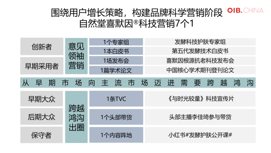 来源:新锐品牌研学社 曾经爆火的天然护肤这几年不吃香了。 一个是前几天宣布破产的The Body Shop(美体小铺),一个是前两年大面积退出中国市场的悦诗风吟(innisfree),以及数个主打草本概念的曾经的头部化妆品品牌如今默默无闻。 天然护肤代表了一个时代。The Body Shop因“纯素美妆”的定位爆火,并发展为全球大型连锁护肤品牌;最火的时候悦诗风吟上海旗舰店一度成为年轻人打卡圣地。 天然护肤的命运转变背后,是中国消费者护肤时代的演变:从自然护肤到功效/成分护肤到科技护肤。长久以来,天然护肤自带 更自然、更健康 的用户心智,到了功效/成分护肤时代,天然护肤成分就逐渐沦为功效存疑的落后成分。 天然护肤在主打功效/成分的品牌挤压下一退再退,最终,曾经最被消费者追崇的天然护肤时代退潮。 天然护肤真的不行了吗?我们认为,天然护肤具备极大的心智优势,加以创新,现在恰恰是天然护肤复兴的好时代。 护肤时代的演变本质上是消费者护肤认知的变化,对于护肤,消费者高度介入。 OIB.CHINA将行业按照品牌竞争程度和消费者介入程度分为4类: 低竞争、高介入: 消费者高度关注,行业竞争度低,比如医药行业。 高竞争、高介入: 消费者高度关注、行业竞争激烈,新消费品基本都在这个领域。 高竞争、低介入: 产业开始进入成熟期,消费者发现品牌/产品区别不大,所以关注度不高,但行业竞争度高。 低竞争、低介入: 这个时候产业熟透了,消费者不关心用什么品牌,行业竞争度也不高,比如差异化很小的家用调味料盐等。 新一代消费品都处于“高竞争、高介入”阶段,用户高度关注,从而行业形成了5类用户人群:创新者、早期采用者、早期大众、后期大众、保守者,他们分别是品牌发展的早期市场和主流市场需要突破的关键人群。 如果产品无法获得创新者、早期采用者这些意见领袖的推荐,就很难突破早期市场,进入主流市场,这是一个新品牌/新产品成为主流品牌必须要跨越的用户鸿沟。 基于多年新消费品战略咨询与品牌孵化经历,OIB.CHINA总经理吴志刚提出了科学品牌打法和科学营销方法论。 所有消费品要进入主流市场成为长效品牌,最终都会走到人群跨越阶段,如果没有科学产品、科学营销,品牌都不可能在原点用户心智中扎根,更无法跨越鸿沟。 1.从品类角度来说,对于消费者高介入型商品(如3C产品、美妆、汽车等),消费者对知识的需求更专业,需要更科学的知识进行沟通。 2.科学营销利于品牌打破即有的市场框架,因为科学创新让低关注商品转变获得高关注。 3.几乎所有品牌从原点用户阶段向大众用户阶段跃迁的时候,必须运用科学营销。 在消费者角色划分中,优先影响创新者和早期采用者,再向早期大众、后期大众、保守者层层渗透。 4.有和无科学营销,决定品牌或产品长期与否。 如今多数网红产品快速炒爆,也迅速垮掉,原因在于借助流量运气的销量,未能有品牌扎实的科学沉淀。 5.科技品牌是整个时代的心理需求。 资讯特别透明的自媒体时代,消费者需要资讯平等。品牌的科学性,是具有公信力可信度的基础,是时代的主流。 光有技术,不等于科学品牌。科技如果没有科学的拆解,则不能完成消费者沟通和认可。科学技术+科学积淀=科学品牌,这是科学营销独有的承接效能。 OIB.CHINA在2023年度,携手自然堂,以“科学产品”理论重新定义自然堂战略新品极地圣水,用“科学沟通”助力新品高效链接用户、以“科学营销7个1”行动在原点用户心智中扎根,并实现人群跨越。 下文将分享自然堂如何做科学营销: 1. 科学产品P(Product):需求清晰、特征明确、优势突出、利益直观 2. 科学沟通C(Communicate):吸引关注、勾起兴趣、说服购买、刺激转化 3. 科学营销M(Marketing):深度影响、广度覆盖、强度传播、跨越鸿沟 4. 科学品牌B(Branding):营销组合拳,实现品牌型增长 项目背景 自然堂,作为国货头部护肤品牌,10年研发投入,寻得喜马拉雅极地酵母喜默因。2023年5月喜默因成分上市,作为具备多维度抗老实力的中国原创成分,喜默因为消费者提供了抗老的新选择。 但与此同时,作为一种新成分,喜默因上市后遇到市场教育的困境: 1. 突围难:喜默因与其他主流成分竞争中,如何建立竞争优势? 2. 表达难:如何向消费者解释清楚喜默因是什么? 3. 取信难:如何让消费者相信喜默因有效? 4. 增效难:喜默因如何帮助自然堂提升品牌科技前沿形象? 8月份自然堂找到OIB.CHINA,在本次自然堂喜默因项目服务中,OIB.CHINA为自然堂提供了科学营销服务一一让喜默因优势突出、沟通明了、形成心智,推动品牌长期增效。 OIB.CHINA 《PCM-B科学营销编码系统》方法论 什么是科学的,什么是不科学的?过去直接强调结果的广告“白大夫白白白就是让你白”、“羊羊羊恒源祥”、“珀莱雅深深深,深层补水专家”,就是没有讲科学的,只告诉你结果,就像医生只给病人开药,不用解释原因。 但今天的消费者是理性的,逐利的,即追求功效,知其然还要知其所以然,只接受科学的产品。 OIB.CHINA认为:科学营销,是通过为品牌树立可检验标准、建立有序知识体系的方式,兼顾深度和广度传播,让品牌专业价值被表达和释放,赢取消费者信任的科普营销体系。 OIB.CHINA提炼出科学营销的5大金标准:需求清晰、机理明确、证据严谨、沟通简单、传播高效,构建指向性强、可科学验证的护肤知识系统,并且广泛让大