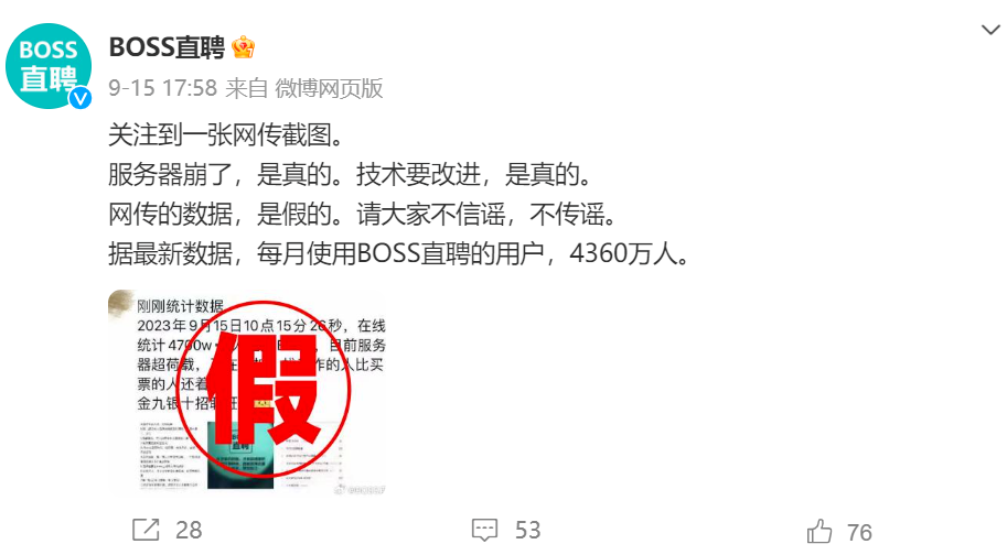 作者:林川 来源:品牌头版 昨日,boss直聘的业绩报告真是让人眼前一亮,股价直接飙升,美股那边涨了将近19%,迎来近一年的巅峰时刻;港股一开盘也是一飞冲天,直接涨停。 ![]() ●图源:网络 这事儿可不小,BOSS直聘作为国内顶尖的在线招聘平台,它的火爆生意就像是一面镜子,照出了咱们国家经济在面对需求减少、供应受阻和预期变差的三大挑战下,去年就业市场的竞争有多激烈。 换言之,就是找工作的人多,好工作难求,BOSS直聘的热闹正好说明了这一点。 净利暴涨9倍,第四季度净利扭亏 2023年BOSS直聘,这家公司赚得盆满钵满。 据BOSS直聘财报,去年公司实现营收59.5亿元,同比上涨31.9%;录得净利约11亿元,同比增长925%,也就是9倍! 从2019年到2021年,BOSS直聘一直在亏钱,最惨的时候一年亏了将近11个亿。但是到了2022年终于开始赚钱了,虽然也就1个亿,但至少是转亏为盈了。 ![]() ●图源:网络 到了2023年,BOSS直聘的生意更是红火,几乎全部收入都是企业客户给的,高达58.89亿元,比前一年又增加了32%。 具体来看,BOSS直聘2022年每个季度收入保持在11亿元左右,在2023年却步步高升,从12亿增长到了16亿左右。 这势头,简直就是坐着火箭往上冲! 一统“招聘”江湖 如今,BOSS直聘几乎是统一了招聘的江湖。 从北京国贸CBD到上海浦东CBD,再到广州珠江新城,一线城市CBD的地铁站,随处可见线上招聘平台的广告。而BOSS直聘绿黄主题色的宣传海报无比扎眼。 在国内的招聘市场,前期知名的英才网在经过多次易主后早已没落;拉勾网也已淡出主流视野;曾经风光无限的58同城去年传出大裁员的消息,成为少有人用的存在。 目前,市场上最大的综合招聘平台,基本是这三家:BOSS直聘、智联招聘、前程无忧。 有意思的是,BOSS直聘的创始人赵鹏,便来自智联招聘。 ![]() ●图源:网络 BOSS直聘成长如此之快,与其进军下沉市场有很大关系。 2022年年末,BOSS直聘回港上市时,向资本市场讲了两个故事,一个是向蓝领下沉,另一个是向金领升维,而前者成功了。 ![]() 很多人都不知道的是,在最近几年BOSS直聘的增长中,蓝领部门是最大的增长贡献者。2020年,中国白领、蓝领和金领的人口分别达到约1.786 亿、3.951亿和1240万。蓝领工人具有更大的人口基数、更高的工作转换频率以及更高的招聘服务渗透率增长潜力。 为此,BOSS直聘一方面在2021年推出了面向蓝领用户的“海螺优选”,通过线下勘验等手段,保证大型工厂直招或正规人力资源服务企业招聘职位的真实性;另一方面主动“下沉”,试图提升低线级城市招聘端渗透率。 据BOSS直聘称,现在包括客服、工人、月嫂、司机等职业在内的蓝领用户,是其用户增长最快的行业。同时,二线及以下城市求职者、招聘者占比也在稳步提升。蓝领求职者占总用户比例已由28%提升至34%。 ![]() ●图源:BOSS直聘 这意味着,作为在线招聘龙头的BOSS直聘,将被就业结构调整的引力所拽动。 4700万人同时在线:“找工作比抢票还难” BOSS直聘创始人赵鹏对这次财报超预期的表现很满意,他说主要是因为用户数量的飙升。 2023年,BOSS直聘迎来了4900万新用户,这是他们成立以来增长最猛的一年。而且,愿意掏钱的客户数量也达到了一个新的里程碑,有520万之多。 用户多了,自然带动了BOSS直聘的活跃度。去年,平均每月有4230万人在BOSS直聘上活跃,比前一年增长了将近一半。而且,每天和每月活跃的用户比例也保持在一个挺高的26.3%。 这么看来,无论是企业想招人,还是小伙伴们想找工作,2023年的需求都特别旺盛。 然而耀眼数据背后,一个无法被忽视的事实是:现在找工作的人真的太多了! 去年9月份,“BOSS直聘服务器崩了”的词条突然登上微博热搜。不少人都吐槽,找工作比十一假期抢票还艰难。 当时正在平台上求职、招聘的大家突然发现无法刷新页面,也查看不到新的招聘信息,更重要的是不能进行聊天交流,一时间社交媒体上哀鸿遍野。 服务器崩溃了,但比服务器更崩溃的,却是想打工的心。 ![]() 有网友则表示:“家可以不回,但是找工作不能停!” “刚聊到薪资问题,怎么就没反应了?” “又双叒崩了?找工作比抢火车票还艰难啊!” 但也有网友十分不满:“三天两头崩,你怎么回事 ”“天天bug,不让打工人活是吧”“收那么多钱,就不能请一些好的工程师搞搞系统嘛”。 后来,有个Boss招聘的员工图传出,称:“在线统计4700w十人在刷BOSS,目前服务器超荷载,正在维护,工作的人比买票的人还着急,金九银十招聘旺季。” ![]() ●图源:网络 对此,Boss直聘官方紧急进行回应称,网传数据为假。另外,官方回应中还补充了此前已在新一季度财报中已经披露过的月活数据4360万。 ![]() ●图源:网络 其实,早在5月以及7月份的时候,就有网友反映过boss直聘崩了。随后boss直聘回应称:今日上午部分用户使用boss直聘pc端时,部分功能出现异常,经过紧急抢修,目前已恢复。 这么算下来,这已经是Boss直聘2023年本年度第三次崩了。 不得不说Boss直聘的服务可用性还有待提升。 Boss直聘崩了,背后是严峻的就业形势 最近几年,我们从身边的场景更能感受到这情况,工作日的公园都有不少年轻人在闲逛;在软件基地就职的朋友年初已经裸辞,至今仍未找到合适的职位。 不久前还看到一位前鹅厂的人在分享近几个月面试情况: “字节,口头offer后关了;小米,offer后自己拒了;苹果三面挂,亚马逊、微软一面挂;美图等反馈......” 与其相对应的,在找