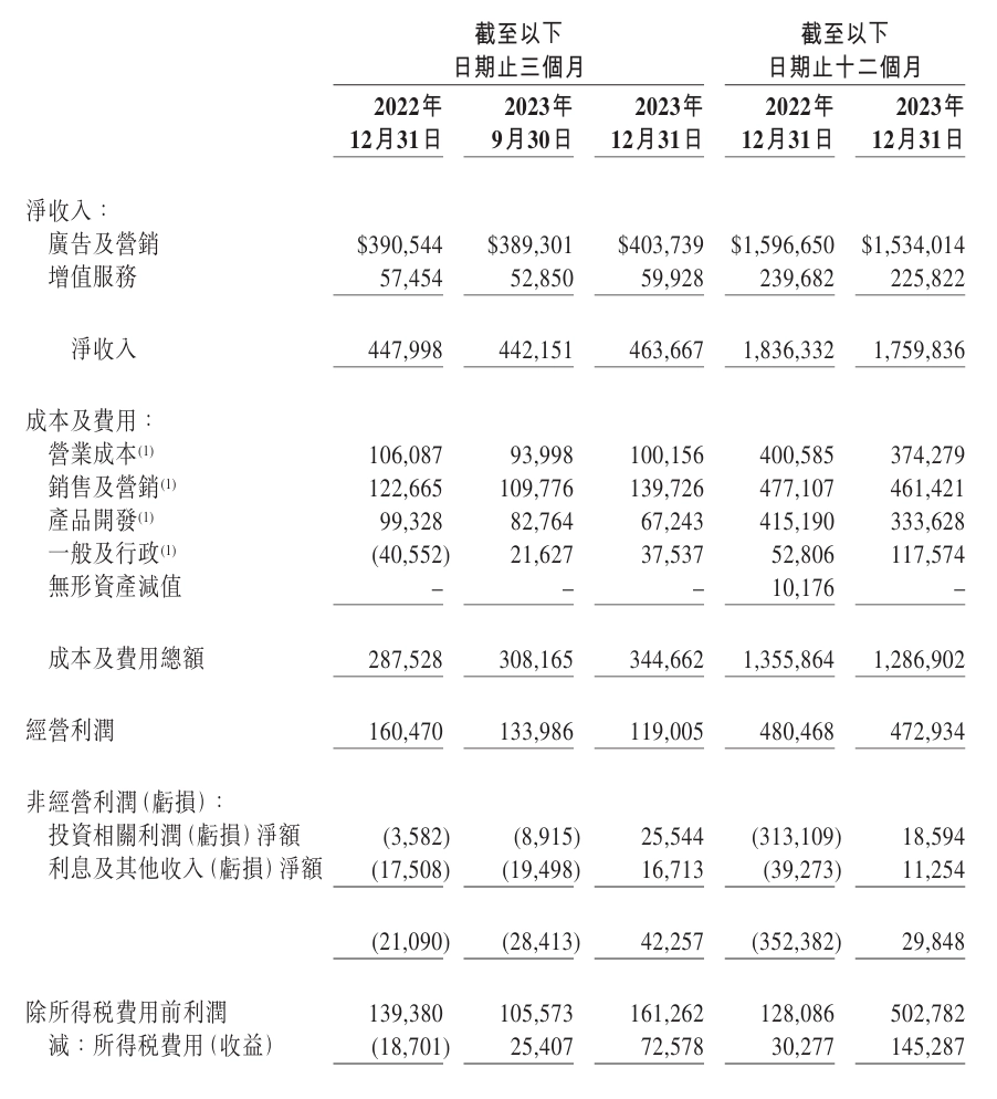 来源:银杏科技 2024年3月14日,微博发布2023年第四季度及全年财报。 去年四季度,微博总营收为4.64亿美元,同比增长3%;四季度调整后营业利润1.459亿美元,同比下降4%;2023年全年,微博总营收17.6亿美元,同比下滑4%;2023年全年调整后营业利润5.921亿美元,同比下降1.5%。 广告复苏周期,但在短视频玩家们的冲击下,微博复苏进程相对较慢。为了应对新挑战,微博正将目光投向垂直领域,试图以此崛起新的增量。 垂直领域在眼下或许是一剂解药,但年事渐长的微博而言,能否焕发出新的生命力,才是下一阶段的关键议题。只是,阻碍微博新生的因素,还有很多。 微博步入中年 一直以来,微博的业绩表现,很大程度上取决于其广告业务。财报显示,2023年,微博广告及营销收入15.3亿美元,同比下降4%;增值服务收入2.258亿美元,同比下降6%;而第四季度,微博广告及营销收入4.037亿美元,同比增加3%。 ![]() 而QuestMobile数据显示,国内2023年四季度互联网广告业务同比增长9.8%至2330.6亿元。这意味着,在线广告回暖局面中,微博广告业务的复苏进程落后大盘。 究其所因,一方面,作为国内互联网的老牌玩家,已然走过十余载的微博,商业化氛围正在减弱;另一方面,尽管微博用户始终在增长,但在用户注意力向短视频平台倾斜的背景下,纯粹的用户增长数据,对微博突破商业化瓶颈、攫取增量所带来的效果却极为有限。 财报显示,截至四季度末,微博月活跃用户5.98亿,同比净增1100万;日活跃用户2.57亿,同比净增500万。 在每年新鲜血液流入下,用户数量的自然增长,并不意味着更多流量涌向微博。相反,随着短视频赛道崛起,用户的注意力逐渐被更为多样化、娱乐性更强的短视频平台所吸引。在此背景下,曾身处互联网流量中心的微博,正在远离C位。用户也从过去刷一天微博,转变为了当下不知觉间刷一天短视频。 而抖音、快手、视频号等短视频玩家,盯上的亦绝非微博的流量,微博过往优势赛道的广告主,亦在被分食。 以美妆广告为例,充斥着大量美妆博主、网红的微博,很长一段时间内都是品牌营销的战略要地。但当下,随着营销行业评估维度转向ROI,品牌亦更倾向于直播带货或是电商广告,缺乏带货基因、电商业务薄弱的微博自然被卷入不利地位。 艺恩营销智库数据显示,纵观2023年美妆护肤品类内容量及互动量,微博份额占比并不突出,互动量甚至不及处在商业化“盐碱地”中的B站。在此背景下,多数美妆品牌已将投放重心迁移至抖音、小红书等渠道。 ![]() 短视频赛道崛起后,大量曾经的微博网红转战抖音,并取得了更好的发展——于微博大V、网红而言,将发展重心迁移至抖音、小红书等变现效率更高的平台乃人之常情,对微博而言,头部的叛逃对本就严峻的商业化生态而言更是雪上加霜。 而文娱领域,微博亦遭到了短视频玩家的侵蚀。以影视宣发赛道为例,去年中,抖音举办“抖音电影奇遇夜”,剑指堪称微博招牌的“微博电影之夜”;而去年诸如《孤注一掷》《消失的她》等在抖音密集宣发,并最终斩获票房佳绩的“抖音电影”,更是带起了一波抖音电影宣发潮。 在此背景下,影视宣发预算中短视频平台所占比例不断提升,而微博似乎正从过往的“主角”,逐渐向“配角”演进——美妆赛道的故事还历历在目,微博当下还坐得住吗? 发力垂直,难解远虑 发力垂直领域,是微博2023年改善自身商业化基因的重点所在。 为此,微博过去一年间,不断加码汽车、数码、游戏等垂直领域,试图以此提振承压的广告业务。主旋律之下,微博筹划了手机影像年、微博竞燃之夜等活动,而车圈亦在微博的运作下多番登上热搜。 显然,微博正试图在垂直领域发起一场“价值战”,以此吸引更多广告主。 微博过往的热搜营销逻辑,更多是大水漫灌式的强曝光玩法。对众多品牌而言,即便登上热搜,亦很难对自身业务、产品销量有显著的提升,毕竟相较于强算法的短视频平台,微博营销的核心在于曝光、传播而非转化。 ![]() 对此,去年微博多番针对热搜展开垂直化改造,使其能更好地聚拢垂直领域核心受众,从而顺应当下的广告投放趋势,改善自身过去因效果广告薄弱所造成的业务萎靡。 《微博垂直领域生态白皮书》显示,2023年微博垂直领域内容规模占比41%,垂直创作者规模同比增长14%;日均垂直热搜流量同比增长82%。 只是,纵使微博在垂直流量运营层面取得了不错的成果,但内容创作规模、流量的提升能否转化为实际效益,背后仍存在着诸多不确定因素。 以汽车产业为例,去年,一场浩浩荡荡的价格战席卷车圈,一众车企为抢夺市场份额以价换量,并根据降价策略,实施着相应的成本削减。 数据显示,去年,汽车工业重点企业累计完成工业总产值同比增长11.1%,然而累计实现营业利润却同比下降26.3%,足见价格战的激烈程度。在价格逐渐成为核心竞争力的背景下,汽车客户营销预算自然有着明显衰减。 同样的故事,亦在红利褪尽的手机行业复写。以微博精心筹备的“手机影像年”为例,从去年年中到今年初,微博围绕该活动,在线上、线下开设多轮活动,可实际效果却似乎未及预期。 具体而言,试图以影像赛事拉动广告主的微博,很难站在主办方层面“得罪”客户,因此所谓的影像大赛角逐难言激烈——苹果、华为、小米、vivo、OPPO等主流厂商,均在不同的“定语”下斩获了属于自身的TOP1. 另一方面,从手机影像,到折叠屏,再到今年初的“AI手