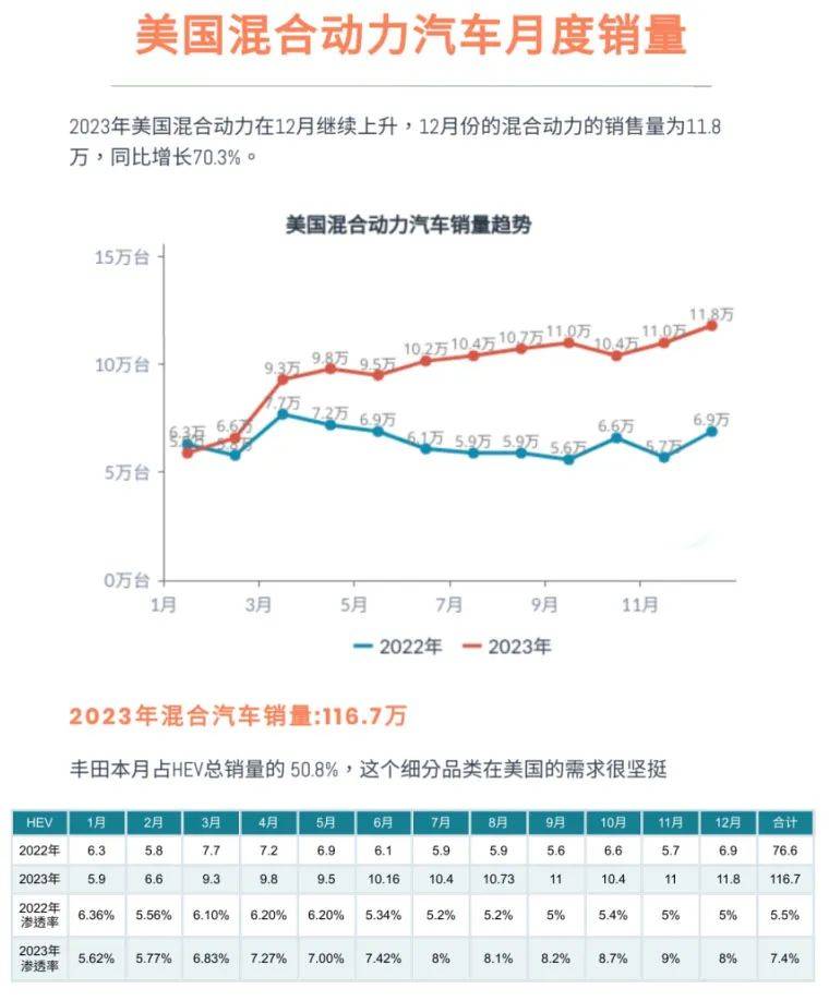 文 | 小卢鱼 编辑 | 杨旭然 来源 | 巨潮WAVE 当竞争对手们在新能源赛道上卷生卷死的时候,电动化速度最慢的丰田汽车,反而在业绩与股价方面双双创下新高。 丰田可能是去年活的最滋润的车企。根据2024财年第三财季报告,2023Q4丰田汽车实现销售收入12.04万亿日元(约合人民币5850亿元),同比增长23.4%,净利润1.36万亿日元(约合人民币661亿元),同比增长86.5%。 ![]() 丰田汽车股价表现(自2023年1月至2024年2月) 良好的业绩支撑了股价上涨,当天丰田汽车美股股价大涨近8%,报收于218.86美元/股,创下历史新高。实际上丰田汽车近一年的股价都在持续走高,期间涨幅高达55.24%,走势远比特斯拉稳定,这是全球汽车市场纷繁复杂环境的一种集中体现。 丰田汽车的信心也随之爆棚,将2024财年销售收入预期上调至43.5万亿日元,经营利润上调至4.9万亿日元,净利润上调至4.5万亿日元。 丰田在新能源时代超过人们预期的表现,意味着燃油车和新能源车似乎已经进入到一个需要共存,也只能共存的新环境之下。而且这并非是由野心勃勃的企业家们所决定的,而是由全球市场中消费者的真实需求所决定的。 节能 石油危机总能给丰田带来扩大出口的机会。丰田汽车从一个日本本土品牌成长为全球领先的汽车制造商,是过去几十年全球汽车工业中的一件大事,是时代变迁的缩影。 其发展历史悠久,多年来没有被收购整合过。旗下凯美瑞、卡罗拉等车型在全球范围内生产与销售规模巨大,受到广泛认可。 丰田汽车也有着创新的工程设计和生产流程,其精益生产系统(Lean Manufacturing)通过消除浪费、持续改进和强调质量控制,让丰田能够以更高的效率和更低的成本生产汽车,也让全球众多工业企业所研究和模仿。 丰田汽车能够顺应时代发展的要求,在不断变化的市场环境中保持竞争力。 ![]() 进入美国市场初期的丰田汽车 回顾丰田汽车的全球化之路,上世纪70年代石油危机是其至关重要的节点。当时石油价格高涨且供应紧张,能源效率成为消费者选择汽车的重要因素。丰田凭借其小型、节能的汽车迅速获得了市场青睐。特别是像罗拉这样的车型,以其燃油经济性在全球市场上受到追捧。 以增强综合性能为研发方向,以引领潮流、做高级普及车为定位,80年代的卡罗拉,很好地满足了石油危机后发达地区消费者日益丰富的物质需求,成为了丰田汽车历史上具有里程碑意义的产品。 到1983年,卡罗拉终于实现了1000万台的产销量,成为二战后发展最快的车型。1995年之后,丰田汽车为了适应当地法律法规和消费习惯,又推出了美版卡罗拉、欧版卡罗拉这样针对不同国家和地区销售的定制车型。不断推陈出新让卡罗拉历经半个世纪、十二代车型的更迭,仍然能位居畅销车之列。 成为世界级汽车制造商后,节能高效一直丰田汽车最重要的标签。随着俄乌战争的爆发与胶着,石油供应紧张、价格持续高位的局势重演,显然对以省油闻名的丰田汽车又是一大利好。2022年,丰田汽车全球销量达到1050万辆,连续第三年打败大众,成为全球销量最高的汽车制造商。 尽管当时疫情反复、芯片缺货对汽车企业造成了不小的负面影响,但丰田仍展现出了强大的抗压力和竞争力。 ![]() 2023年丰田汽车在欧洲市场销量达112.6万辆,同比增长9.1%,在北美市场销量达267.1万辆,同比增长7.0%。除了中国,丰田汽车在主要的海外市场上都取得了销量增长。其中美国市场成了丰田汽车贡献利润的大头,最大单一市场,远超其本国市场的贡献度。 轻混 最适合欧美客户的新能源汽车。曾一度被视为电动化转型路上的“过渡技术”的混动车型,是丰田汽车在欧美市场成功的关键。 丰田汽车诞生于能源匮乏的日本,所以不仅擅长省油,也是最早开始研究新能源的那批车企。丰田汽车在1997年推向市场的普锐斯,大概是最早为大众广泛接受并量产的混动车型了。 功率分流技术这种当时具备革命性的技术,让普锐斯结合了内燃机和电动机的优势,为消费者带来了超低油耗和平易近人的价格,也奠定了丰田汽车在混动技术领域的全球领先地位。 ![]() 早期版本的丰田普锐斯 普锐斯系列在诞生的20年里卖出超60万辆,几乎成为了混动汽车的代名词。但整体来看其销量不佳,第二、三代国产普锐斯也是败走中国市场,等到第五代普锐斯入市,又撞上了特斯拉引领的纯电浪潮。 丰田汽车因为坚持走混动和氢能源路线,过去几年没少受人嘲笑,但是今年丰田章男再次发表“纯电车最多能占据30%的市场”这种言论时,马斯克在转发时却罕见地没有予以犀利反击,只是回复了一声“sigh(叹气)”。 经历了寒潮严冬对纯电汽车的考验后,似乎有不少消费者正在思考混动车型是否更符合自己的使用习惯。 在地广人稀的欧美国家,无论是日常通勤还是自驾旅游,涉及的用车半径通常比国内更大,对续航能力相对有限的纯电车型来说的确是个挑战。再加上欧美大多地区冬季气温较低且暴雪天气多,这两大因素对纯电车的使用效果影响明显。 低温会导致电池的放电速率加快、储电能力下降,进而出现充电慢、续航能力大幅减弱等问题。根据懂车帝的冬季性能测试,在-20℃的天气里,一众插混(增程)车型中纯电续航达成率只有30%多。 而且欧美国家对充电桩的建设并不完善,美国的车桩比是16:1(即16辆车用1个充电桩),大部分欧洲国家的车桩比也高于10:1,达不到AFID所建议的公共车桩比,迟缓