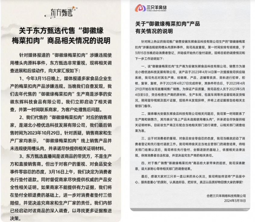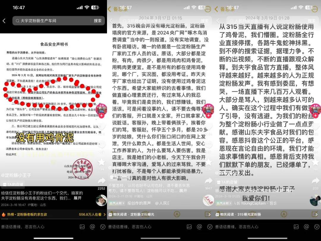 文|王亚琪 编辑|斯问 来源 | 电商在线 在“3·15”所有塌房的商品中,年轻人最舍不得的就是2元一根的“淀粉肠”。 在小红书上,#淀粉肠在家怎么做#迅速登上热门搜索词,超过13万篇笔记详细地介绍了淀粉肠的自制过程,从剁肉泥到灌肠、煮肠,让前两天大呼“不敢再吃”的吃货们,成功在家实现了“淀粉肠自由”。 “从3·15当天直播有人说淀粉肠使用了鸡骨泥,我们懵圈。淀粉肠全行业直接停摆,各路牛鬼蛇神抹黑。到不停地搜索证据、据理力争。不断地出视频,不断地直播跟观众解释……我有感到委屈,有想哭。”抖音博主“淀粉肠小王子”回忆,事发之初一场直播下来几百万人观看,大部分是骂人,但伴随着品牌方下场直播探访生产工厂,“(淀粉肠)爆单了”。 ![]() 灰豚数据显示,3月15日—20日,淀粉肠小王子的直播总销售额上涨520%,总销量上涨504%,3月17日开设的三场直播,有375万人次涌入直播间。同时被带火的还有山东夫宇食品有限公司,董事长亲自在直播间烤肠、吃肠,赫然让“夫宇淀粉肠”成为了烤肠界顶流。在淘宝、京东等电商平台上,不少第三方食品专卖店都将自家淀粉肠打上了“夫宇”的名字。 在淀粉肠这个原本“有品类无品牌”的行业,“3·15”竟意外地给品牌送来了一阵东风。 过去,每年的“3·15”,都是各行各业的“警戒日”,生怕自己被卷入风波中。一旦被曝光,汹涌而来的负面流量,对任何一家企业而言都是致命的,但伴随着抖音、快手等社交媒体的崛起,有了各方展示证据维护权益的机会。相比曾经“3·15”以曝光问题为思路的监督形式,如今的品牌们并不愿意和自己的同行“共沉沦”——使用“鸡骨泥”的淀粉肠被打上了耻辱柱,但没有使用“鸡骨泥”的品牌呢?淀粉肠的“翻身之仗”,是否也具备可被复制的可能性? ![]() 图源:小红书 “3·15”曝光后,销量反而暴涨500% 工作服上贴着“没有骨泥”,背后的集装箱上继续强调一遍:“没有加鸡骨”,主播时不时还把食品安全声明书和检验检测结果表拿出来,给新进直播间的粉丝认真解释一遍:“咱家淀粉肠只有淀粉和鸡肉!”在“淀粉肠小王子”直播间,和“鸡骨泥”划清界限是核心的直播思路。 复盘主播的走红,“回应及时”是口碑逆转的前提。 “3·15”晚会刚刚结束的次日,淀粉肠小王子就发布了回应视频,贴出了所售商品的食品安全声明书,声称“我们的朋友、员工、孩子,大家都特别喜欢吃淀粉肠,每天直播炫好几根,大家放心购买”;3月17日,他又发布视频表示“是不是所有的都在使用鸡骨泥,哪个厂,实况图,都没有考证……希望大家辩证地去看事情。”并呼吁不要网暴自己的员工。 ![]() “我们做直播的心理素质还行,有过来骂人的我忍着,毕竟我们是卖货的,我们想赚钱,我们活该,可是闲着没事的人请不要去侮辱我们的客服,开口拿家人说脏话。客服孙,晚上带着俩孩子,挨着你们的骂,客服赵,怀孕五个多月,都是20多岁的姑娘,凭什么你们张口闭口地在网上发泄,凭什么欺负人……我是她们的小老板,下午开直播爱骂人的过来骂我。” 同一天,为了展示淀粉肠卫生可靠,淀粉肠小王子在直播间直接试吃,两小时内一口气吃了十多根。也是3月17日的直播,让淀粉肠在舆论场逐渐有“反转”的痕迹,“不要一杆子打死所有淀粉肠”的声音开始蔓延。这一天,“淀粉小王子”直播间涌入了375万人次,销售额翻到2.5万—5万元区间。“3·15”之前,其平均日销售额在万元甚至5000元以内。 ![]() ![]() 同期,品牌方的参与,又为淀粉肠的“翻盘”添了一把火。 3月16日,山东夫宇食品有限公司发布食品安全声明书并公开生产流程。声明称:“2024年3月15日下午,枣庄市、区、镇市场监督管理部门对我公司现场进行突击检查,检查中我公司生产的食品未使用各种骨泥等原料,符合国家食品安全标准。” 18日,为自证清白,夫宇在自家生产车间开启直播,董事长现场吃烤肠,直播间实时观看人数突破2万人。 数据显示,3月15日—20日,“淀粉肠小王子”直播间总销售额达25万—50万元,环比上涨520%;销量10000—25000件,环比上涨504%;总观看人次703万,上涨超999%。 值得关注的是,“3·15”晚会前,该直播间的流量来源中近60%都来自付费流量,仅30%左右来自“推荐feed流”,也就是平台推荐,但自3月17日开始,平台推荐流量开始上涨至约50%,3月18日更是上涨至80%。不难发现,以“3·15”为爆发节点,负面事件引发的流量同样惊人,而淀粉肠得以“掰回一局”,既有主播和品牌方的“不甘”和自证清白,也有平台携流量助攻、放大的影子。 ![]() 3月17日开始,“淀粉肠小王子”直播间推荐流量占比不断上涨 “掰回一局”后,淀粉肠就能放心吃了吗? 在舆论场得到“缓冲机会”的淀粉肠,能重新赢回自己的口碑吗? 目前来看,影响依然存在。最重要的原因在于,淀粉肠其实没有统一的国家标准,企业送检时都是采用各自的企业标准,检测标准并不一致。比如,夫宇采用的是《鸡肉熏烤粉肠》(Q/ZZFY 0004S-2022)这一标准,河南开开食品有限公司采用的是《蒸煮淀粉肉肠》(Q/SKS 0001S-2023),河南双润食品有限公司依据的则是《风味烤肉粉肠》(Q/HSS 0001S-2023)。 即使是如今因“口碑逆转”获益最多的夫宇,也无法让所有消费者信服。 ![]() 一方面是因为高于其他品牌的均价,有网友表示:“其他家烤肠便宜的才几毛钱,但这家一根要一两块”,相对高的价格让消费者对其褒贬