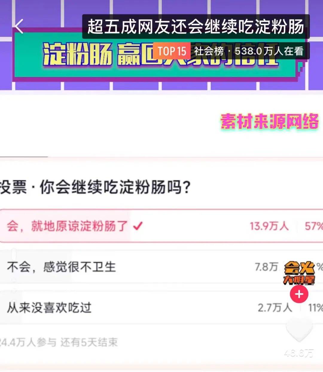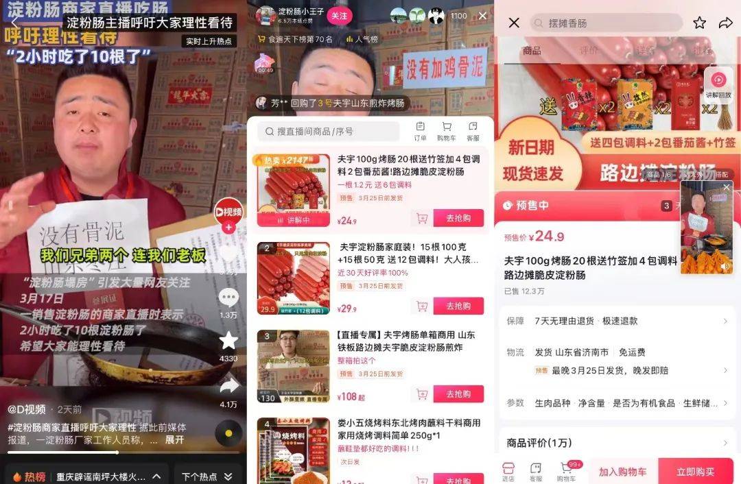 来源:新榜 淀粉肠“塌房”,一波三折。 自3月15日被曝光淀粉肠里含有“人不能吃”的鸡骨泥后,这个顶流网红小吃在5天内登上微博热搜近40次,其中7次话题热度登顶,堪称史上波及人数最广的塌房事件之一。 ![]() 不少围观网友在线破防:“我都吃淀粉肠了,你还往里面放什么肉!” ![]() 几乎是一夜之间,热闹的淀粉肠摊位无人问津,路人们望而却步,不少摊主一晚上0收入。曾经的“朝阳产业”,转眼就似乎要夕阳末路。 ![]() ![]() 不过故事没有就此结束,淀粉肠也并没有因此被彻底打入冷宫。 一些“溺爱”淀粉肠的网友经历了最初的震惊后,没有就此抛弃,而是奔走为淀粉肠澄清。他们引用专家的观点,指出“鸡骨泥可以给人吃,要看加工条件”,以及出现问题的或许只是个别厂家,不能打死所有淀粉肠。 ![]() 淀粉肠厂家们也没有坐以待毙,他们晒出产品合格证书力证清白,面对质疑有人甚至在直播间2小时吃掉10根肠。 这一方法也确实有效。新榜旗下抖音数据工具新抖显示,热度最高的抖音账号“淀粉肠小王子”,4天时间涨粉超3万,直播间累计销售额超过40万元,单场最高带货10万元,相比之前直播额翻了10倍,商品库存直接卖到开启预售。 ![]() 多方努力之下,淀粉肠的口碑触底反弹,#肠粉回宫#话题一度引爆热搜。就连“东方甄选”的自营烤肠账号都赶上了这波热度,近期开始首场直播,镜头对准了烤肠工厂生产流程。 ![]() 一根小小的淀粉肠,不过两三元,为什么能掀起这么大的风波?这场风波背后,淀粉肠究竟是不是一门好生意? 01 淀粉肠厂家直播吃肠“自救”,销售额上涨超10倍。 淀粉肠出事,心碎的是网友,而真正受到损失的,是这条产业链上的各个角色——夜市卖淀粉肠的摊贩、提供货源的经销商,以及生产厂家。 这几天,陆续有#老人出摊卖淀粉肠无人问津#、#淀粉肠摊主一晚0收入#等话题引发关注,曾经摆摊一晚上就能卖出一箱淀粉肠,如今一根都难卖出,甚至有淀粉肠摊主因为没有生意转行卖起了烤面筋。 “蓝鲸新闻”报道称,有淀粉肠经销商这几天遭遇批量退货,并重点提到了“夫宇”这个牌子的淀粉肠,因为比其他牌子看起来更大,利于销售,因此颇受摊贩欢迎,但经销商表示“我们自己都不吃,里面有狠活”。 ![]() “央广网”原报道中提到淀粉肠品牌与配料表 图源:央广网 据了解,夫宇是目前市场上销量最高的淀粉肠品牌之一。面对产品质量危机,夫宇在3月16日就火速发布声明,否认使用骨泥等原料,并提到市场监督管理部门也做了突击检查。 ![]() 夫宇、开开等淀粉肠品牌的《食品安全声明》 失望的网友们并未买账,他们涌进卖夫宇淀粉肠的直播间与主播对峙,刷屏淀粉肠的质量问题,甚至攻击起了主播本人。 抖音主播“淀粉肠小王子”也没有幸免。这是一个专门卖夫宇淀粉肠的直播账号,IP地址与夫宇一样都位于山东枣庄,到目前为止已经直播卖了一年多的淀粉肠。 淀粉肠“塌房”风波后,“淀粉肠小王子”在直播间被几万人指责抨击,客服也被殃及,几个月前卖出去的货都被要求退款。他本人表示:“我把这辈子的骂都挨过了。” ![]() 为了证明产品没有问题,他本人在直播间里2小时连吃10根淀粉肠,一度登上热搜、引发关注。 夫宇食品公司也跟上了澄清的步伐,3月18日抖音直播老板本人直播吃淀粉肠,还在抖音上公开了淀粉肠的生产流程,甚至连生产配方都写出来了。评论区也有员工出来自证“我们自己都吃”。两天时间,夫宇官方账号的抖音粉丝就从几千涨到了4万。 ![]() 随着双润、开开等几大淀粉肠品牌也陆续声明澄清骨泥传闻,淀粉肠“塌房”事件迎来反转,不少网友指出最初曝光报道的不严谨之处,比如“记者去问宠物食品商家骨泥能不能给人吃,商家当然说不能”等等。 一些食品营养领域的科普大V比如“中国食品报融媒体”、“营养师顾中一”也为淀粉肠发声,顾中一指出淀粉肠添加鸡骨泥并无实锤,且即使添加也不是违规行为,鸡骨泥可以用于人的食品,因此“没必要一刀切把淀粉肠划成不能吃的‘毒食品’”。 ![]() 在这种趋势下,越来越多“溺爱”淀粉肠的网友选择了“原谅”,抖音上几天之间冒出了数十个跟风直播夫宇淀粉肠的账号,“淀粉肠小王子”也因此销售额暴涨。 新抖数据显示,3月18日-3月20日连续三天“淀粉肠小王子”的日均销售额均超过10万元,热度最高的单场直播观看流量超过130万人次,销售额达到10万-25万元。此前他单场直播销售额大多为2500-5000元,直接暴涨近10倍。 ![]() 02 一根小小的淀粉肠,为何能掀起大风波? 淀粉肠到底还能不能吃,目前仍处于各家举证阶段,不能一杆子打死,也无人敢打包票。 从目前趋势来看,这根淀粉肠引发的风波和论战,短期内可能还将持续。 不过,一根成本几毛钱、售价两三元的淀粉肠,究竟为什么能掀起这么大的风波,还有无数“溺爱”的网友主动为之证明“清白”? 这大概就是夜市圈“顶流”的影响力吧,有网友表示“我比流言蜚语更早认识它”,虽只是玩梗调侃,但也不无道理。 ![]() 作为不少人从小吃到大的夜市小吃,淀粉肠这两年风头不减,加上摆摊经济爆火的加持,话题热度始终居高不下。 新榜旗下小红书数据工具新红显示,在315之前半年时间里,淀粉肠相关话题在小红书的日均获赞数达到1.74万,累计获赞超过266万次。 ![]() 抖音上的热度也不低。新抖数据显示,过去一年抖音上与淀粉肠