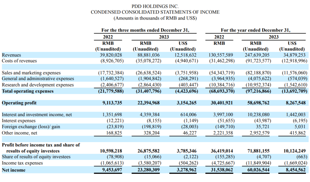 来源:首席商业评论 一份打破想象力的财报 Temu起飞,拼多多赢麻了。拼多多财报的炸裂表现,仍在一次次超越市场的期待。在其他电商平台困于价格战时,拼多多似乎已经找到了一条长期增长的路径。 3 月 20 日,拼多多发布截至 12 月 31 日的 2023 年第四季度及全年业绩报告。该季度,拼多多集团实现营收 889 亿元,同比增长 123%,超过了市场预期的 799 亿元。同时,净利润达到 233 亿元,同比增⻓ 146%,也高出了分析师预期的 151 亿元。这是拼多多自 2021 年第一季度以来,首次出现营收、利润的三位数增长。 ![]() 拼多多经营杠杆效率提升,净利润大幅超预期。营销费用同比降速4个季度,由22Q4同比+44.5%至23Q4同比+30%,营销费用率降低体现公司效率提升。综合来看,公司经营杠杆持续改善,净利润录得254.8亿元,大超市场预期51.4%。 四季度,拼多多实现在线营销服务及其他收⼊487.756 亿元,同比增⻓ 57%;交易服务收⼊ 402 亿元,同比增⻓ 357%——也就是说,一个季度就涨了整整 314 亿元收入,相当于总收入的 35%。而这部分大涨的收入,主要就是来自 Temu。 令人感到意外的是,财报公布后拼多多股价涨幅不及预期。3月20日,公司股价最高上涨16%后回落,最终以3.52%涨幅收于132.17美元。年初至今,公司股价下跌9.66%。 这背后的原因也不复杂,一是拼多多在投资者电话会议中对于再回购股票一事,表现的不是很积极,觉得拼多多目前的主要任务还是增长,所以产生了错位预期。另一方面是地缘政治风险,TikTok相关法案可能会对Temu也产生一定冲击,再加上取消800美元免税包裹的呼声越来越大,针对Temu展开调查的在美国也成为了议题。但考虑关闭Temu恐怕还远远不到时候,在美国上市尚未两年的Temu创造的增长神话,才更值得我们深究。 拼多多CEO陈磊还曾将过去拼多多的发展总结为三次创业:第一次是拼多多主站,第二次是多多买菜,而当下的多多跨境是第三次。在他看来,前两次创业正是对人才梯队的两次大练兵与大筛选。所以才有如今堪称炸裂的Temu。 ![]() 陈磊 短短一年多时间,Temu 以最难啃的北美为支点,拓展到了全球 50 多个国家和地区,横跨亚洲、欧洲、北美洲、南美洲和大洋洲。「本次业绩报告再度证明,上线不足两年的 Temu 已经成为拼多多集团的第二增长曲线。」一位行业人士如此评价道。但如果用Temu是第二增长曲线来评价,显然是严重低估了,不设限的Temu至少是几个拼多多。 Temu不是第二增长曲线 从陈磊的描述不难看出,拼多多对Temu出海无与伦比的重视。目前,Temu 处于尚未盈利的阶段,拼多多财务副总裁刘珺屡次表示,Temu 目前的核心是全力开拓市场、而不是盈利。 拼多多此次财报发布后,交银国际证券在研报中表示,其估算去年第四季度Temu的GMV达到81亿美元,变现率提升至42%。对于Temu的表现,广发证券也在最新的研报中指出,日常低价搭配大型赛事营销,平台声量快速起势。线上平台价格对比下,Temu较Amazon、Shein具备价格竞争力;与线下渠道价格对比,Temu在“多”和“省”方面优势突出。 另据汇丰银行估算,2023年,Temu对拼多多总营收的贡献度为23%,其预测这一数字在2024年有望升至43%,并在2025年进一步上升至50%以上。汇丰银行还称,Temu的强劲增长将持续到2024年,预计2024年Temu的GMV将增长两倍,达到约480亿美元,到2027年Temu的GMV将达到1400亿美元。鉴于Temu在美国市场的渗透率潜力,已经欧洲市场的步入正轨,未来营收超越国内主站也未必是不可能的事。 与此同时,Temu目前大概率仍未实现盈利。由于Temu当前正处于在海外大力推广的阶段,且Temu不像拼多多当时在国内一样可以借力微信,因此Temu在海外采取的是烧钱换取市场份额的策略。然而,Temu只有真正扭亏,才能承担起助力拼多多盈利能力进一步提升的角色。相关数据显示,2023年期间,Temu 在美国每一笔满39美元的订单,营销费用大约为5美元。去年6月,海外新经济杂志《连线》(WIRE)对Temu供应链成本的分析指出,Temu在试图打入美国市场的过程中,每笔订单平均损失30美元。 ![]() 据晚点报道多位 SHEIN 人士都将 Temu 的投放、竞价等视为短期行为,他们认为 Temu 目前的策略无法持续,在停止烧钱回归正常的生意之后,双方的价格差距不会太大。 笔者想说当年拼多多横空出世的时候,阿里和京东也是这么想的,淘系拥有最庞大的中小商家群体,京东有国内最为完善的物流履约体系,他们的优势并不是假的和羸弱的,相反难以挑战。但拼多多就是硬生生做到了,在一片红海的市场里做出了蓝海的增长速度。 拼多多的B轮故事,是一个常读常新的商业案例。它呈现了投资中最难的一件事:如何在真正的非共识里保持坚定。以及一句箴言:机会往往存在于未知里。正如黄峥在一次采访中说的:“我们在一个看似没有机会的饱和领域找到了新的商业突破,因此不需要浪费大量资源过度竞争。” 早期的拼多多定位于“社交电商”,主要做裂变式团购,但投资人却并不感冒。因为团购的故事前些年已经轮番上演过了,作为“千团大战”的胜利者美团在做大之后,团购服务也并非是主营业务,就连美团都觉得难做的团购,拼多多凭什么能做出来? 这样的非正式共识当然有他的道理,只不过这家公司叫拼多多,他似乎一直在创造不一样的惊喜,经常打破人们对他的共识。游戏般的社交裂变只是拼多多的表象,拼多多最与众不同的是极致的效率与执行力,通过对广大白牌商家的赋能将