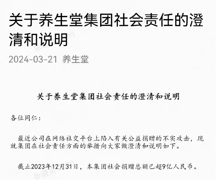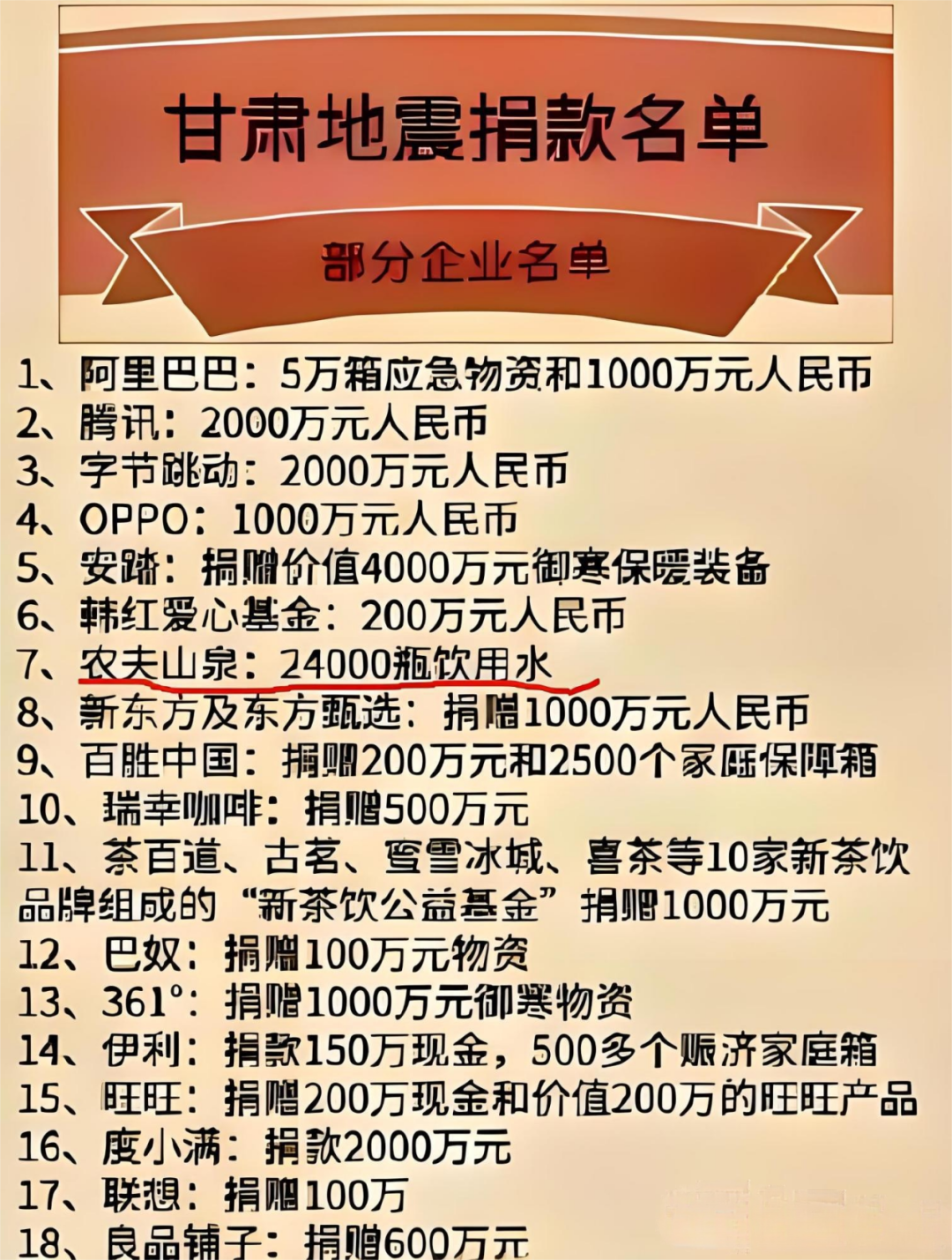 来源:品牌头版 在3月25日,胡润研究院发布《2024胡润全球富豪榜》。52岁的埃隆·马斯克以1.67万亿元人民币的财富重登首富宝座。 70岁的钟睒睒财富虽然比去年缩水9%,但仍以4500亿元连续第四次成为中国首富。 想到前段时间一直站在舆论中心的农夫山泉以及创始人钟睒睒,一些黑料相继被挖出之后,遭到全网的谩骂和抵制,导致农夫山泉的销量暴跌90%,加上今年钟睒睒相继卸任了旗下13家子公司的法人代表。 看来,明年的首富名号怕是要“易主”了。 公益捐款只捐水,显得“微不足道” 没想到去年年底农夫山泉的一则捐款信息,让“舆论战”还在持续。 之前有网络消息称,在公益捐赠方面,农夫山泉的表现不尽如人意。 特别是在甘肃地震的捐赠名单上,农夫山泉仅提供了2.4万瓶的矿泉水作为援助,与其他企业捐赠的数百万乃至数千万的捐款资金相比,这一数额显得相当微薄。 ![]() ●图源:网络 “农夫山泉:24000瓶饮用水”在这个名单上,显得有点特别。 折合算下来,也就5万元不到,这还只是零售价。对于一个企业来说,的确是九牛一毛。 加上今年钟睒睒第四次成为中国首富,网络上更是流言四起,逮着“小气”,“抠门”,甚至造出了“给哈佛捐款1亿,给日本地震捐款5000万”的传言。 近期农夫山泉就捐款这件事做出了回应。 3月23日,农夫山泉发布内部信称,和农夫山泉的财务数据相比,24000瓶看上去确实“小气”了一点。 ![]() ●图源:网络 同时农夫山泉这次也解释了,为什么只是24000瓶水? 通过之前在其他灾难救援中积累的经验,农夫山泉制定了公司《民生类公共危机事件的应急响应和处理原则》授予各个省级大区10000箱以内的捐赠决定权,凡有灾情,自动启动,无需上报总部。 因为执行力最高,且不需上报总部,所以甘肃地震中第一批24000瓶水就是在这个制度下产生的。 实际上,农夫山泉在捐款这上面,确实是无可厚非的。 3月21日,农夫山泉母公司养生堂集团在内网发布了一份关于公益捐赠的澄清和说明公告。 ![]() ●图源:@养生堂 据该说明,养生堂集团在截至2023年12月31日的期间内,其社会捐赠总额已累计超过9亿元人民币。 娃哈哈“购买热”褪去,农夫山泉仍风波不断 在3月19日,娃哈哈抖音官方旗舰店的销售额已经从3月4日的300万元降至25万元以下,不及最高日销售额的十分之一。 ![]() ●图源:娃哈哈抖音官方旗舰店 娃哈哈品牌在抖音平台上的官方旗舰店,在3月4日至3月7日期间,其日销售额表现强劲,一直维持在约300万元。 然而,自3月10日开始,其销售额呈现出持续下滑的趋势。特别是在3月18日和19日,连续两天的销售额已跌破25万元。 自宗老逝世,农夫山泉和娃哈哈两个品牌之间的“捧一踩一”情景初现。 农夫山泉直播间销量暴跌90%,同时娃哈哈也是多个系列直接“卖爆”导致缺货。 如今娃哈哈的“购买热”已经逐渐散去,农夫山泉何时才能重回正轨? 对于农夫山泉的旧账,网友们是“孜孜不倦”的从九几年钟睒睒是娃哈哈的总代理开始翻,一直翻到农夫山泉去年甘肃地震只捐水这件事。 不过要说农夫山泉最“掉价”的一个黑料,还得是2000年的矿泉水,纯净水之争。 在2000年4月,农夫山泉在千岛湖召开媒体发布会,会上他们公布了一系列经过严格和细致的实验验证,指出“纯净水”可能对健康没有益处,甚至可能带来某种潜在风险。 ![]() 这一无根据的指责,导致娃哈哈联合其他六大著名的纯净水生产商,一同对农夫山泉发起声讨。 农夫山泉的这种“无端声明”,其实犯了不真诚的“大忌”。 “真诚”的典范,绝对是河南的“超市天花板”胖东来。 因员工与顾客争吵的短视频在网上传播,胖东来公司迅速采取行动,经过深入调查后,发布了详尽的8页调查报告,全面公开了事件经过,展现了其高度的诚意和责任感。 相比之下,农夫山泉像是“噱头”的结论,以罚款引起大众的注意的一波营销操作,显得有点刻意。 虽然在纯净水,天然水这一争议上,农夫山泉通过营销操作赢麻了。但是在那时起,农夫山泉在“真诚”这块儿也掉价了。 捐款不应道德绑架,更不该被造谣攻击 捐款这事,本来就是应该自愿的,而不是听群众的。自己的钱,想怎么花就怎么花,不需要别人教导。 曾经国货之光鸿星尔克集团捐款5千万被质疑“诈捐”,也引发无数网友热议。 最后是两大官媒亲自为鸿星尔克作了声明,金额加起来也确实是5千万。 ![]() ![]() ●图源:微博 即使如此,一些“眼明手快”的网友们也没闲着,纷纷加入了质疑大军,对鸿星尔克这波操作动机产生了怀疑。 可以说,网友的质疑五花八门,仅仅只是因为五千万没有快速一次性落实到账。 他们觉得鸿星尔克雷声大雨点小,说得多做得少,承诺的五千万怎么迟迟没到账? 仿佛说鸿星尔克想靠嘴巴快过行动,先声夺人,赢得网络的关注。 这不,当天直播带货的日成交量就超过1亿,依托这次捐款事件,鸿星尔克成了“网红”,也引得了不少人“眼红”。 还有去年小杨哥三只羊网络宣布向中华慈善总会定向捐赠2000万元用于采购应急物资、灾区救援以及后续受灾地区重建工作,以帮助灾区人民恢复正常生活。 ![]() ●图源:网络 鉴于三只羊网络本次捐赠金额庞大,一些网友提出了质疑,认为捐款2000万是出于减税的目的。 对此,小杨哥在直播中进行了明确回应,他表示,此次捐赠的2000万资金是在缴纳完企业所得税之后的款项,不存在用税款进行捐赠的情况