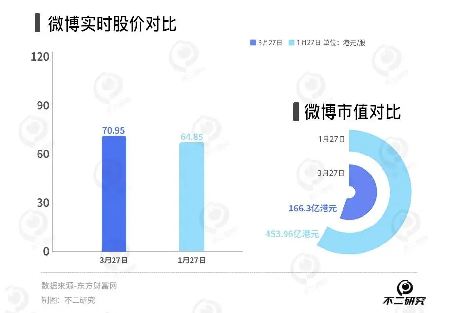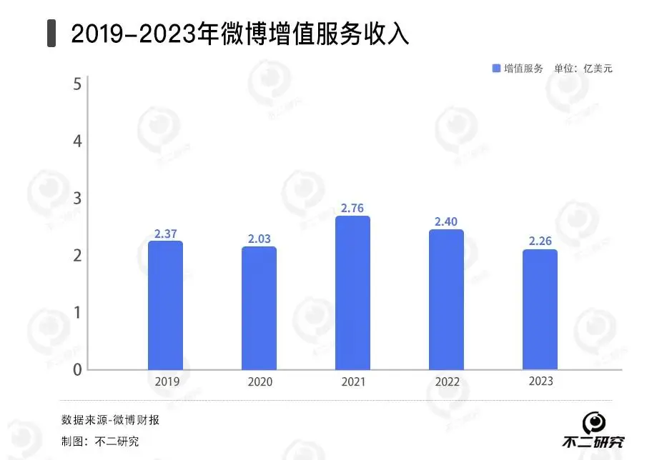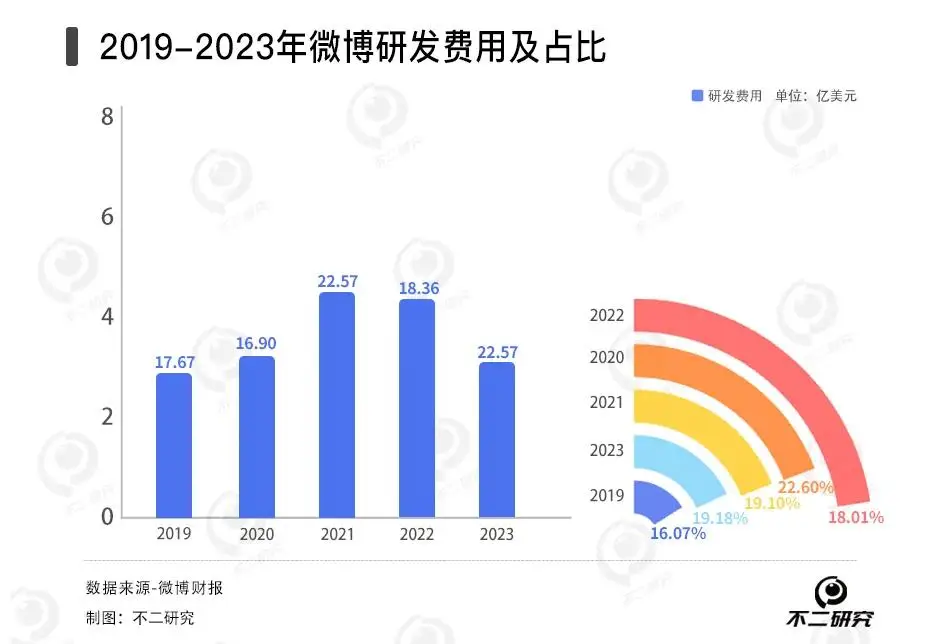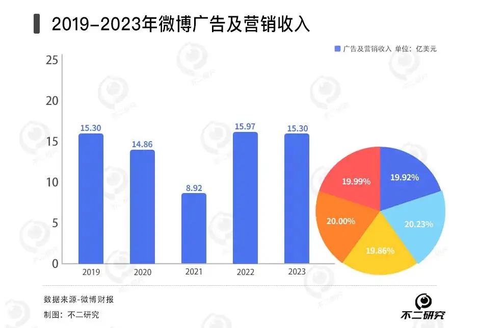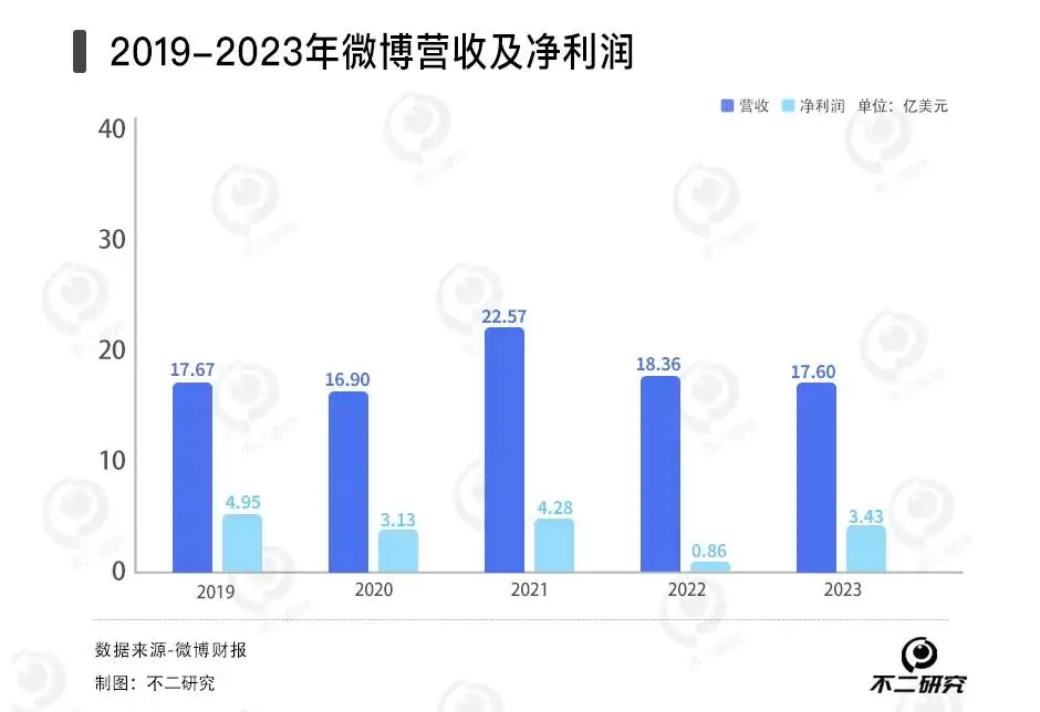 作者 | 艺馨 禄存 排版 | Cathy 监制 | Yoda 出品 | 不二研究 3月25日,微博社区管理官方公告称,已依据相关规定辟除全网流传的“马化腾变老照”相关谣言。 近日,根据微博2023全年财报报告显示:由于广告业务需求疲软,微博业绩面临压力。 「不二研究」根据微博年报发现:2023年,微博总营收同比下滑4%、净利润同比下滑16.6%。目前,微博面临净利润下滑、营收下滑等问题,在「不二研究」看来,由于微博的成本及费用的增加或是摊薄净利润原因之一;与此同时,微博平台及其用户两端的变化也同样是造成微博广告收入减少的关键因素,进而使其营收一定程度下滑。 微博是一种基于用户关系信息分享、传播以及获取的通过关注机制分享简短实时信息的广播式的社交媒体、网络平台。 截至3月27日港股收盘,微博报收70.95港元/股,对应市值166.9亿港元(约折合人民币154.21亿元);对比2023年1月的市值高点453.96亿港元,其市值已蒸发287.06亿港元(约折合人民币265.23亿元)。 ![]() 「不二研究」据微博年报发现:2023年,微博总营收17.6亿美元,同比下滑4%;经调整后的净利润5.921亿美元,同比下降1.5%。 2021年12月的一篇旧文中(《"熟龄"微博回港上市倒计时:近9成营收来自广告,能否寻回"第二春"?》),我们聚焦于“熟龄”产品微博即将回港上市,但其营收高度依赖广告,新故事仍缺乏想象力。 时至今日,微博不仅面临总营收下滑、净利润下滑等问题,还有广告及营销需求收入的压力。 在短视频玩家的激烈竞争下,微博发力垂直领域能否成功破局?由此,「不二研究」更新了去年12月旧文的部分数据和图表,以下Enjoy: 近日,微博发布2023年第四季度及全年财报。 财报数据显示,2019—2023年,微博的营收状况呈波动下滑的趋势;据最新披露的全年报,2023年四季度营收为4.64亿美元,同比增长3%。同时,微博MAU(月活跃用户)达5.98亿,DAU(日活跃用户)达2.57亿,再创历史新高。 不过,作为已有15年历史的“熟龄”产品,微博隐忧重重:净利润下滑、各项成本高企;营收高度依赖广告。面临短视频分流、垂直领域竞争者,微博的新故事似乎缺乏想象力:它的未来,是转型还是守土? 净利下滑成本高企 新浪微博是群雄纷争年代的“幸存者”。 微博诞生于2009年,彼时脱胎于博客的“微博”是最炙手可热的概念,2011年前后各大门户网站纷纷入场,新浪微博、腾讯微博、网易微博、搜狐微博等同类产品群雄逐鹿。最终,只有新浪微博杀出重围,让“微博”从品类词成为自身专属。 作为中国社交平台的开创者之一,微博于2014年4月在纳斯达克上市,并于2021年12月8日正式登陆登陆港交所。 「不二研究」发现,微博的营收状况呈现稳步上升的趋势。从2012年开始商业变现,2014年四季度微博实现扭亏为盈,2016-2020年微博的收入保持着26.7%的复合年增长率。 财报数据披露,2019-2023年微博的收入分别为17.67亿美元、16.9亿美元、22.57亿美元、18.36亿美元、17.60亿美元,尽管在2021年有所回升,但整体上并未能恢复到2019年的水平。 从单季度来看,财报显示微博2023年四季度营收为4.64亿美元,同比增长3%。 但净利润则不具备这样的增长势头。财报数据披露显示,2019-2022年归属于股东的净利润分别为4.95亿美元、3.13亿美元、4.28亿美元、8555.50万美元、3.43亿美元,即便是疫情前也处于下滑中;2023年,归属于股东的净利润为3.43亿美元,2022年同期为2.51亿美元。微博四季报显示,2023年四季度归属于股东的净利润为7640万美元,较上年同期的1.79亿美元大幅下降。 ![]() 成本及费用的增加或是摊薄净利润的一大原因。2019-2022年,微博的营业成本、营销费用、研发费用和行政开支等均逐年上升,其中2023年的成本及费用总额7.32亿美元,同比增加1.85亿美元,绝对值高于同期净利润同比减少的1.20亿美元。 显然成本控制还不是目前阶段微博的重要任务。以研发费用为例,2019—2022年微博的研发费用分别为2.84亿美元、3.24亿美元、4.31亿美元、4.15亿美元,占总收入比重分别为16.07%、19.18%、19.10%、22.60%;2023年,研发费用共3.17亿美元,同比增长35%。 ![]() 目前,微博仍旧困于“外强中干”的财务泥潭,以连年走低的净利润和不加控制的成本来应对业绩检验,市场对其的认可度只怕会越来越低。 广告业务遇冷,用户平台困局难解 经过15年的发展,微博已经成为现象级的社交应用产品。 四季报及全年财报显示,截至2023年第四季度末,微博MAU(月活跃用户)数量达5.98亿,同比增长1100万,其中移动端占比为94%;DAU(日活跃用户)数量达2.57亿,同比增长500万。 极光大数据显示,四季度各大社交APP的MAU次序为:抖音(7.3亿)>微博(5.9亿)>快手(6.5亿)>B站(3.3亿),微博正处于两大短视频平台的夹击之中。 尽管微博的用户数量稳步增长,但并不意味更多的流量都涌向微博。2019—2023 年,微博MAU分别为5.16亿、5.21亿、5.73亿、5.68亿、5.98亿,同比增长率由0.96%增长到5.28%;DAU分别为2.22 亿、2.25 亿、2.49亿、2.52亿、2.57亿,同比增长率由1.35%上升到1.98%。 ![]() 作为国内互联网老牌社交平台,微博的收入来自两个方面:一是广告及营销收入,二是增值服务收入。 其中广告及营销收入是最主要的收入来源。财报数据显示,2019-2023年该收入分别为15.30亿美元、14.86亿美元、8.92亿美元、15.97亿美元、15.30亿美元,占总收入比重分别为86.60%、87.94%、86.35%、86.98%、86.93%;2023年四季报显示,当季广告及营销收入4.037亿美元,同比增加3%,占比87.06%。 根据QuestMobi