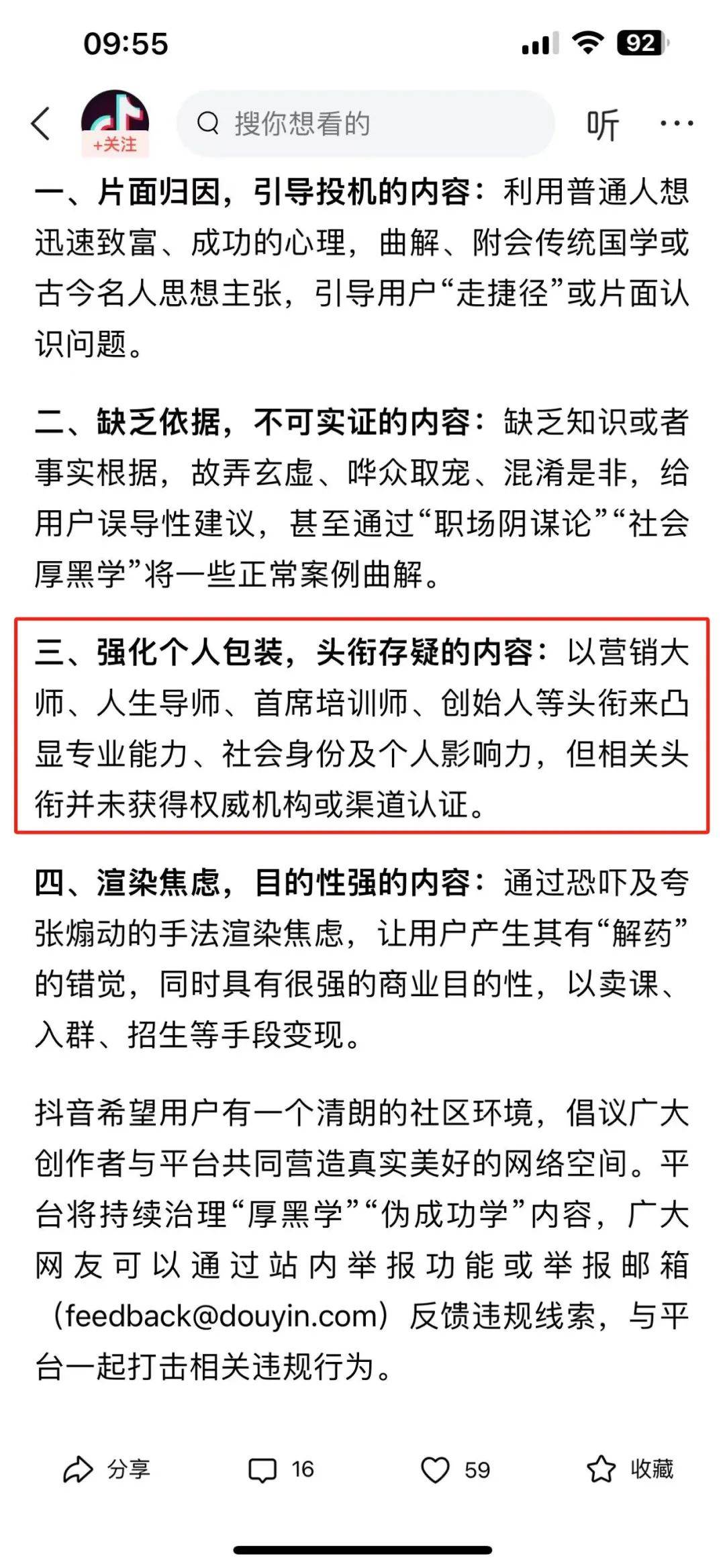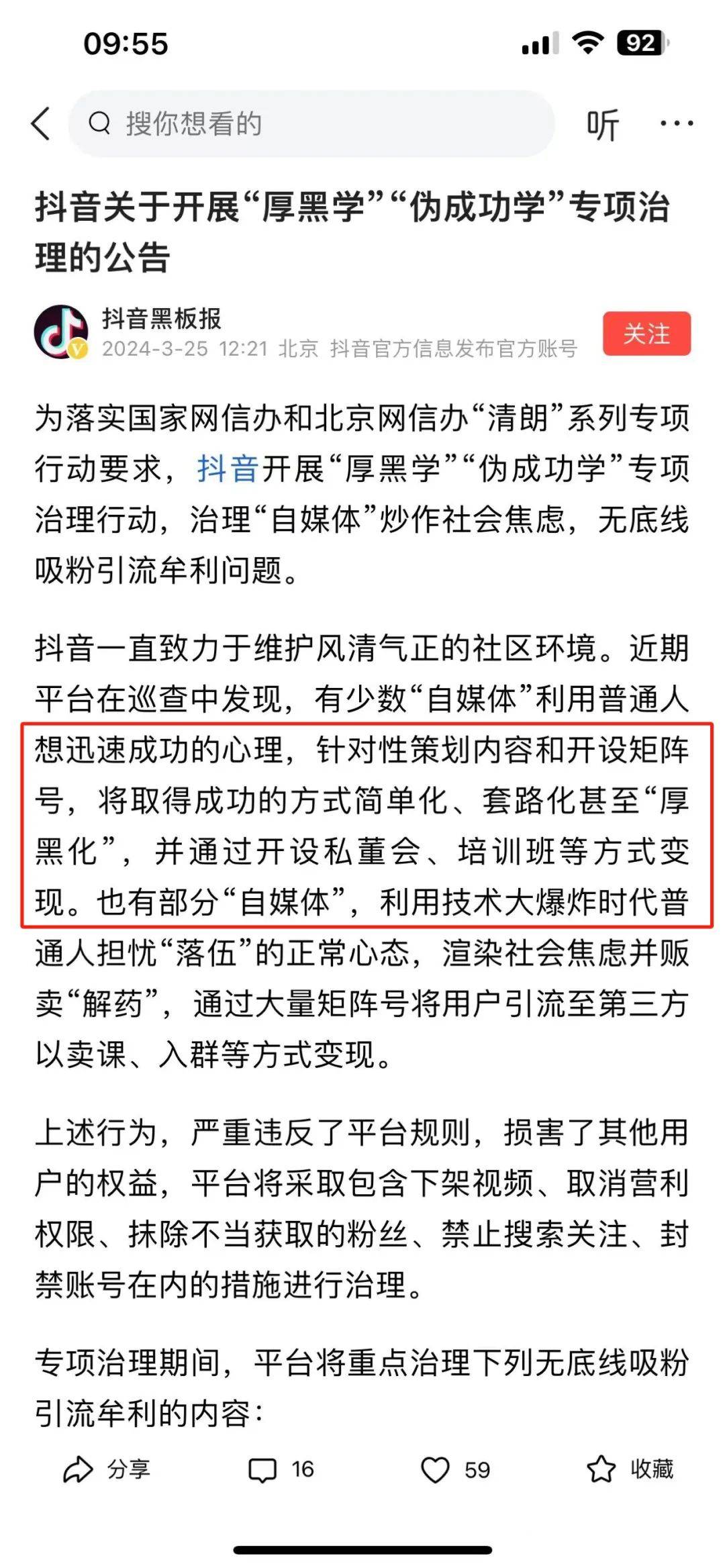 来源:十里村 各位村民好,我是村长 抖音上各种财经、商业、赚钱、副业等博主,该消停一会了。 2024年3月25日,抖音发布了《抖音关于开展“厚黑学”“伪成功学”专项治理的公告》,将对平台上各种把取得成功方法简单化、套路化、厚黑化相关的内容和博主进行重点治理。 ![]() ![]() 01、这些行为要小心了 根据抖音发布的公告信息,我简单帮大家做了一份梳理,对于这些行为来说,今后都要担心。 1、内容上 打开抖音,到处都是一个小时、一天涨粉几十万、赚几百万的内容。 在抖音上,许多内容和博主,都在喧嚷人人都是法拉利、劳斯莱斯、住豪宅。 动不动就是几十万、几百万都是小钱,赚钱十分容易等等。 今后类型这样的文案、分享各种赚钱项目的内容,审核上都会严格把关、 2、获客上 某参、某纪、某DA、某前、某琦等许多博主在抖音上都有几个甚至几十个账号,矩阵账号的引流获客一度成为大家的共识,也成了很多人引以为傲的资本。 但是这次治理公告明确指出,利用矩阵号违规引流的,都属于违反平台规则的。 3、变现上 对于这些所谓的商业导师,主要的变现方式就三种:私董会、培训班、卖课。 抖音也指出,不管哪种方式引流到外部第三方平台或者线下进行这类违规变现的,平台都会权利对违规内容和账号进行处理。 这三个点,其实对于许多商业账号来说,都是致命的。 02、被骗的都是普通人 为什么抖音要加大治理厚黑学、伪成功学的内容和账号,因为再不监管,抖音就将沦为骗子诈骗、洗钱、营销的渠道了。 因为大部分受害者,都是社会最普通的人,他们是大学生、宝妈、退休老人、刚工作几年的年轻人。 抖音明确指出,不少自媒体利用普通人想快速成功的心理,针对性的策划内容、并且把成功简单化、套路化。 同时利用技术的发展、普通人担忧落伍的心态,渲染社会焦虑并贩卖所谓解药。 为什么抖音上有很多商业博主收费三五万甚至七八万的社群,出来吐槽的不是各种老板,而都是普通人呢? 对于一些老板来说,花个一两万,那就是零花钱,或者一个员工一个月的工资而已。 但对于普通的宝妈来说,别说几万了,几百块钱、几千块钱,可能是她一两个月的房贷,孩子一个学期的学费,一年的物业费等等。 所以不管你是收费299教普通人做抖音赚钱,还是收费999教别人利用AI赚钱,他们本身都不具备这个能力。 因为普通人希望的赚钱不是培养,而是复制。 就是希望我交了499、1499,然后我就被复制了你做自媒体、做淘客、做小红书、做无货源、做闲鱼的赚钱能力了。 否则,你就是割韭菜。 而这样的普通人你收费越多,账号被封的就越快,比如李一舟教普通人用AI赚钱就是这样的典型。 03、不仅抖音,其他平台也如此 那么这一次是抖音正式出公告对这种内容和账号进行治理,那么接下来,公众号、视频号、小红书、快手等内容平台,这类账号也会被监管。 主要还是这几年来,各种贩卖焦虑、制造恐慌的账号太多了,割韭菜也太多了。 大家回顾一下,最近每一年,都有一两个抖音上的商业培训博主被央视曝光出来。 所以为了配合和落实国家网信办“清朗”系列的专项行动,其他平台也会快速跟进。 这里尤其要说一下,抖音对于许多商业博主来说是公域,而公众号、视频号就是私域。 公众号上各种说副业、说网赚等账号有很多,发各种赚钱项目的文章、收徒、培训的也很多,这些今后可能审核上都会严格起来。 04、知识付费、付费社群依然赚钱 尽管目前割韭菜的博主和项目很多,包括前几天海参哥大号被禁言以后,许多博主都陆续收到被禁言、封号等消息。 但依然还是要说,做知识付费也好或付费社群也罢,依然是一个很不错的赚钱赛道。 1、成本风险相对较低 只要不去割韭菜搞诈骗,知识付费、付费社群的成本是很低,除了人工成本外,几乎都是净利润。 其一,一个人在家或者团队几个人异地都可以办公。 其二,核心交付是知识、是信息、是资源,所以不存在实物产品的研发、囤货。 其三,许多工具软件都是免费的,包括流量的获取都是免费的。 这比搞卖货、做软件之类的,简单多 了。 2、市场存在认知差、信息差 任何一个简单的信息、技术,不是所有人都知道。 有许多东西的传播、普及是滞后的、断层的。 就像直到现在,还有几亿人不知道怎么开淘宝店、注册公众号一个道理。 那对于新的技术、新的平台,不知道的人就更多了。 既然有信息差、认知差的存在,市场上就有需求。 3、市场需要拉皮条、倒爷这样的角色 有些很武断的认为卖课的、搞培训的、搞社群就是割韭菜,但事实上有许多人恰恰需求这些人割自己的这颗韭菜。 比如我不会做抖音、不会写公众号,我就希望找个人给我快速科普,我觉得不管是花29.9、39.9还是299、499都是值得的。 再如许多做电商平台、供应链对接的,对于一些老板来说,与其自己挨家挨户对接,不如花个4999加个社群,快速认识50家、100家的平台或者商家。 所以,市场是依然需求拉皮条、倒爷的服务商。 4、有门槛的筛选和高质量的交付 而本身作为商业类型的博主,如何避免被打上割韭菜的标签,或者陷入一些会员的纠纷,我觉得核心就是两点。 其一,要有一定的收费门槛,就是你自己要知道,你要收谁的钱,以及收多少钱。 其二,不管是99还是999的费用,最终要提供高质量的交付服务。 只要把这两点做到位了,既不担心被投诉
