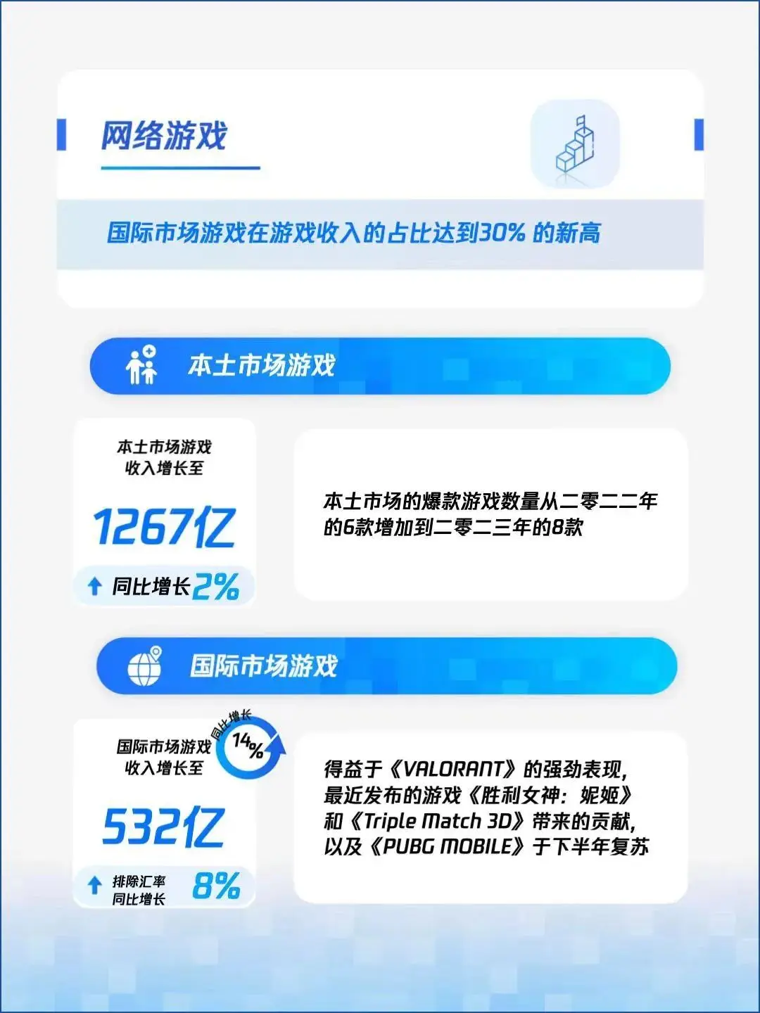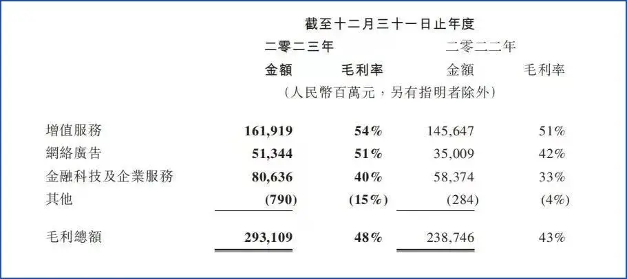 来源/华尔街科技眼 文/Leon 编辑/侯煜 2023年,腾讯每天净赚4.3亿元。 腾讯控股近日发布2023年全年及Q4财报,扭转2022年营收和利润下滑的情况,再次实现双增长。 财报显示,2023年腾讯总营收 6090 亿元,同比增长10%;调整后净利润1577亿元,同比增长36%。第四季度营收1552亿元,同比增长7%;调整后净利润427 亿元,同比增长44%。 在腾讯的三大业务板块中,增值服务依然是营收中的大头,2023年营收2984亿元,相比2022年微增4%。其中,游戏业务营收近1800亿元,剩余的部分来自社交网络服务。财报中重点提到:国际市场收入在游戏收入的占比达到30%的新高;小游戏总流水增长超过50%。 第二大业务是广告收入,2023年营收1015亿元,同比去年的827亿元增长23%。增长原因主要有三个方面:视频号用户使用时长增长、AI驱动的精准广告投放,以及加强的小程序支付工具。 另外,To B的金融科技及企业服务也在2023年为腾讯贡献了2037亿元的营收,同比增长15%,连续三年占腾讯全年营收三成以上。企业服务包括电商服务、云业务、混元大模型等。 腾讯在财报中表示,计划在2024年回购超1000亿港元的股份,对于股东们来说是一个好消息。截至3月22日收盘,腾讯控股(00700)收盘价288.8港元,小幅下跌0.82%,市值2.73万亿港元,依然是中国市值最高的互联网上市公司。 在本期财报中,一个值得关注的数据是:腾讯净利润率从上年的34%下降至19%。主要原因是在2023年全球手游用户支出同比下降2%的大环境下,腾讯游戏业务增长不及预期,甚至让马化腾亲自下场督促游戏部门“不能躺在功劳簿上”。 相对游戏业务的萎靡,微信视频号带动了整体广告收入增长,使广告业务成为2023年腾讯增长最高的板块。 视频号电商化潜力巨大 社交应用是腾讯的基本盘,巨大的生态为旗下游戏、广告、电商等业务提供源源不断的流量。 2023年,微信及WeChat的DAU(月活用户)达到13.4亿,同比增长2%;QQ移动端DAU为5.5亿,同比下降3%。收费增值服务注册账户数为2.5亿,同比增长6%。 ![]() 在短视频矩阵战略失败后,腾讯终于拨乱反正,从2020年开始专注发展微信视频号。Quest Mobile 数据显示,2022年视频号DAU突破8亿,超过抖音和快手。 财报中多次提到的“视频号的总用户使用时长翻番”,则代表视频号的商业化价值激增。 本期财报指出,2023年Q4视频号广告继续保持强劲增长,也带动了广告业务整体营收再创单季度新高,达到298亿元,同比增长21%。接下来,腾讯的重点将放在视频号的电商部分,弥补腾讯先天缺乏的基因。 ![]() 微信相关负责人在“2024微信公开课”上公布了2023年视频号直播带货的成绩:GMV(商品交易总额)较去年同比增长近300%,订单数量同比增长244%。虽然并未公布具体GMV数字,但据机构估计,视频号2023年GMV已突破1000亿元。 去年,视频号上线了“视频号小店”带货工具,并先后出台扶持带货主播、规范品类和售后、供应链主体查询等一系列政策和规定,视频号的电商生态已经初步形成。而在强劲的增长数据支撑下,手握4033亿元总现金的腾讯完全有能力在2024年all in带货业务。 当然,相比抖音、快手等成熟的短视频带货平台,视频号可能还缺乏一些吸引力,比如独家的头部主播等。结合最近东方甄选、小杨哥频繁翻车的情况,腾讯完全可以以此为切入点,加强产品力、履约能力和供应链品控,在微信巨大流量支持下,完全不愁没有生意。 本土游戏收入下滑 ,海外市场收入稳定增长 腾讯的另一个重要身份,便是“全球最大游戏公司”。然而,游戏业务在2023年的表现不是很理想。 财报称,腾讯在本土市场热门游戏的数量,从2022的 6 款增加到2023的 8 款。然而体现在收入上,本土市场游戏收入为1267亿元,同比增长2%,低于4%增长的大盘。 于是,在今年1月腾讯年会上,马化腾亲自喊话:“游戏是我们的王牌业务,好像是躺在成功的功劳簿上。在过去一年,我们受到了很大挑战,新生代游戏公司层出不穷,从玩法类到内容类的转变,我们一时无所适从。” ![]() 马化腾的担心不无道理。 腾讯游戏的大盘分可以分为本土和海外两个部分,运营思路完全不同。国内以手游市场为主,目前问题是除了运营8年的《王者荣耀》和上线近5年的《和平精英》,腾讯再也没能拿出超千万DAU的爆款,而这两款游戏的收入在不断下降。 竞争对手则在腾讯游戏青黄不接的期间激流勇进。首先是新生代游戏公司米哈游,2020年的《原神》是现象级爆品,全球用户超3亿,腾讯方面却迟迟未能拿出对标作品,也就是马化腾口中的“无所适从”。 紧接着,老对手网易在2022年上线《蛋仔派对》,主打派对化的休闲竞技,2023年Q2 期间峰值DAU超2100万。腾讯的竞品《元梦之星》直至2023年12月才姗姗来迟,让网易占尽了先机。 2023年Q4,腾讯加大了《元梦之星》的广告营销投放力度,销售及市场推广开支同比增长79%至110亿元,最终也导致Q4本土游戏收入同比下降3%,至270亿元。当然,《元梦之星》的收益尚未统计在本期财报中,可能也是营收减少的原因之一。 这两款手游在今年初正式交锋。据点点数据,截至2024年2月15日,《蛋仔派对》在中国App Store端近30天收入约1.44亿元,《元梦之星》收入约为6155万元,差了一倍之多。 ![]() 资深游戏从业者认为,《蛋仔派对》的优势在于其垂直定位,面向大学生和女性用户,ARPU(平均每个用户收入)稳定在35元左右;而《元梦之星》用户年龄层更广泛,ARPU为10-17元,盈利能力略低一些。 就目前而言,