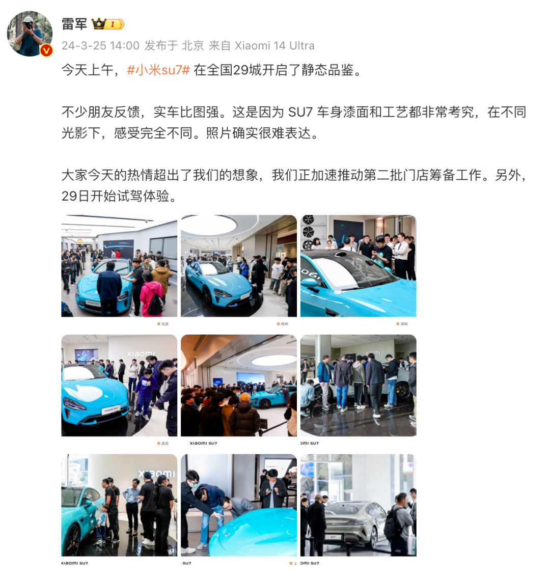 来源:品牌头版 01 终于在明天,也就是3月28日,小米汽车将举行上市发布会,藏了这么久的小米SU7售价,将在发布会上公之于众。 雷军还是雷冖,还得看小米SU7给不给力了。 这几天,小米汽车官方和雷军发布了多条动态进行预热。3月25日,小米在全国29个城市的汽车销售门店率先开启了SU7的静态展示品鉴活动。 不少网友到店纷纷化身车评人,整个互联网都被这股“小米汽车热”给点燃了。 ![]() ●图源:微博 据了解,小米汽车预热首批的29城为:北京、上海、广州、深圳、武汉、杭州、成都、苏州、南京、温州、宁波、无锡、厦门、合肥、重庆、佛山、东莞、西安、郑州、天津、长沙、太原、青岛、海口、石家庄、昆明、福州、南昌、沈阳。 但是直至3月28日的发布会前,官方将不会公开透露关于该产品的定价和销售政策。 ![]() ●图源:网络 不得不说,SU7的取色比较大胆时尚,设计也还是不错的,外观很有辨识度。 颇有“保时捷车头+阿斯顿马丁车屁股”那味,因此被网友戏称“保时米”。 02 随着上周小米财报的公布和小米汽车超级工厂的正式揭幕,造车成本也逐渐明了。 根据最新财报数据,小米在2023年全年对研发的投入达到了191亿元人民币,相比去年增长了19.2%。 在这些投入中,智能电动汽车等创新业务的费用占据了67亿元,而与智能电动汽车等创新业务相关的股票薪酬费用也高达8亿元。 ![]() ●图源:网络 自小米于2022年宣布进军汽车业务以来,其公开的投资规模在汽车领域已达到98亿元人民币。 为了推出其首款汽车,小米不惜投入近百亿的资金,这也充分展示了小米对于智能汽车业务的重视和决心。 而且不只是投入在汽车研发方面,这次小米汽车工厂的正式揭幕也让网友们感受到雷军这次为了给小米造车“造势”是真的拼了! 小米汽车工厂于2019年开工建设,位于北京亦庄新城马驹桥智造基地,占地面积约1000英亩,投资金额高达50亿元人民币。 ![]() ●图源:微博 不拼咋办?毕竟这牛已经吹出去了。 钱花哪儿去了,总得有个交代。 小米对此也是毫不避讳,去年12月的小米汽车技术发布会就介绍了小米汽车的五大核心自研技术:电驱、电池、大压铸、智能座舱、智能驾驶。 加上小米汽车工厂采用自主研发和生产的电池电芯,还配备了先进的智能制造设备和自动化生产线,以提高生产效率和产品质量。 在雷军看来,“造车是首战即决战,小米的第一辆车一定是那个时候的尖端水平。” 小米SU7,定位C级高性能生态科技轿车。 不过市场最为关心的小米SU7定价始终未被披露。在前段时间的业绩会上,小米集团总裁卢伟冰强调SU7的定价“会有点贵”,但相信大家看完3月28日的发布会后会认可这一定价。 不断的对外宣称投入成本之大,甚至在业绩会上明确表示“会有点贵”。一边强调自家SU7的价值,一边给“米粉”做起心理建设。 看来,小米这个高端路线,是非走不可了。不仅如此,小米还对自己的高端路线抱有很大的信心! 03 因为雷军一开始对SU7价格表示先不透露,所以这次网友们对于小米SU7价格的猜测可以说是五花八门。 雷军同款”小米汽车工厂工装夹克已经上架小米商城,该夹克号称是“小米汽车工厂揭幕限定纪念款”,售价 299 元,限量 800 件,当时一上架就秒售罄。 于是有网友就猜测说,299*800=239200,可能就是小米SU7的起售价;还有网友根据发售日期阳历3月28日,是农历2月19日,推测出顶配32.8W,低配21.9W。 不得不说,网友们的推测还真是“有理有据,让人信服”,小米汽车销售顾问非你们莫属。 ![]() ●图源:微博 不过从广义的角度来看,是否真的存在一个忠实的“米粉”群体? 购买小米产品的消费者是真正倾心于小米的品牌理念,还是仅仅因为小米产品的性价比而做出了选择? 如果这部分消费者在经济条件改善后,他们是否还会继续支持小米品牌? 如果用米粉二字来囊括为适合自己的产品买单的小米用户,那么米粉就存在。 即使你是个“米粉”黑粉,也不妨碍你给家里添置一把小米指纹锁和一台小米空调。 说到底,小米这货就是懂消费者,提供其他品牌给不了的那种“性价比爽翻天”的极致体验。 小米刚出来时,所有人都知道它容易发烫的事实,好在价格优势强行压住了产品瑕疵,这才有了“小米为发烧而生”的调侃语录。 ![]() ●图源:网络 如果小米汽车依然和小米手机一样,存在明显的产品瑕疵,这时候它又没有小米手机的价格优势,结果可想而见。 小米手机烫一下没事,但小米车在高速上发烫一下,那这辈子就“值”了。 早在2021年3月,雷军官宣造车时就计划首期投入100亿元,未来十年还将投入100亿美金。 如今三年之期到了,小米首辆新能源汽车SU7即将在3月28日发布。 小米的首期100亿元的预算也快烧完了,这次的SU7,也算是这三年来,给广大米粉“交卷”。成绩如何,就看明日。 04 在预热这块儿,小米也是下了大功夫。 就在SU7静态展示开启之时,小米汽车App也被发现已经在苹果AppStore上架,目前有「购车」、「社区」、「商城」、「我的」四个模块,社区则同步了官方账号的各种预热内容,不过小米应用商店则暂未上架。 ![]() ●图源:网络 有意思的是,在苹果商店搜索小米汽车之后弹出的第一个APP是极氪,说明小米这波的竞争压力还是不小的。 今年2月,全新极氪001发布,售价26.9万-32.9万元,入门价格维持不变,顶配价格降低5.7万,并且在产品力上进行了短板补强。 小米SU7这次估