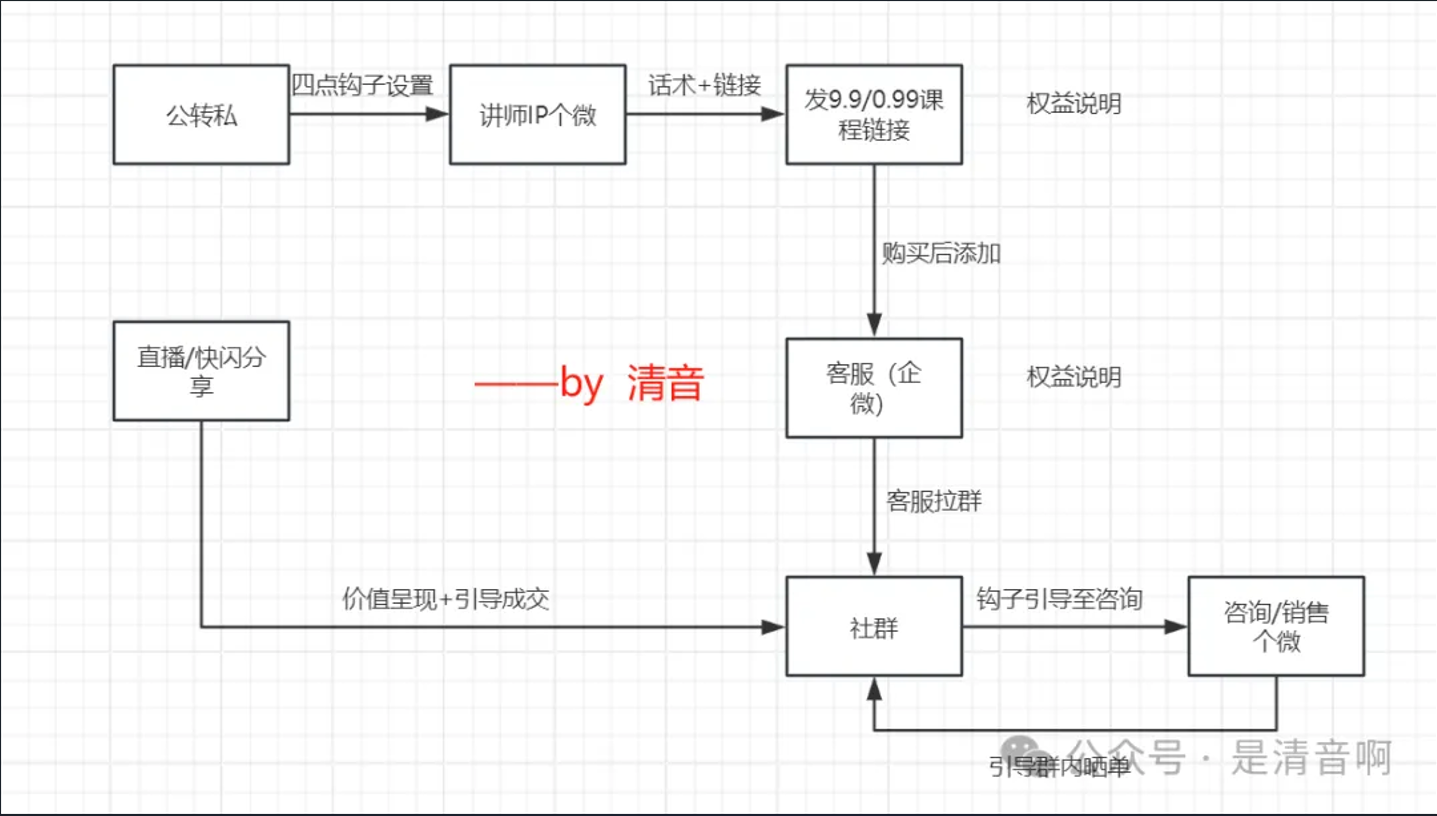 写在前面: 知识付费行业到底还能做多久? 知识付费行业与在线教育的边界又在哪里? AI大模型加持下,行业会不会被AI定制模型取代? 以上这3个问题是我去年踏入行业之初最关心的问题,现在看来我应该不是最后一位,这可能是每一位在线教育&知识付费人心头的达摩克利斯之剑。 缺乏信心并不是因为出现了困难,但出现了困难,一定是因为缺乏信心。那么,就从根本去溯源、拆解,找到灵感。 今天就来拆解一家成立一年便营收过千万的女性IP的商业模式——鹿盈盈。 01背景 大家好,我是清音,一位知识IP创业者,专注高客单研究,聚焦教育&知识付费行业。 我从去年10月底、11月初开始独立创业,在这之前是互联网+教育千万级项目操盘手。我想做IP的原因有2个:内因是不甘心,外因是看到了AI大模型的发展趋势,内外裹挟之下让我这个社恐竟也有了直面镜头的勇气。 好,废话不多说,言归正传。 之前我一直以为知识付费行业是2019年兴起,查了报告才发现有人在2010年就布局,2018年行业就有一定规模。 ![]() 早期一定是有红利的,我们今天拆解的鹿盈盈就是2019年红利期开始的0-1。 虽然他们官方说是2020年,但我认为对于创业来说,一年顶十年,这账得从头算起。他们的两位创始人2020年正式合作之前,各在2019年都有过独立的创业积累和尝试。 02拆解目标 拆解知识付费行业的玩法,与职业教育&在线教育优势做融合,学习鹿盈盈的优势打法。 03商业模式三要素拆解 我的拆解习惯一般是按商业模式三要素拆解的:产品、流量、变现。做操盘这么多年,不管C端还是B端,我认为别管什么花里胡哨的玩法,抓根本就可以,其实都离不开这三要素。 鹿盈盈(以下简称鹿)的优势我认为在于产品以及流程体系的全面、细致;在于战略上的抓大放小和坚定、当然了还是有一定红利的。 但鉴于2024年大家都特别卷,讨论红利没什么意义。所以这里我专注拆解其流程体系-社群发售、产品设计、以及战略定力。 ①战略定力 为什么说鹿比较有战略定力?我认为全靠同行衬托。 放眼现在的整个知识付费行业,是1:9的正态分布图,比较头部的如得到、樊登读书等古早玩家,后来居上的以参哥、张琦为代表的MCN系打法,这属于头部,不认可的可以讨论讨论。 中腰部呢?各种以将复制头部进行到底的MCN系打法,比如什么女版参哥的dada,以抖音拆解起家的小徐,以卖会员为主的群响等等等等,我个人比较欣赏安先生,可能因为是我是潜在的颜控?但我也欣赏金枪大叔呀,还是因为我是潜在的文艺青年?不重要。 尾部的是大量怀揣各种动机的新入行者、长期低水平重复者等等,混乱、内卷、大量的战术性勤奋,我现在就处于这样的阶段,哈哈,还得较长一段时间。 在2019年-2020年,鹿是在这种情况下入的局,且团队没有流量基因。因为两位创始人,一位早期擅长做交付、课研,一位早期擅长做微商,还都是30+宝妈,就是靠着私域流量活了下来。 想象一下,2020年2月左右,我们被关在家里2个多月,闲的长草,那会我还在线下,每天就是打王者荣耀。但在线教育&知识付费那会可是攻城略地的好时候,直接开直播就有流量,躺赚,所以每个月新入局者不计其数。到2020年9年,我终于开始做线上了,一开始就是做操盘,管理整个项目和在线教育部门,有种青铜进错王者局的错觉和恐慌。 据公开资料和鹿的访谈以及他们交付的课程里说,他们2020年6月之后才开始做公域。所以,当周围所有人都在奋不顾身的抢流量、争夺话语权、商业互吹、搞轻交付和会员的时候,能不跟风,坚定做好自己擅长的事情,暂且不论对错,这种定力还真是难得。做教育或者说做生意就是这样,守着、熬着、只要不死就有机会。 ②产品设计 ![]() 从创业之初,我买了很多知识付费课程,各式各样的。鹿的话,我是除了私董都买了。 我发现鹿的课程设计以及流程化设计上是最接近职业教育的打法的,给人一种很正规的感觉。他们应该是我见过的所有课程里,在形式上、流程上、体系上最少出纰漏的,比如错别字最少、故弄玄虚最少、逻辑性和体系较严密,价值观还不歪。 尤其是两位创始人,那是有真功夫在的,言谈举止都是实战和刻意练习的表彰。但其他人讲的课,比如流量操盘手的课、发售操盘手的课等、一言难尽,大约是因为我不是目标对象的原因。我曾边看边吐槽过······但这也给我带来另一种收获,那就是——你,清音,你永远别成为这种人! ![]() 虽然很多人都说先完成再完美,又说世界就是个大的草台班子,这些话,站在内部视角来看自己、宽慰自己都没毛病,但你要用这样的论调来教育你的付费用户,那真是七个棒槌堆一堆——颠三倒四。到此知识付费行业的割韭菜乱象也就可以理解了。 但说实话,任何行业的秩序建立都会经历这样的时期,从无序到内卷再到竞争出局,再到群雄并立,直到树立行业规则。 再说回来,鹿到目前为止,引流课、爆款课、高价课、项目课四位一体的商业闭环是跑的比较顺了,一年多,能做到千万以上的体量,产品设计应该是头功一件,飞轮效应是比较显著的(下一环拆解)。 我认为在商业模式三要素里,最有门槛、最有难度也最容易让企业上一个台阶的其实不是营销、也不是渠道,反而是产品设计的能力。 商业社会,有产品,购买才会发生。但凡做过定位的人,都不会觉得定位有多容易,尤其是产品定位和人群圈定以及IP定位。因为做流量、营销、渠道
