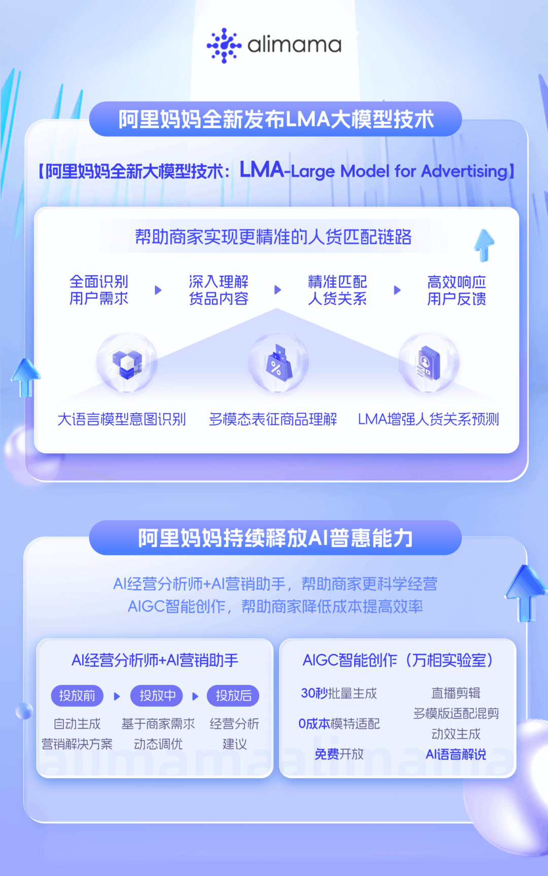 2024年,还有增长的机会吗? 2024年,在挑战与日俱增的中国的消费市场,万千商家又该如何找到新的增长商机? 今年刚开年,OpenAI就发布来震惊世界的Sora,而AI这股热潮如同硬币的阴暗面,为电商行业带来了一系列挑战与机遇,但回望历史,你会发现,每一次变革,都会有阿里妈妈的身影。 2024年,正当品牌商家和运营专家们准备抓住新的市场机遇,积极筹划策略之时,长期专注于淘宝电商平台生态的阿里妈妈,携带着一系列创新的解决方案,抢先一步向他们展示了未来的发展方向。 他们最近在虎嗅一次访谈中,提出了一个新概念:【1+1+3】创新业务模型,以此将建设淘系增长新飞轮,释放经营新可能! 阿里妈妈效果广告运营中心&市场部总经理树羊说:“增长肯定核心还是来自于AI能力的技术突破,加上我们的产品创新。” 我觉得有点意思,我也很好奇:AI这么厉害?产品创新怎么创新? 今天让我们一起解读一下这一新模型,更重要的是,希望给商家伙伴提供一些破局思路:怎么借助【1+1+3】创新业务模型找到增长的可能? 我们先来科普一下什么是【1+1+3】创新业务模型? ![]() 第一个“1” 阿里妈妈发布LMA大模型技术(LargeModel for Advertising)。 什么是LMA大模型技术?它有什么价值呢? LMA,就是推广领域的大模型-LargeModel for Advertising,这项AI技术会像一位智能助手一样,去为商家理解消费需求、自动锁定高度匹配的TA人群。 LMA大模型技术背后凝聚了阿里妈妈在多模态模型和大语言模型领域的集成创新。 首先,在阿里自主研发的大语言模型基础上,实现了电商场景的超大规模多模态预训练,获得了对图像、文本、视频等多种模态的高质量表征; 其次,我们通过海量的消费者行为数据,对这些表征进行有效的Fine-Tuning,让这些表征更契合消费者的消费意图; 最后,因为LMA大模型技术结合了世界知识和推理能力,相当于可以“脑补”出来消费者当下的消费需求,所以它不但可以提升CTR和CVR预估模型的准度,帮助商家更准确地预判投放的效果,还可以对消费需求进行精准预测。 这个大模型技术有什么威力? 我们知道,电商的本质是人与货的线上连接,过去的逻辑是人找货,现在是货找人,那么一切的核心就变成了:如何让货更加精准地找到消费者。 以往线上购物消费者搜索后出现海量结果,这到底是给消费者提供了选择还是让他们陷入了选择困境,现在通过阿里妈妈全新的LMA大模型技术,可以挖掘到消费者更多且强相关的诉求,并且精准推荐、匹配,那么一方面满足了消费者的需求,另一方面,商家也能为消费者提供更多的产品服务。 LMA大模型技术的出现,让人货匹配更精准,让新品、爆品运营更简单。 举个具体例子,搜索或购买过猫粮的消费群体在搜索毛衣时,系统会优先推荐带猫咪图案的毛衣。基于AI的能力,理解和找到一群有相同的兴趣爱好、有相同的生活场景、有相同的生活环境的消费人群,通过这些用户群体的兴趣偏好和商品选择来给消费者购物的推荐和指导,帮助他们更好的、更简单的购物和选择 更厉害的在于,LMA大模型技术支持跨品类推荐,假如喜欢户外的消费人群购买过登山杆,系统会提炼他们的兴趣可能和户外有关,会继续推荐防晒霜、冲锋衣等户外场景相关的产品。 所以说,LMA大模型技术能够帮助商家突破品类边界,实现更精准的人货匹配,以此满足满足消费者的需求。 ![]() 第二个“1” 阿里妈妈即将发布的全新的革命性产品。 阿里妈妈广告产品中心总经理渊穆在采访中提到: “今年,我们会上线一款革命性的产品。推出支持商品和直播的全站推能力,为商家提供一步到位的全站流量运营方案,商家可以获得更具确定性的付免联动机会。我们希望这个产品成为商家在新的淘系生意增长中的一个确定性的增长引擎。” 这个爆炸信息里,有一个非常“重量级”的词:付免联动。 什么意思?付免联动,是指阿里妈妈推出的“付费撬动自然流量的全新产品机制”。 它有两个价值:让生意结果更确定、操作过程更快捷简单。 我们知道,过往的商家在获得、或者撬动流量的时候,能撬动多少,其实是不确定性的。 做电商,最怕的不是投入,而是投入之后不知道为什么没人买! 另外撬动之后,这个流量是不是精准,是不是商家的目标消费者?能不能产生下单行为,也都是不确定性的。 付费撬动自然流量的全新产品机制,能够让生意结果更确定、操作过程更快捷简单,为商家带来最大的价值。 只能说一整个期待住了! 但是,如此好的大模型技术,是不是只针对老牌商家、大牌商家,对于千千万万的新入局的商家,也能用吗? 这就不得不提【1+1+3】里面的“3”了! 1+1+3里面的“3” 2024阿里妈妈3大运营计划。 其实,跟商家最息息相关的、最重要的,就是这个“3”,也就是阿里妈妈发布的3大运营计划,包括:「新质新品牌计划」+「新质好货计划」+「新商培育计划」。 数十年间,中国电商的繁荣依赖于庞大的用户规模,但是随着入局者增多、技术不断进化,电商行业也变得越来越卷,那些想要新入局的商家们都在期待平台能够提供更公平、更友好、更系统科学的增长解决方案。 阿里妈妈在AI新浪潮的引领下,推出3大运营计划,旨在为淘系的新质品牌、未被发现的新质好货、刚入淘新势力的商家全面赋能!就是为了激发新赛道、发现优质新货品、助力优质新商增长。 这3大计划背后,是阿里妈妈多年的蓄力深蹲: 想要获得新增