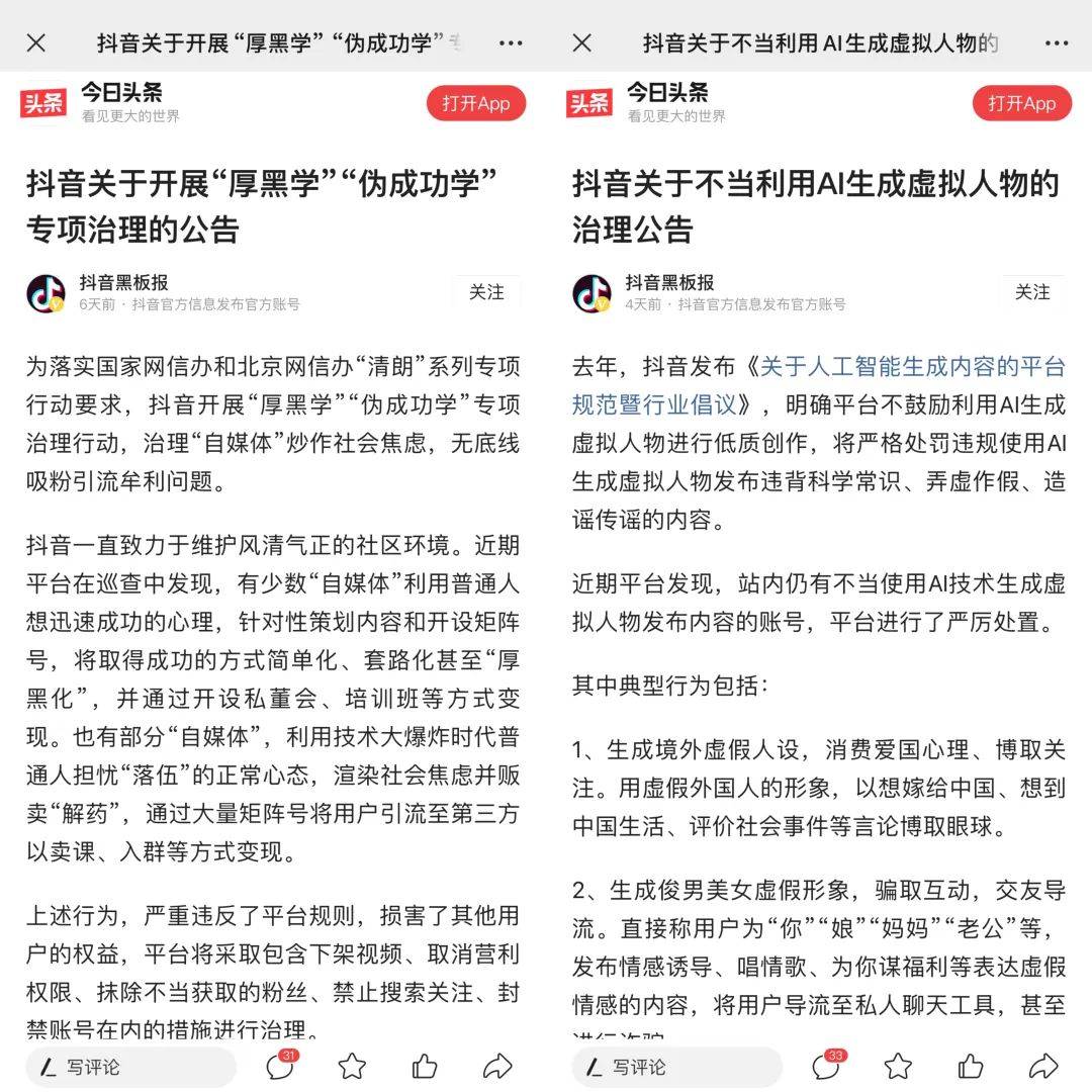 作者 | 小八 编辑 | 松露 来源 | 新榜 又一批账号在抖音“凉了”。 近期,“李一舟”、“海参哥”、“dada”等多个知识付费类博主的抖音主账号无法被搜索,以切片分发为主的矩阵账号也“所剩无几”。 ![]() 此外,一些不当利用AI生成虚拟人物的账号内容也被抖音平台下架,比如生成境外虚假人设博取关注,生成俊男美女虚假形象交友导流,或者生成精英人士虚假人设发布伪成功学等不良内容。 这一批账号被整顿,是抖音向“割韭菜”内容的一次重拳出击。 3月25日-3月26日,抖音接连发布两条治理公告,分别是专项治理“厚黑学”“伪成功学”,和不当利用AI生成虚拟人物。在公告中,抖音提到这两类账号共同存在低质吸粉、引流卖课等“割韭菜”行为。 ![]() 接连两条治理公告,引起从业者广泛讨论,更有博主称之为“知识付费大地震”。 这批被治理的账号内容存在哪些违规之处?本轮治理对抖音内容生态将带来哪些影响?知识付费和AI赛道的从业者如何进行良性合规的内容创作? 抖音对“割韭菜”内容重拳出击 199元的AI课,不仅让李一舟被戏称为“AI教父”,也让借炒作社会焦虑卖课的这门灰色生意浮出水面。 ![]() 左:OpenAI创始人奥特曼,右:李一舟 今年2月,Sora爆红出圈,以卖AI课程出名的李一舟也成为了话题焦点,其带货橱窗上架的“每个人的人工智能课”售价199元。新榜旗下抖音数据工具新抖显示,近一年来,该课程预估销量近25万份,其直播累计预估销售额近5000万。 据新榜编辑部实测,发现李一舟的AI课中频繁传递着焦虑情绪,比如“AI越来越像人,再不学就来不及了”,“抓住AI这个风口,就抓住了钱袋子”等。 由于AI课程质量并非如李一舟宣传的深度专业,不少网友质疑他是在“割韭菜”。不久后,李一舟的AI课程被全网下架。 AI课程并不是李一舟涉猎的第一个知识付费项目,此前他分享过短视频实操、IP案例拆解等相关知识,旗下名为“一舟一课”的付费课售价达到2980元,主要通过短视频吸粉和直播间投流拉新的方式,完成课程销售转化。 ![]() 2022年5月,李一舟在视频中透露,“一舟一课”的用户已超2万名 相比于动辄百元、千元的付费课程,常以万元为加入门槛的私董会显得更具“格调”。 私董会,又称私享会,通常是指不同公司的负责人聚在一起,进行资源分享。随着互联网发展,私董会的组织成员也更加网红化,比如今年1月与周鸿祎“互怼”的程前,旗下的私董会名为“等贤研习社”,每年入会费达到5.98万元。 然而,一些创办私董会的网红利用普通人想迅速成功的心理,将取得成功的方式简单化、套路化甚至“厚黑化”,只追求商业变现,导致私董会质量参差不齐。 以抖音本轮治理中被限制搜索的“海参哥”为例,他因卖海参得名,曾推出过付费财商课、情商课,并通过线下课引流用户加入私董会。他曾在推文中表示,自己的私董会中有2000个创业者,按照每位8万元的价格计算,仅这一块的收入达到1.6亿元。 但据鞭牛士报道,有网友举报“海参哥”以“湾流企业家联盟”名义进行私董会招生,但“海参哥”却无法提供这个所谓的“企业家联盟”组织的合法性证明。 ![]() 值得一提的是,从“李一舟”到“海参哥”,在布局内容时都开设了大量矩阵号,用于传播切片视频,粉丝量从十万到百万不等,目前这些矩阵号基本都被抖音限制搜索。抖音官方也在“厚黑学”“伪成功学”的专项治理公告中提到,平台将采取包含下架视频、取消营利权限、抹除不当获取的粉丝、禁止搜索关注、封禁账号在内的措施进行治理。 除了以真人出镜的形式贩卖“厚黑学”之外,也有账号借助AI生成虚拟人物进行低质创作,发布违背科学常识、弄虚作假、造谣传谣的内容进行“割韭菜”。 比如有账号通过AI生成外国人形象,并让其用英语朗诵鸡汤文案:“做人的十大原则”、“人性的八大认知,全看透你就活明白了”等。一些对AI不甚了解的用户可能会对这类账号内容信以为真,从而被引流至推销课程。 ![]() 今年春节期间,乌克兰网红Olga Loiek曾发布过一条题为《我在中国被人克隆了》的视频,表示自己的脸和声音通过AI技术出现在数十个中国视频账号中,并进行带货,粉丝量超过20万。 ![]() 此次抖音专项治理不当利用AI生成虚拟人物的公告中提到,将重点治理利用AI生成假外国人、假精英及利用AI生成形象骗互动等三类内容。同时,抖音还利用模型、技术识别能力等手段,进行长期系统的识别发现和处置。 据新榜编辑部观察,目前AI生成的大多数抖音视频下方都会出现“内容疑似AI生成,请谨慎甄别”的提醒。 行业大地震后,从业者如何高效长期经营 抖音治理新规一出,陆续有博主表示受到影响,其中知识付费博主的波及范围更为广泛。 除了“李一舟”、“海参哥”等头部知识付费博主,一些粉丝量几万到几十万的中腰部博主也被封号限流,或被店铺扣分下架商品,被形容是“知识付费大地震”。其中有些博主表示自己是被“误伤”,随即调整内容,并向抖音提出申诉以求恢复账号正常运营。 据新榜编辑部观察,虽然抖音发布了专项治理公告,但并不是对知识付费赛道进行全面“封杀”,而是通过建立更完善的规则制度,使其健康长久发展。 某知识付费博主向新榜编辑部表示,此次治理重点是不要向普通人贩卖焦虑,更不要过度渲染“我通过某种方式赚到钱/获得成功,只要你向我学习就能拿