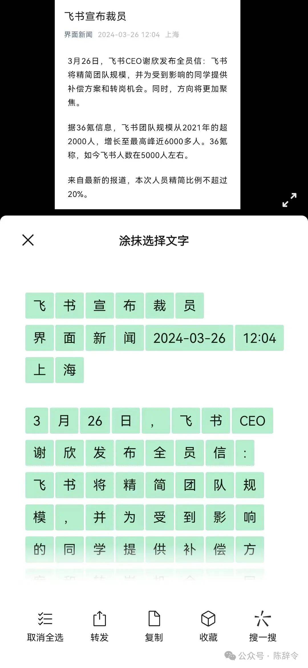 来源:陈辞令 你平时都用微信干什么? 你可能会说,还能干嘛,聊天呗。 哦,还有付款。 但你知不知道,现在已经有很多人把微信用成了效率神器、用成了自己的随身助理? 其实你只要好好用好微信,你压根不需要在手机里下载那么多各式各样的APP。 今天就把大神们都在用的8个微信隐藏功能分享给大家。 收藏好这篇文章,认真用起来,你也将拥有一个口袋里的高效助理! 01、看一看 功能 在这里,你能看到你的微信好友“在看”的文章。 思考下,你在什么时候会给一篇文章“在看”? 我相信,一定是你觉得有价值、有启发(比如我的这篇推送),或者能够彰显你的个人品味的…… 当你的通讯录好友足够高能时,这相当于你的好友们帮你完成了一次信息的过滤和筛选。 如果你觉得朋友圈越来越没有营养了,不妨到这里来转转。 02、重要消息提醒 有些消息,你当下不能马上回复,但又怕忘记,这时候,就可以使用消息提醒功能。 长按消息2秒,点击提醒,设置提醒时间,时间一到,微信就会给你发通知了。 ![]() ![]() ![]() 03、待办事项 点击收藏→+→记录待办事项,记录好后,点击右上角“…”,选择“在聊天中置顶”。 ![]() ![]() 04、微信指数 可以通过小程序或者“搜一搜”进入。 我主要通过微信指数,看对标的职场自媒体的实时数据。操作起来非常简单,打开微信指数,输入你要搜索的关键词,就能看到对应的微信指数。 ![]() 还能看到流量是数据来源,通过这个比例,通过微信指数*数据来源比例,你就可以计算出在每个渠道的流量了。 ![]() 05、图片生成EXCEL 在微信中,无论是发送还是收到含有表格的图片,都可以转换为 Excel 表格。 长按图片,点击“搜一搜”,经识别后,微信便会自动将图片生成表格。 生成后的表格,可在腾讯文档小程序打开查看,并且还可以进行编辑,转发给别人。 ![]() 如此一来,如果在工作中遇到要将图片中表格制作成 Excel 的情况,就不必手动完成了,变得省时又省时。 06、通过单人群,建立资源管理系统 在工作中每天都要面临大量信息,统统放到文件传输助手,蛮烦又难找,散落在各个平台吧,通常收藏即冷藏。 这个问题只需要一个解决方案,那就是建单人群,具体操作步骤如下: 1、点【发起群聊】-【面对面建群】,随便输入一个数字; 2、点【进入该群】,这时你就拥有了一个只有你自己的群聊; 3、把群名改成相应的功能名称,比如【文章素材】、【视频素材】、【稍后阅读】、【内容灵感】等等; 这样,每一个单人群都是一个资料库,你要做的就是将日常刷到的内容按需收纳,后期整理超级方便。 ![]() 07、提取图片文字 对方给你发了一张截图,你还在一个字一个字敲出图片上内容吗? 先点开图片,再长按图片,就能看到【提取文字】选项。 ![]() 点击之后微信就会自动帮你提取出图片上的文字,涂抹选择你需要的文字即可,也可以点击左下角全选,复制转发超方便。 08、锁屏 电脑和手机同时登录微信,上厕所时刚蹲下来,想起来电脑忘记锁屏了,害怕聊天记录被人看到? 点击手机端上方的“Windows 微信已登录”小横条,点击“未锁定”,即可快速锁定电脑端微信。 ![]() ![]() ![]() 以上,就是今天给大家整理的 8 个微信实用小技巧,你知道几个?又觉得哪个最实用呢? 文章来源:“陈辞令”,未经允许不得转载。 文章代表作者观点,版权归原作者所有,热传平台仅提供信息存储空间服务。 |
