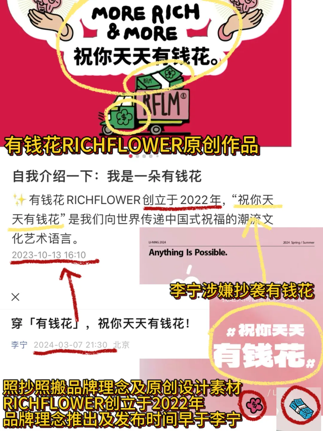编排 | 日尧 审核 | 日尧 作者 | Hiu 来源 | 互联网品牌官 01 没想到度过寒冬(春节)之后,国民运动品牌李宁又快速迎来了多事之秋。 近日,市值“闪崩”2100亿的李宁传出了将私有化退市的消息,这对资本来说或许是打破李宁股价跌跌不休尴尬局面的好途径。 而另一个消息则要负面得多,也是映照李宁市值如过山车般直插谷底的一个缩影。 在上个月,原创IP有钱花RICH FLOWER在小红书发布了一篇质疑李宁涉嫌侵权抄袭的帖子,并附上了系列截图佐证。 ![]() ▲ 图源:小红书@RICH FLOWER 据《互联网品牌官》了解,有钱花RICH FLOWER是一个创立于2022年8月,有注册商标及进行版权登记的的原创IP品牌。其以REMIX花和钱币为视觉符号,以“祝你天天有钱花”为文化语言。 而涉嫌抄袭的#李宁征程嘭嘭鞋#则是在3月初发布的一款鞋子单品,当时李宁官方还在多个社交平台发布了相关的图文宣传。 李宁很“敢”、很“省事”,文章标题直接用有钱花RICH FLOWER“祝你天天有钱花”这个品牌理念。 ![]() ▲ 图源:小红书 如果说这句话很稀松平常,如有雷同也很正常,那么越往下看发现事情越不对劲。 从商品详情页,到产品鞋身采用的设计元素,不能说是相似度极高,只能说是一模一样。 ![]() ▲ 图源:小红书 在电商平台李宁旗舰店,该款商品名称也是直接附上“有钱花”的品牌名,不知道的还以为是这两个品牌新推出的联名款呢。 ![]() ▲ 图源:淘宝 若要谈论李宁和有钱花RICH FLOWER这两个品牌的知名度,相信得出的结论必然是前者无人不知,后者鲜为人知。 这是一个声量弱者向声量强者维护自己合法权益的行动。 仅按照有钱花RICH FLOWER披露的“证据”,李宁确实是理亏的一方,很多网友都表态支持原创,支持版权持有者有钱花维权。 ![]() ![]() 只是截至目前,都没能等来李宁官方的正面回应,反而是将相关的产品和宣传物料通通下架了,现在已经“查无此鞋”了。 而有钱花RICH FLOWER这边也删帖了,不知道双方是否私下谈妥了,还是出于其他什么原因。 02 这不是李宁首次“栽倒”在产品设计上。 作为曾经的国货骄傲,李宁借着“国潮风”收割热度的同时,也惹出过不少争议事件,甚至是遭受舆论口诛笔伐。 最轰动的莫过于在前年那场“2022逐梦行机场大秀”上,一组以橄榄绿为主色的服饰,其相关设计及造型被指疑似日本军服。 ![]() ▲ 图源:李宁 一时间,李宁被推上了风口浪尖,引发全网热议。 面对甚嚣尘上的纷杂舆论,李宁某电商高管在朋友圈称,这是来源于中国古代文化。并表示,“我们的消费者,对于中国文化的沉淀,教育知识的传承还是少了……” 李宁官方在大秀结束近一个月的时间节点才出来回应,表示“将虚心听取各种声音和反馈,做出让消费者更加认可的产品”。 ![]() ▲ 图源:李宁 不管李宁原创设计的灵感来源于何处,从这批衣服在直观上让人感到“有伤民族情感”倾向的那一刻起,这场大秀就已经“失败”了。 诸如此类的争议性设计事件,暴露出李宁在内部管理上存在诸多问题和漏洞,与此同时,李宁的危机公关又反应迟钝。 正所谓,一步错,步步错。 去年年底,子品牌中国李宁又奉上了一批迷之设计作品。设计师将该品牌最具辨识度的Logo无限缩小缩小再缩小,到了但凡肉眼能看出这个Logo都算它输的程度。 ![]() ▲ 图源:小红书 其他品牌特别是奢侈品牌,Logo有多大放到多大,要么就是恨不得铺满整个版面。 ![]() ▲ 图源:Nike 李宁倒好,反其道而行之,生怕别人看出是“中国李宁”。 ![]() ▲ 图源:小红书网友 2018年纽约时装周上,番茄炒蛋配色套装叠加胸前让人眼前一亮的“中国李宁”Logo,让李宁误打误撞踩中了大众投射在这四个大字上的文化自信,刷爆全网。 ![]() ▲ 图源:李宁 如今热度早已不复当初,李宁要搞颠覆、创新来维持子品牌的运动潮流路线是好事,但麻烦品牌也倾听一下消费者的声音,不然创新很容易变“创飞”。 再者,李宁一心借助这波国潮红利来实现品牌的高端化,换句话说就是将产品卖得更贵了,这属于还没锻造出深厚功力就想“原地起飞”。 当国潮热过去,缺乏以产品研发、设计语言、渠道管理、消费体验与服务等形成的品牌价值作支撑的高价格,必然会遭受来自消费市场和资本市场的反噬。 03 人们常用“三十年河东三十年河西”来感慨世事盛衰无常。 这句话套用在中国运动品牌曾经的王者——李宁身上最为贴切了。 首先,品牌创始人是“体操王子”李宁,可谓是含着“专业运动”基因这条金钥匙出生。 对于运动品牌来说,任何渠道广告的力量都比不上品牌服饰直接出现在专业赛事赛场上、直接穿在专业运动员身上更具说服力。 创立初期(李宁成立于1990年),李宁接连在几场国际运动大赛(亚运会和奥运会)上频繁刷脸。在连续成为四届奥运会领奖装备赞助商后,李宁成为了国内运动品牌的领头羊,也是值得国人骄傲的民族品牌之一。 但商场如赛场,即使是非常优秀的运动员也会遭遇不在状态的时候,何况是充满竞争与未知数的商场。 随后这些年,专注于专业运动领域,以收购的方式充实产品线的李宁彷佛陷入了一个怪圈——品牌战略定位一直摇摆不定。导致在2008年北京奥运会后,李宁进入了长达10年跌跌撞撞的摸索期。 直到2018年,李宁抓住了一个意料之外的机遇,让其逆风翻盘。 就是上面提及的纽约时装周,在此之后李宁如坐穿云箭,“中国李宁”四字Logo引