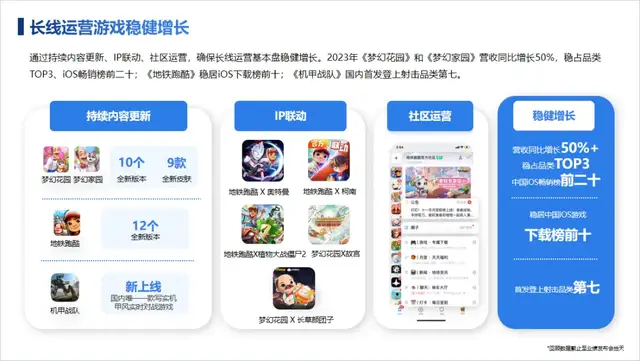 来源:互联网怪盗团 最近几年,游戏行业逐渐形成了两个共识:第一是游戏的精品化,绝大部分走模仿、跟风、拼凑路线的新产品已经没有出路了,唯有创新性或完成度较高的优质产品才能在市场上生存。第二是国内市场与出海的并举,要获得更高的增长潜力就必须出海;同一款产品,若能在国内和海外市场同时打开局面,对游戏公司而言无疑是最好的。如果还有什么新趋势,那就是AIGC的深入,它在降低成本、提升收入、加强用户黏性等方面都体现出了举足轻重的影响力,而且这个影响还刚刚开始,将在未来多年潜移默化地体现出来。 公允地说,上述趋势似乎都更有利于“大厂”,中小型及垂类自研公司似乎处于不利地位。在资本市场看来,游戏行业值得投资的无非是极少数头部公司,除此之外的公司均被遗忘或选择性忽视了。不论在一级市场还是二级市场,“精品自研游戏公司”这个分类还存在吗?答案似乎是否定的。 然而,游戏是一个内容行业。内容行业虽然也有马太效应,但决定产品质量和公司成败的不仅是资源规模——否则当初我们就不会看到以米哈游为代表的“上海四小龙”的涌现,近年来也不会看到鹰角、库洛等新兴二次元CP的崛起了。在高度成熟的欧美及日韩市场,也不会每年都出现这么多新兴自研公司了(Steam资深用户应该对此颇有感触)。游戏是一个需要自下而上分析的赛道,决定一款产品成败的因素相当多,事在人为。所以,规模不能决定一切,垂类公司永远有生存壮大之道。我觉得,刚刚发布2023年财报的创梦天地是一个很好的切入点,是当前市场环境下的精品自研游戏公司的一个典型案例。 2023年,创梦天地的营业收入19.2 亿元,经调整毛利率同比上升了1.3个百分点,经调整利润扭亏为盈。这一方面是由于聚焦于重点游戏、减少非重点游戏的运营,另一方面得益于成本费用(尤其是营销费用)的有利控制。从财务数字中,折射出了创梦天地这家游戏公司的三个特点: 第一,核心产品的生命周期很长、用户黏性很强,例如《地铁跑酷》《梦幻花园》《梦幻家园》等休闲产品,上线超过7年还保持着稳健的收入增长,构成了公司收入的“压舱石”。有人可能认为,休闲产品的生命周期本来就很长,这不足为奇;可是只要我们看看App Store休闲类游戏榜单就会发现,能够连续3年位居前列的产品就堪称不朽了,遑论7年!2023年,《地铁跑酷》稳居中国iOS游戏下载榜前十;“梦幻系列”游戏营收较2022年同期激增超50%,稳占品类TOP3、iOS畅销榜前二十,令人印象非常深刻,充分地体现了公司的长线运营能力。 ![]() 第二,在重点品类、重点赛道具备较强的自研能力和创新能力,2023年的《卡拉彼丘》就是最佳证明。除了《卡拉彼丘》,在射击赛道上,创梦天地还拥有《机甲战队》(已上线)以及与腾讯联合研发的《三角洲行动》等产品(待上线);当然也不要忘记今年2月刚刚由腾讯代理上线的《二之国:交错世界》。深入了解上述产品,不难看到,它们都基于某一成熟品类进行了交叉创新和玩法创新: