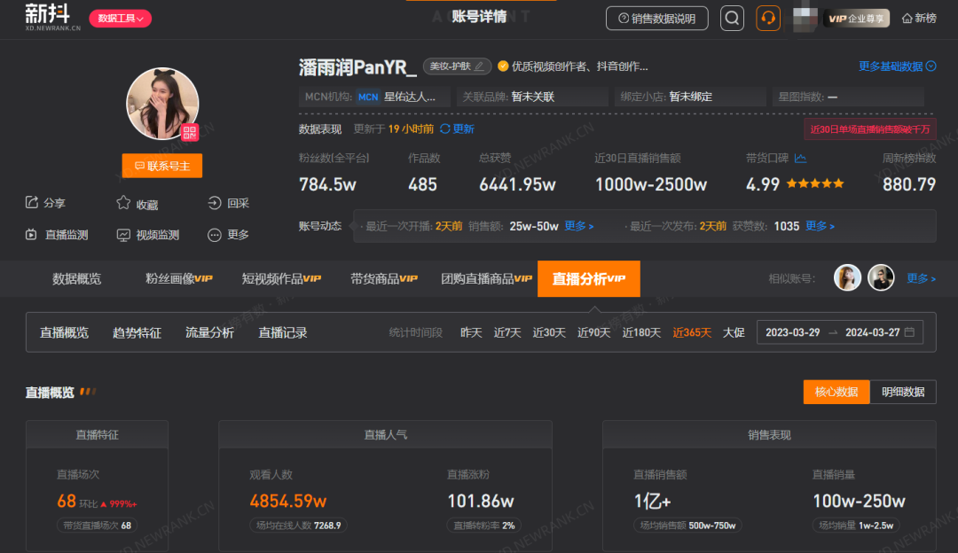 来源:新榜 美妆主播一年纳税近亿元,在抖音是怎样的水平? 不久前,抖音美妆带货主播“潘雨润”在视频中晒出自己的纳税金额,#潘雨润交了一个亿的税#相关话题火速登上各大平台热搜。 ![]() 视频中,她分享了自己的“成功心法”,并晒出金额达9503万元的个人纳税证明,称自己一直是顶格纳税。有网友按照个人所得税最高比例45%推算,其税前收入超2亿元。 ![]() 还有网友提出疑惑:“700万粉的博主就这么赚钱吗?” 新榜旗下抖音数据工具显示,“潘雨润”近一年直播带货预估销售额为6.2亿元。 与此同时,新榜编辑部拉取了2023年3月15日至2024年3月15日期间,抖音美妆垂类直播预估销售额最高的十位主播账号数据。 数据显示,潘雨润并不是抖音上最赚钱的美妆主播,达人粉丝量与带货成绩有一定关联,但并不是完全成正比关系。 那么,“潘雨润”在抖音美妆带货届处于怎样的水平?究竟谁是抖音美妆带货的“一哥一姐”?他们都是如何赚钱的? 自曝纳税近亿元,潘雨润是如何走红的? 冲上热搜的潘雨润,是抖音头部美妆带货主播之一。 2018年,“潘雨润”开始发力短视频,分享护肤心得等变美相关内容,用一年多的时间积累起百万粉丝,此后在2020年开始入局直播带货。 ![]() 不过,比起美妆内容,粉丝似乎更爱看她分享成功经验和人生感悟。 比如,这次冲上热搜的纳税话题是她在一条主题为“高效人生模型”的视频中,晒出了个人纳税证明(目前视频中的纳税信息已删除),并在视频中分享了自己成功的底层逻辑:“在身心健康、长得漂亮和武装大脑的基础上,继续积累财富和人际关系,实现生命绽放。” ![]() 这并不是她第一次分享个人财富密码,此前,她还在类似分享成功经验的视频中晒出存款证明,掀起了一波流量高潮。 数据显示,“潘雨润”近一年发布了331条作品,平均每条视频获赞1.8万,获赞最高的10条视频中,以分享财富密码为主的非美妆内容占到一半以上。 “潘雨润”抖音主页信息显示,她发布的“清醒美女有人爱”系列更新了10集,累计播放超4723万,近期更新了5集的“高能量养成法(实操版)”播放量超2055万,这两个系列多条视频获赞超20万,远超视频点赞量平均水平。 鲜明的观点和清晰的表达让她积累起一批忠实粉丝,不少网友会在评论区自发整理“潘雨润”视频中的要点笔记,表示对这类系列视频的喜爱。 ![]() 短视频积累起流量后,直播带货则让“潘雨润”的网红之路更上一层台阶。 2020年11月,“潘雨润”正式进军直播带货,数据显示,2020年11月18日当天,潘雨润直播带货的预估销售额达544万元,累计场观超34万。 进军直播不算早的她,没有选择主攻国际大牌,而是与时光肌、花西子和珀莱雅和OGP等国货品牌长期合作,创下不俗的销售战绩。 数据显示,“潘雨润”曾把时光肌OGP一款价格6888元的家用美容仪套装卖出上万件,单品预估销售额近1亿元。 与此同时,“潘雨润”也在向抖音美妆带货一姐的位置发起冲击。 2019年至2022年,她的抖音粉丝量完成了从百万到500万的跃升,截至发稿前,其抖音粉丝量达784万。 数据显示,“潘雨润”近一年直播带货68场,累计场观超4800万,直播带动账号涨粉超百万。 ![]() 数据显示,2023年3月15日至2024年3月15日,在美妆直播带货赛道,按照预估销售额排名,“潘雨润”以近一年预估带货6.2亿元的战绩排在第四位。 粉丝量≠带货能力,哪些美妆主播在闷声发财? 有不少网友被潘雨润的吸金能力所震惊,并提出灵魂拷问:“700多万粉的博主这么赚钱吗?” 实际上,在美妆赛道,粉丝量和带货能力无法直接挂钩。 比如,排在潘雨润之前,粉丝量千万出头的“搭搭”近一年直播带货预估13亿元,拔得抖音美妆赛道的头筹;粉丝近两千万的“骆王宇”,则以10亿元的成绩位列第二位。 他们均是通过短视频吸粉,并在2020年发力直播电商,其带货成绩差异的根本,或许在于粉丝画像。 与“大狼狗夫妇”和“彩虹夫妇”等抖音夫妻档主播相似,“搭搭”和老公被网友们称为“随便夫妇”。他们通过分享日常生活和恩爱瞬间吸粉,在2020年初粉丝量突破百万,并在疫情期间开启直播带货。 “搭搭”用四年多的时间,完成从百万粉达人向千万粉主播的身份蜕变,积累起一批具有消费力的粉丝。数据显示,“搭搭”的女粉比例达80%,31岁到40岁的粉丝最多,占比近40%。 ![]() 相比之下,“骆王宇”的主力粉丝人群更年轻。 数据显示,“骆王宇”女粉比例为82%,18到23岁年龄段粉丝最多,占比超41%。 ![]() 作为资深线下美妆顾问,2019年,骆王宇凭借专业的护肤知识在自媒体领域崭露头角,2020年进军直播带货后,他一步步走向抖音美妆“一哥”的位置。 其主页显示,他发布的“护肤速成班”和“祛痘去闭口”系列视频播放均超2.6亿。数据显示,“骆王宇”近一年直播78场,累计场观超8761万,也是近一年美妆直播带货预估销售额Top10主播中,唯一一位美妆达人出身的男性主播。 美妆作为电商强势赛道,也吸引着明星争相入局。 在近一年美妆直播带货预估销售额Top10主播中,出现了演员“千惠在这里”、演员“四火姐姐”张棪琰和前央视主持人“李小萌”的名字。 比如,“四火姐姐”曾饰演过《琅琊榜》莅阳长公主和《知否知否应是绿肥红瘦》反派康姨妈等角色,在2021年便入局淘宝直播,公开数据显示,2022年她在淘宝进行了206场直播,达成GMV破亿元的成绩。 2022年入局抖音直播的她,主攻护肤产品高端