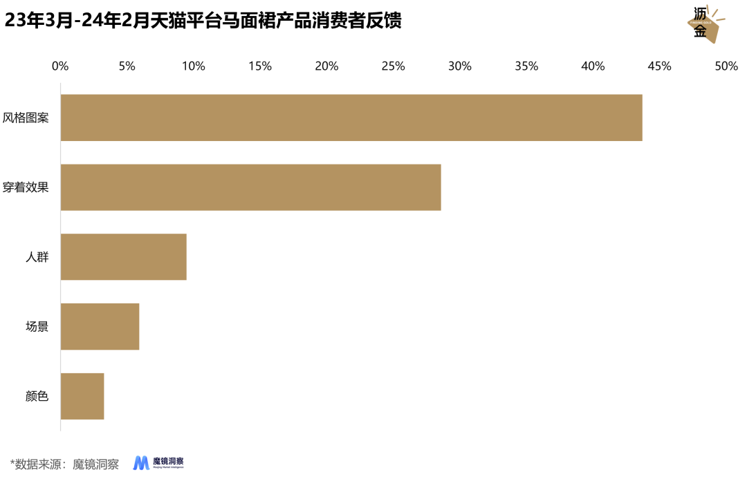 2024年开年最爆的服装品类是啥? 马面裙当仁不让。 从迪奥文化挪用事件爆发,海外留学生穿马面裙上街游行,到明星穿着它走上红毯。 这个品类从去年火到了今年,不仅横扫各大时装周,还成了不少国人的新年战袍。 今年前两个月,马面裙光线上就卖了近7个亿,同比暴涨560%,增速十分迅猛。 卖马面裙的商家更是赚得盆满钵满,头部品牌光线上去年就卖了1.4个亿。 线下服装厂的缝纫机都被踩冒烟了,很多江浙沪原来做窗帘的厂子,都纷纷靠改做马面裙而起死回生。 那马面裙为什么会成为全民大爆款?品类规模有多少,增速又如何?哪些品牌挣到了热钱?哪些方向还有赚钱机会? 为回答上述问题,魔镜洞察X沥金对淘宝、天猫的马面裙市场进行了深入分析和研究,以下是结论总览: 1. 基本盘:马面裙线上市场销售规模为23.5亿元,同比暴涨503.1%,淘宝是核心渠道,市场占比高达60.2%。 2. 爆火原因:一是迪奥事件引发舆论热议,明星和网红带货提高知名度,长期的高曝光推动了马面裙走进大众视野;二是年轻人普遍拥有极高的文化认同感,引领国潮高增长;三是马面裙对身材要求低,且改良后更方便日常穿着,可搭配性和实用性极高。 3. 品牌格局:品牌集中度持续下降,由29%下滑至14%,马面裙市场高度分散,头部品牌话语权较弱,竞争较为激烈。 4. 产品机遇:马面裙穿着场景日常化、大众化。颜值是消费者购买的核心动机,颜色、面料方面仍有优化空间。 01 基本盘:迪奥引爆马面裙热,销售额涨超500% 先来看看马面裙是怎么火起来的? 2022年上半年,马面裙的话题热度仍处于较低水平,7月爆发迪奥事件,瞬时激起马面裙话题的高互动量,也让更多汉服圈外的人认识了马面裙。 ![]() 2022年1月-2024年2月社媒平台马面裙话题声量及互动量走势 得益于此次事件的高话题度和曝光量,自22年7月起,马面裙的热度也逐步增长,经历了22年下半年的蓄水期后,在2023年迎来爆发式增长。 回到销售侧来看,马面裙事件对品类销售的影响则略显滞后。 2022年11月,社媒的曝光叠加大促让马面裙市场销售迎来了第一个峰值。随后在社媒热度的持续积累下,马面裙销售和社媒热度实现了双开花,二者相辅相成、同步增长。 ![]() 2022年3月-2024年2月线上平台马面裙市场整体销售走势 再来看近一年的销售走势,23年3月-24年2月,马面裙的线上市场规模达到了23.5亿元,同比增长503.1%。 品类均价也由219.9元降至196.6元,价格的小幅走低也降低了马面裙的尝试门槛,推动了品类受众的增长。 ![]() 2023年3月-2024年2月马面裙市场平台分布及增速 从马面裙的线上渠道分布来看,淘宝是市场核心平台,市场占比达到60.2%,大量汉服原创品牌都集中于淘宝平台。 天猫平台增速相对较高,一方面是汉服品牌的正规化,旗舰店数量增长,另一方面是马面裙的火爆引发部分女装品牌重视,尝试推出马面裙单品,带动天猫平台的销售增长。 结合社媒侧及销售侧表现,马面裙的爆火原因有三: 一是迪奥事件引发舆论热议,明星和网红带货提高知名度,长期的高曝光推动了马面裙走进大众视野; 二是年轻人普遍拥有极高的文化认同感,引领国潮高增长,不少年轻人还在主动分享、科普马面裙的知识,提高品类渗透率; 三是马面裙对身材要求低,且改良后更方便日常穿着,打破了传统服装的场景限制,可搭配性和实用性极高。 02 品牌格局:市场高度分散,头部品牌更替较快 接下来看马面裙市场的品牌格局。 从体量占比较大的淘宝、天猫市场来看,品牌集中度(CR5)持续下降,由29%下滑至14%,马面裙市场高度分散,头部品牌话语权较弱,竞争较为激烈。 市场入局门槛并不高,在头部品牌尚未形成规模的当下,仍留有一定入局机会,审美和产品力则是中小品牌突围的第一奥义。 ![]() 2021年3月-2024年2月淘宝天猫平台马面裙市场TOP5品牌市场份额 从TOP5品牌变化来看,21年十三余品牌份额高达14%,23年则由织造司主导市场,头部品牌高频更替,市场竞争难度较大。 整体而言,消费者对马面裙品类没有较高的品牌认知,更多地还是依靠款式进行消费决策。 对品牌而言,设计能力是首位,在社媒传播的助力下单品能够迅速打开市场,但稳定发挥的审美设计确实一大难题,一旦款式颜值及上新频率降低,则极有可能落后于市场,被消费者所遗忘。 ![]() 2023年3月-2024年2月淘宝天猫平台马面裙市场TOP5品牌销售额价格段分布 从价格带分布来看,100元-300元是该品类的主力价格段。 从TOP5品牌的价格段分布来看,织造司、十三余品牌的价格更多元化,各价格段均有所涉及,但集中于200元-300元区间内。 京云染品牌定位相对高端,主要集中于400元-500元区间内,销售额占比高达75.2%。 京云染目前在售单品仅为5款,产品较单一,主打大单品策略,凭借较好的产品力和口碑在一年多时间内跻身行业TOP5。 03 产品机遇:颜值为核心购买动机,面料舒适度待优化 接下来聚焦评价维度,来看看消费者对马面裙的产品反馈。 ![]() 2023年3月-2024年2月天猫平台马面裙产品消费者反馈 23年3月至24年2月,天猫消费者对马面裙产品的评价总数在11W+。 颜值是购买马面裙的核心驱动因素,消费者反馈也集中于产品的风格图案及上身效果上。 ![]() 2023年3月-2024年2月天猫平台马面裙产品穿着效果维度消费者反馈 从穿着效果来看,马面裙较好的收腰显瘦效果受到大众的普遍认可。 此外,舒适度也是大众的重点关注,因马面裙穿着需要搭配内搭,贴身的