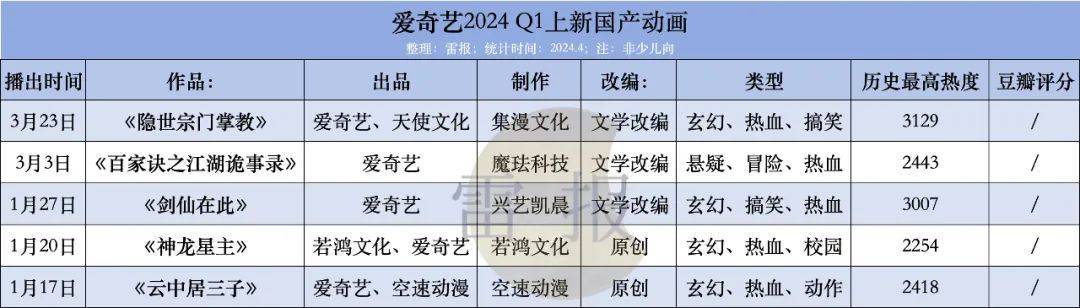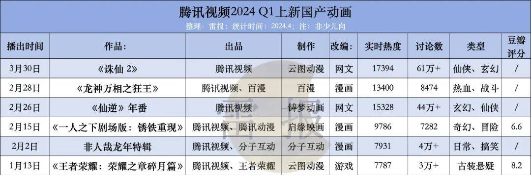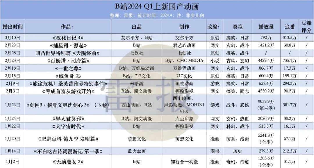 作者:晓艳 编辑:努尔哈哈赤 来源:雷报 进入四月,一季度已经宣告完结。对于国产动画(非少儿向)来说,包含了元旦和春节假期的新一年度前三月,“优爱腾B”几大平台的相关成绩、成果如何呢?又具体有哪些作品和大家见面? 总体来说,相比去年同期,合计数量基本持平,为29部,去年Q1为25部。 独播动画项目26部,相比去年统计更多。另外其中由平台出品的动画为25部,相比去年亦有所增长。 其中B站参与出品10部,腾讯6部,优酷4部,爱奇艺5部。 来看具体情况。 优酷:一季度《万古狂帝》《独步万古2》等作热度高,长篇动画持续吸热 统计今年一季度国产动画项目,非常显著的情况是:大家在新作的推出上都显得有些“疲乏”,即使面对着非常重要的春节等假期。 在这背后,是平台在花更多精力布局年番,抑或大体量的长篇类型动画。 ![]() 因为有着这些通过持续更新来陪伴用户的项目,新作是否上新也显得没有那么“重要”或“迫切”。平台有其“稳固”的基本盘。 譬如我们看到,优酷在一季度有着大量的项目在持续性热播,《百炼成神2》《师兄啊师兄2》《少年歌行海外仙山篇》《九天玄帝诀》《剑域风云》《真武巅峰3》《冰火魔厨2》《仙武传》,等等,其中不少作品目前仍在优酷平台内收获不俗热度。 可见重点项目的用户维护能力。也能够看到平台做长篇的合理及必要性。 ![]() 而今年一季度,优酷上新了《独步万古2》《太古星神诀》《圣祖》《万古狂帝》等一系列国漫作品。 其中《独步万古2》由优酷和索以科技出品,为新玄幻、无敌流、穿越题材动画;优酷和若鸿文化共同出品了《太古星神诀》《万古狂帝》两部,都为玄幻题材动画,前者包含了热血、古风的元素。 《圣祖》由优酷、书旗小说、以及超神影业联合出品,为新国风、仙侠神魔题材动画。 ![]() 网文《圣祖》为连载于阿里文学及旗下书旗小说的玄幻作品,作者傲天无痕。该作曾获第四届橙瓜网络文学奖最具潜力十大游戏IP。 ![]() 从热度来看,这些作品的历史最高热度基本都在4、5000左右,其中最高的是《万古狂帝》,第二是《独步万古2》。 B站:大批阅文合作作品上线,缺大作、“爆款” 和去年一样,致力做国创的B站在国产动画的推出上,在数量一栏又是“遥遥领先”。据统计一季度该平台上新了14部新作。其中11部为独播动画,平台参与出品10部。 ![]() 能够看到1、2月作品的上线频率还是很高的,但三月份更新速度大幅放缓。据了解目前平台已有多部作品定档二季度,不乏重点项目。 上新时间较近的《汉化日记4》由艾尔平方 、B站联合出品,为原创、搞笑的日常类动画,基调轻松,目前播放量接近800万,系列作品追番超300万人。艾尔平方为B站投资企业,腾讯也曾入股,公司曾出品《十万个冷笑话》《尸兄》《镇魂街》等知名行业项目。 于2月上新的《捕星司·源起》,由B站出品,君艺心动画负责制作,为玄幻、战斗类别动画,改编自网文作品,来自掌阅。君艺心文化的大股东即为北京不可能科技(原掌阅影业)。 君艺心动画曾制作《暗河传》《第一序列》,承接了知名IP《大奉打更人》的动画项目。 ![]() 《凹凸世界》特别篇《天陨终曲》由七创社出品,为原创,搞笑、战斗类型动画。 在平台小有名气的《百妖谱》迎来“司府篇”的开播,目前播放量为4429.4万,系列作品追番人数超过了700万。该作原作来自小明太极,动画由B站出品,B站和CMC MEDIA共同制作。 ![]() 《一世之尊》由B站、万维猫动画出品,万维猫动画制作,改编自阅文旗下起点中文网作品,为玄幻、战斗类动画。动画播放量目前为866.7万,系列追番17.3万,万维猫动画曾获B站投资。 作品《亏成首富从游戏开始》原作来自阅文,动画由B站、阅文动漫共同出品,福煦影视进行制作,为搞笑、励志题材。动画播放量超过了4500万,追番人数在90万人左右。 福煦影视还承接了于1月22日开播的《大宇宙时代》,由B站独家出品,原作来自原起点中文网白金作家zhttty的同名作品,科幻战斗元素+IP改编,为其创造500多万的播放量、超16万追番。 B站公司在福煦影视持股8%。阅文也曾投资该公司,当前为其第二大股东。 游戏改动画老面孔《剑网3·侠肝义胆沈剑心3》(下卷)由西山映画和B站出品,西山映画、声影动漫、MOHINI VFX制作,目前第三季的播放量为9039.9万,系列追番人数不俗,为381.7万。B站也是声影动漫的股东之一。 《异人君莫邪》由B站、阅文动漫出品,大呈印象制作,作品改编自起点中文网签约作家凌风天下小说《异世邪君》,为玄幻、热血题材。目前播放量为2000多万、30万追番。 《无脑魔女2》原作来自哔哩哔哩漫画,目前两季播放量为1303.6万,追番数达31.1万,该奇幻、治愈题材动画由B站出品,知行合一动漫进行制作。B站在该制作公司持股9%,为第二大股东。 3部非平台独播动画,其中《旅途危机!圣芙蕾雅号特别事件》为知名游戏“崩坏3”系列动画作品,由米哈游出品,画枚动画制作,为搞笑、日常类别,目前该作的播放量为600多万,追番近300万。还是能够看到人气游戏IP衍生作品的市场号召和吸引力。 《肥志百科第九季 发明篇》来自萌想文化,目前全季播放量为5241.8万,追番有67万,为萌系、泡面番;《不白吃古诗词漫游记 第一季》由重力聿画出品,为历史题材动画,篇幅短小,目前播放量为279.3万,有超200万人追番。 ![]() 从改编来源方面,能够看到B站和阅文进行了大量的