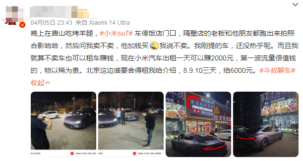 作者 | Hiu 来源 | 互联网品牌官 01 当一样东西初面世就取得了妇孺皆知的效果,无可否认,在某种程度上它是成功的。 没错,这里说的正是近期出尽风头的小米汽车。 小米汽车的火爆不仅惹得同行艳羡,致使它们纷纷都来贴身蹭一波流量,如今就连小米SU7车主也不例外。 随着小米SU7的交付,首批小米车主的赛博装逼终于来到了最高潮。 真车上手,流量与金钱全有。 当购买同级新能源汽车的车主还在分期付款的时候,第一批小米SU7车主已经在靠这台“电动玩具”变现了。夸张一点,只要后续的小米SU7交付慢一点再慢一点,首批小米车主甚至还能回本。 凭什么? 凭借雷神为小米汽车量身打造的“史诗级”营销剧本,让小米SU7一开场就达到了其他造车新势力前所未有的高度。 ![]() ▲ 图源:小米汽车发布会 在互联网端,一跃成为全民讨论度最高的一款车型;在线下体验店,等候试驾的消费者挤爆现场;在销售端,4分钟大定破1万,27分钟破5万,上市1天后,这个数字逼近9万…… 小米SU7的销量成绩很漂亮,而小米SU7在租赁市场上争取到的日租金更是漂亮。 据《互联网品牌官》了解,目前网络上已经可以通过个人或平台租赁小米SU7,日租金大约在1500元-5000元不等,具体根据所租赁的版本以及天数而定。 有汽车租赁方透露,目前小米SU7标准版日租价为2000元/天,Max版本为2500元/天。 ![]() ▲ 图源:微博网友 给不熟悉租车市场行价的朋友科普一下,在小米汽车发布会上被拿出来反复对比的保时捷Taycan租一天的价格大约在2000元左右,而特斯拉Model 3则为300元。 当然,拿刚上市的小米SU7与早已量产的其他品牌车型比较,得出来的这份价格,参考意义不大。 毕竟,目前的小米SU7还属于卖方市场,其稀缺属性势必会让其在市场上“享受”众星捧月般的待遇,租车价格自然也就水涨船高。 多个租赁方甚至反馈小米SU7还不一定有车,也就是说有钱也未必能坐上小米汽车的驾驶室。 好家伙,以前没钱买小米,现在有钱却开不上小米。 02 前人栽树,后人乘凉。 雷军在前方铺路,小米车主在后方万马奔驰。 这商业头脑了得,想必多多少少也受到了雷神的启发。 不过,更了得的还是那些靠小米SU7吃上了流量红利的博主,他们或是首批小米车主,或是小米租车服务的客户。 在抖音上,摇晃在镜头前的小米SU7就是最好的引流密码。 据一位汽车博主披露的2024年第14周国内主要新能源汽车品牌的交付数据,小米汽车以共交付了1093辆车的成绩杀入了榜单的前10。 ![]() ▲ 图源:和讯网 对于其他新能源汽车品牌来说,小米汽车这个交付数量无疑会对它们造成一定程度的威胁,但同样是这个数字,放在全国汽车保有量达3亿多辆的庞大数字中,几乎是可以忽略不计的程度。 正如上述所说的,物以稀为贵,这1093辆已经跑在大马路上的小米SU7无疑是一块巨大的香饽饽。 作为体验了千亿级别老板雷军特供的握手、合影、亲自送上车等一条龙服务的16位车主之一,抖音博主王化萌买小米SU7相当于买到就是蹭到、买到就是赚到。 近期,其个人抖音账号围绕小米SU7的短视频,点赞和留言都远超此前发布的其他汽车内容。一条标题“提到全国第一台小米SU7霞光紫,还有雷总亲自开门”的视频,点赞数更是逼近百万。在不到一周时间内,她的粉丝数量上涨已超10万。 ![]() ▲ 图源:抖音 此外,也有人直接“直播带货”小米SU7,如首批提车的博主“丸丸(玩机少女)”,通过一场向路人展示小米汽车的直播,吸引了近30万人围观,当场直播送礼人数超百人。 难怪她自己会发出“第一批买到小米SU7的已经回本了”的感慨。 ![]() ▲ 图源:抖音@丸丸(玩机少女) 还有更戏谑的,前段时间一辆运送小米汽车的板车在拥堵的高速上被围观,有网友称,板车被要求降速行驶,甚至还被“鼓励”在服务区休息。 别人家的产品需要打广告,而小米家这辆SU7本身就是行走的广告牌。 如今,开小米SU7出街,回头率远超引擎炸街的的超跑。 如此高的关注度,别说保时捷Taycan了,布加迪威龙看了都会“自愧不如”啊。 03 在去年接受央视《面对面》专访时,雷军曾表示,“我特别担心,(小米汽车)一上来不火,大家都不买。更担心的是如果大家都来买,这一等要等一两年,肯定会被骂惨。” 前一个担心,雷军可以先缓一缓了。 据界面新闻消息,近日通过实地走访北京多家小米汽车门店,了解到现在想试驾小米SU7的消费者较多,甚至需要与销售预约排期,有些比较紧俏的商超门店已经排期到一周后了。 ![]() ▲ 图源:微博网友 线下门店过于火爆也是小米汽车面临的一道难关,过长的等待时间很有可能会将消费者推向其他品牌,如有部分用户已经转向蔚来、极氪等品牌。 另一大问题就是雷军眼下最为担心的,产能能否跟上预期的交付时间,并且保障用户的交付体验。 这是摆在所有明星级别产品面前的共同难题。 去年一直被产能“卡脖子”的华为Mate 60便是最好的例子。而在汽车领域,或因为供应链与人力等问题,大部分车企都曾遭遇过这道难关。 刚好也是同一位,余大嘴带领的智界S7就在前段时间因订单火爆而陷入了“产能地狱”。即便强大如特斯拉,也难以逃出产能危机的魔爪。 ![]() ▲ 图源:智界汽车微博 按照规划,小米汽车工厂分两期建设。一期于2022年4月开工,2023年6月竣工,设计年产能为15万辆;二期计划于2024年动工,2025年完工。 雷军称,“满产情况下,小米汽车工厂每76秒就有一台小米S