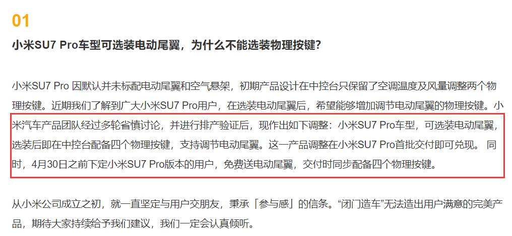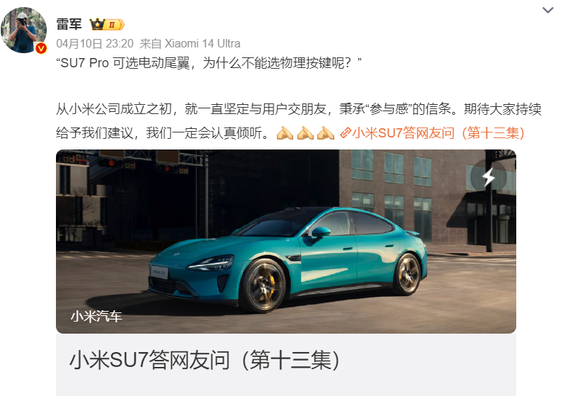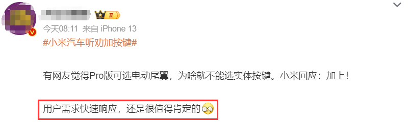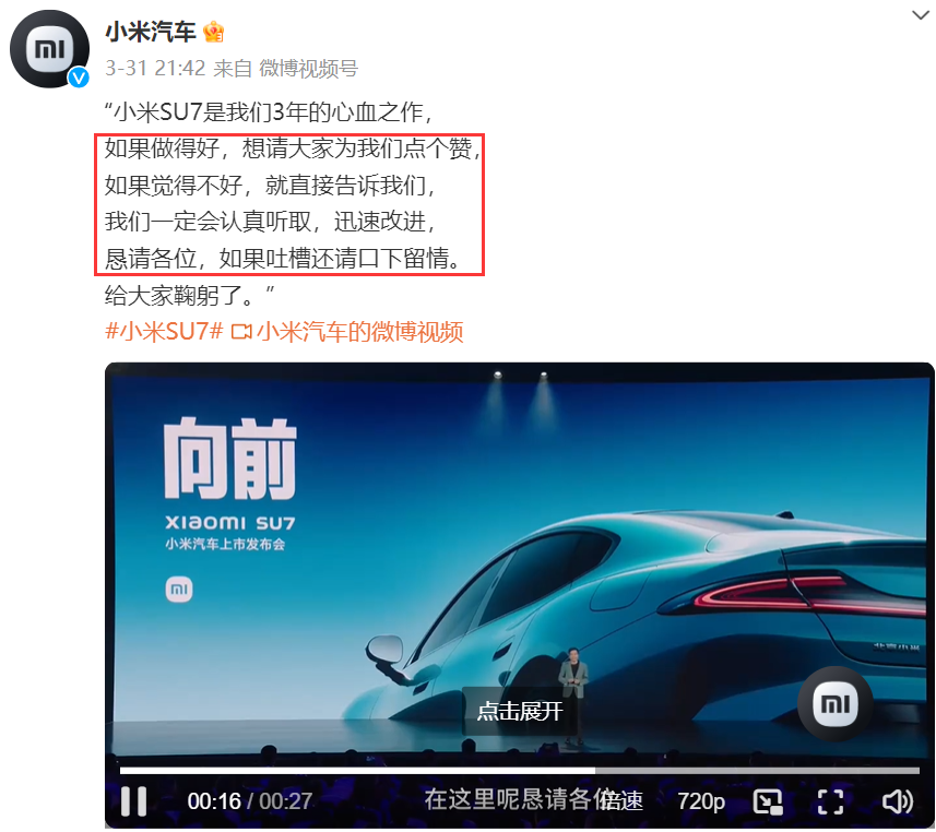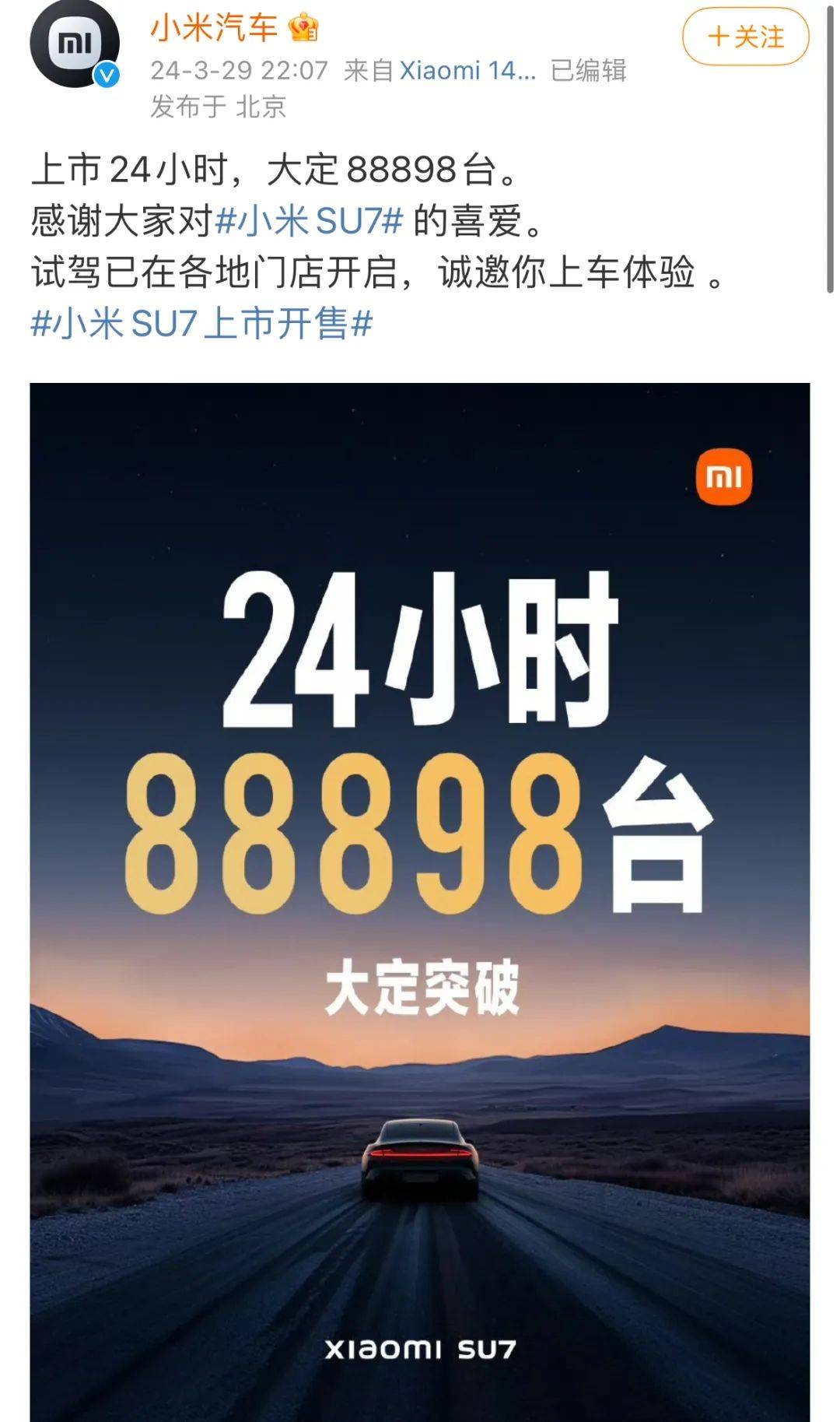 作者 | 兵法先生 来源 | 营销兵法(ID:lanhaiyingxiao) 长达3年的市场预热,小米汽车SU7终于在万众期待中“高调”上市,并取得了不俗的成绩。据悉,仅上线24小时,大定8.8万台,可见其产品受欢迎的程度。 ![]() 不仅如此,最近的小米汽车还是社交热搜榜上的常客,#小米SU7跑滴滴#、#小米汽车听劝加按键#、#小米汽车#、#小米汽车回应车摄像头#、#小米汽车颜色#等,给品牌带来了超高的话题讨论。 ![]() 在品牌纷纷造车的当下,为何小米汽车一上市,就获得了如此亮眼的成绩,它有哪些独到之处? 01、小米汽车的竞争力在哪里? 品牌备受关注与热议,其实就是产品本身有着自己的独到之处,让人眼前一亮,差异化的产品、人车家圈生态体验以及消费者关注的外观与续航,都让小米汽车的优势凸显。 在产品定位上,小米避开了现在电车行业流行的SUV、轿车赛道,而是瞄准了其他品牌不太关注的电动跑车赛道,5秒级别公里加速,让小米汽车与众不同,与竞品区分开来。 在用户定位上,小米汽车与其手机产品的目标受众如出一辙,瞄准了一群有梦想又追求高品质生活的消费人群。用极具未来科技感的设计,契合当代年轻人审美的高颜值产品,让有科技有品味的小米汽车成为大众讨论的焦点。 在产品体验的打造上,小米用AI大模型赋能,采用智能中控系统,给用户带来全车智能生态,打造了一体化的人车家生态体验,为用户提供了更加便捷智能化的生活。 为了凸显小米气汽车体验的独特之处,“人车合一,我心澎湃”的小米式文案,点燃了大众的热情,既展现了小米汽车更加舒适智能的体验感,又充满了情怀与激情。加上,9种颜色搭配,让小米汽车的话题性十足。 ![]() 除了差异化的产品、用户定位、智能体验外,究竟小米汽车还用什么拿捏了用户的情绪? 02、小米汽车拿捏用户的基本法则 在我们梳理了小米汽车的营销后,发现依然是参与感、用户思维、卖梦想与情怀、对标式定价策略,形成了小米营销的基本法则。 参与感:用“听劝”的方式吸引用户参与其中 当今时代,最热门的营销词语之一,可能就是听劝了 。小米的听劝,更是为品牌赢得了掌声。 发布会上,雷总提出,小米SU7是心血之作,如果觉得好,请大家点赞。如果觉得不好,请直接告诉我们。恳请各位,如果吐槽还请口下留情。让人觉得雷军的态度诚恳,能够接受不同的声音,对其好感度倍增。 ![]() 雷总在发布会上表态“一定会听取意见,并迅速改进”并不是营销话术,而是真的有认真思考、积极反馈与改进。在SU7上市后,有用户提出了这样的疑问,“Pro车型可选装电动尾翼,为什么不能选装物理按键?” ![]() 在回答网友13问中,品牌明确表示,会做出产品调整,且首批交付即可兑现。 ![]() 这一神操作,让#小米汽车听劝加按键#迅速登上了热搜榜。一时之间,好评如潮。 ![]() ![]() ![]() 外行人看热闹,而营销人特别喜欢深挖品牌行为背后的目的。首先,品牌鼓励用户提出意见,在用户真的提出自己的疑问后,品牌经过思考与探索理性做出回复与整改承诺,这一举动带给了消费者无数惊喜,仿佛用户参与到了小米汽车的设计中。回过头看,这不就是小米一直主张的参与感吗? 三年磨一剑,让用户参与到汽车的设计中来,甚至在汽车上市后,还能慎重考虑用户的意见,并为之付诸行动,这也正是小米的用户思维之一。用户至上,在更多品牌的视觉中,是营销语言,但不代表品牌行为。但是小米践行的用户思维,带给人实实在在的安心。 小米用户思维:既要又要还要 小米的用户思维,不仅在营造参与感上,还在用户需求上,也展现得淋漓尽致。 在用户的视角中,成年人不做选择,是全都要。面对用户“既要又要还要”的消费心理,小米汽车提出了“50万以内最好看、最好开、最智能的高品质轿车”愿景。 ![]() 并且上线了9款色系,让高颜值吸引年轻用户。5秒级别的百公里加速,满足了用户对速度的需求。有了高颜值、高品质、高智能化的多重加持,多维度满足了用户需求。 价格锚定,超出用户预期 听劝,是品牌最有温度感的行为,是当今时代的营销密码;而深知用户痛点,上线用户期待的产品,是成交的前提。有温度,有需求后,能够推动用户购买的,还是产品的价格。 小米品牌基因中最大的优势,可能就是高性价比了。小米汽车延续了品牌本身特质,通过价格锚定的方式,让产品从性能、颜值、细节等多方面超出用户预期,来推动成交量。 ![]() 而小米汽车价格锚定的方式,一是来源于友商;二是对标用户的心理价位。 面对竞品25万左右的汽车,SU7汽车提出了“比(友商)便宜”的心理感知,让人相信,小米汽车拥有极致性价比。同时,让用户感觉自己占了便宜。在SU7汽车的发布会上,通过展现产品的细节刺激用户下单,并提出“卖一台亏一台”,让用户相信买小米SU7就是买到了更实惠更适合自己更值得信赖的年轻态产品。 超出用户预期的产品,更容易产生口碑效应,引发更多人围观,进而扩发品牌的影响力、知名度等,成为大多数年轻人的心头好。 卖情怀卖梦想,也是小米拿捏用户的重要方式 懂用户、理解用户是小米,提供情价比更高的产品,也是小米俘获人心的又一法宝。 不同的消费者应该采取不同的营销方式,深谙营销之道的小米,在拿捏用户的技巧上,可谓轻车熟路。 从官宣造车到汽车上市的正式发布会,品牌提出了“为小米汽车而战”,这不像是营销,更像是小米与一群志同道