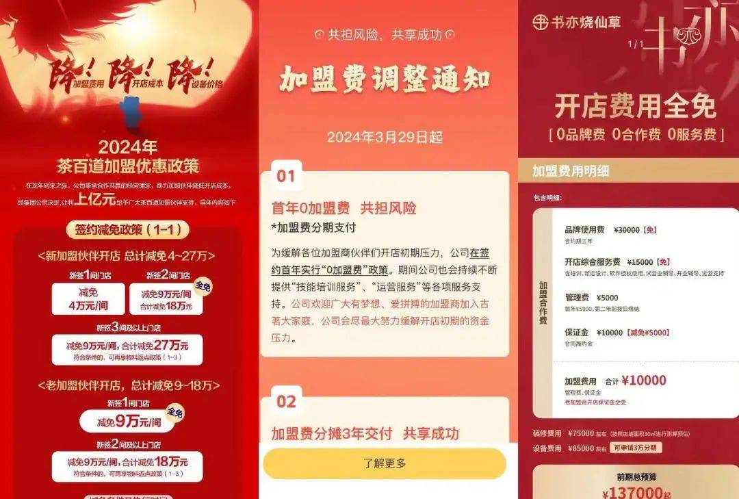 文丨黄小艺 来源 | 商业数据派 1999年的圣诞节,成都第一家麦当劳在总府路开业。在南方的湿冷空气中,副省长亲临、春熙路天桥大排长队的场面热火朝天,“3万人涌向麦叔叔”还登上了天府早报的头版头条。 25年晃眼一过,总府路仍然人潮汹涌,但这家麦当劳却宣告闭店,成为了时代的眼泪。 在总府路外的几百米处,一家更受年轻人们喜爱的“中国汉堡店”塔斯汀门庭若市,这个从低线城市起家的“肉夹馍版汉堡”,凭借着便宜、量大、吃了还不拉肚子,成了新宠儿。 一街相隔的麦当劳和塔斯汀之间,隔了两个时代。 前者见证了中国的消费升级,周边的房价翻了几十倍,而店内的汉堡价格只涨了一倍;后者享受着消费降级的红利,人均客单价只有10元出头,只相当于一杯麦当劳可乐的价钱。 前者花了33年才开到全球万店,一套SOP门店经营理论成为连锁餐饮行业的模范读物;而后者从2019年的100家店起步,5年开了7000家门店,病毒式扩张的速度是麦当劳的4倍,质量跟不上速度,“吃到生鸡肉”的事件时有发生。 ![]() “无加盟,不开店”,已经成为当下中国连锁品牌的一个缩影。 实体门店正在开店狂飙,不管是什么行业,似乎都开始了直营转加盟,加盟转强加盟的扩张之路。一位小微创业者告诉商业数据派,今年以来想要加盟做生意,目标品牌已经从奶茶、咖啡再到零食折扣店,甚至是洗车店加盟,全都看了个遍。 这些连锁品牌们的进度各不相同。跑得快的,有瑞幸、蜜雪冰城,靠加盟已经达到了2万上下的门店数量,成功上岸;而跑得慢的,则是在加盟招商的过程中不断降低加盟门槛,苦苦挣扎,不少品牌甚至逐渐被市场清退。 近年来,加盟为何遍地狂飙?现在还是不是一个好的加盟节点呢? 01、满大街,都是瑞幸和蜜雪的信徒 瑞幸和蜜雪冰城开启了品牌加盟的坐标系,两者靠着远超同行的开店速度,独霸了咖啡和茶饮界的Top1。 对瑞幸而言,关键的转折点是财务造假事件。在此之前,瑞幸咖啡以直营为主,“更侧重于通过直营模式来确保品牌的一致性和服务质量”;而在2021年之后,瑞幸咖啡转向加盟模式,门店数一路暴涨,起死回生。 在这个过程中,表面上,是加盟所代表的轻资产对直营的重投入的降维打击,实际上是,无法拿到投资人资助的瑞幸,收到了加盟商众筹的巨额救济金。 拿融资扩大直营不一定能赚钱,但加盟一定是稳赚不赔。 在消费投资的寒冬里,有限的资本和饱和的市场竞争者之下,茶饮品牌面临着和瑞幸一样拿不到钱的现状,加盟成了品牌们的救赎。 现如今,瑞幸和蜜雪冰城已经成功上岸,加盟申请表雪花般地砸向他们,但还有大把大把的连锁加盟品牌正在降低加盟门槛,“甩卖”自己。 以茶饮为例,迈进2024年,各大品牌都喊出了“0加盟费”的口号。 古茗宣布自2024年3月29日起,在签约首年实行“0加盟费”政策;书亦烧仙草直接推出“0加盟费、0服务费、0合作费”政策;喜茶推出合伙人2024年最新优惠政策,Q1签约的新店合作费全免… ![]() “0加盟费”的背后,是茶饮品牌对于扩张和增收的急迫。 在0加盟费的背后,加盟商仍然还要给品牌管理费用、装修费、原料费等等,耗资几十万元不等。 在小红书上,有关加盟的帖子已经高达158万个,如今到处都是招商经理们费尽心力伪装的加盟宣传。 例如,有的招商经理会伪装成素人博主,前期分享私人生活日常,后期突然开始发布加盟帖子,从假装正在纠结加盟,到分享自己加盟成功的经验等等,一个人演完一整部戏。 一般而言,总部都会给予这些招商经理各式招商指标和激励。据一位库迪加盟商告诉商业数据派,“每签约一家门店,招商经理可以获得7000元的提成。” “对实体门店而言,急于扩张无可厚非。毕竟单个门店的线下半径辐射有限,单店模型跑通后,往往只能通过复制店数继续扩大规模。”一位投资行业从业者说道,“而在当前低迷的背景下,直营成本太大、扩张太慢、市场太卷,加盟开店成了一种竞速比赛,已经开始从茶饮向着餐饮、零售等赛道不断蔓延。” 如今,奶茶行业正是古茗和茶百道在争夺“第三个万店品牌”和“新茶饮第二股”的名号。目前看来,古茗凭借门店数量9000余家,暂时领先,而在资本市场,茶百道将要率先登陆港股,最终打了一个平手。 不知何时,街上已经挤满了“XX界的瑞幸与蜜雪”。 02、新一轮的代理人战争 加盟商不只是行走的ATM,也是替品牌在一线厮杀的代理人。 沉寂三年,手握几十万元,想通过创业变几百万的人并不少见。于是,随着中国的餐饮加盟连锁品牌平均每年新开超 7 万家店,加盟几乎成了一条大众创业之选。 不过,相比早几年赚得盆满钵满的加盟商们,随着市场逐渐饱和,后入局的加盟商们的常态是“花了几十万,买一个店长当”。 品牌和加盟商并不完全是一条绳上的蚂蚱,更像是小兵与将军,前者关注的是眼前的贴身肉搏,而将军更愿意从全局上做取舍。 对于品牌们而言,小兵们愿意将身家性命投入战场之中,最好是能够直接和竞争对手抢市场份额,差一点也能够成为扩大区域品牌效应的招牌,再不济也可以占据优势门店的位置,不给竞争对手拿到好位置。 周明就成了库迪手下被牺牲掉的小兵。 “我开了三个月倒了,又一个库迪老板接手了,现在听说又转手了。”周明怎么也想不明白,明明这是一个火坑,却总有加盟商们前赴后继地往前跳,一同养活了这片的房东。 周明所说的这家店,处于一