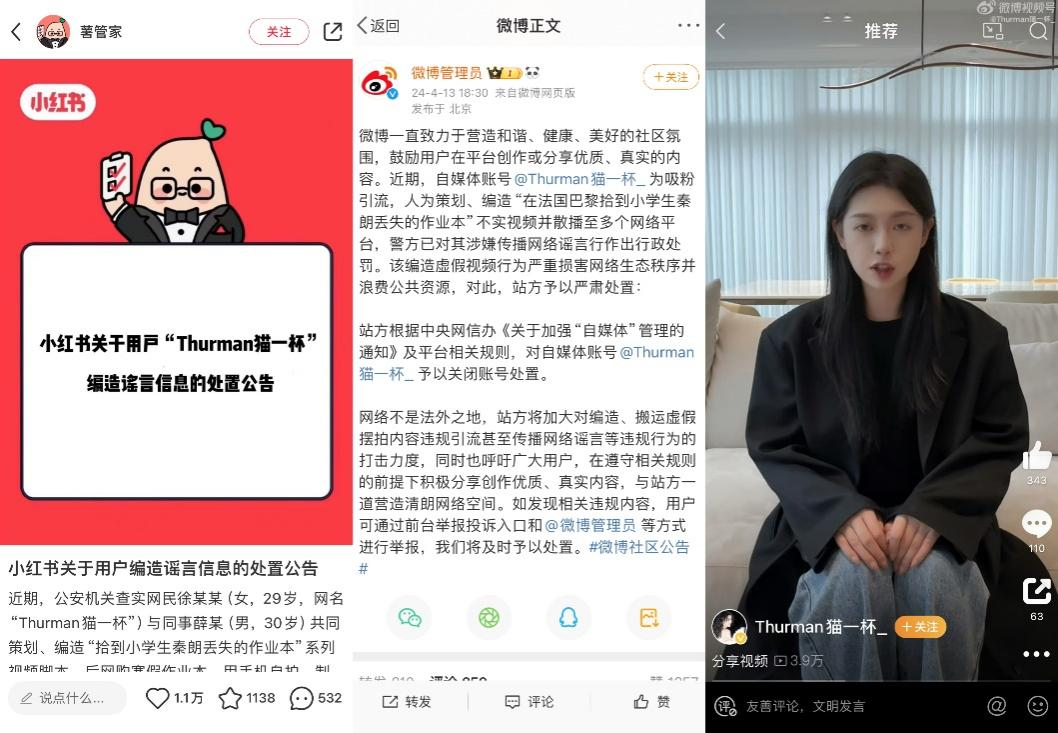 来源/ 锌刻度 撰文/ 星 晚 编辑/ 陈邓新 排版/ Annalee 从今年春节持续发酵至今的“秦朗巴黎丢寒假作业”事件,以视频作者“Thurman猫一杯”(以下简称“猫一杯”)的全网账号均被封禁为结局收官。在官方亲自下场的情况下,这场反转不断的荒诞剧目最终回到了现实主义当中。 估计连“猫一杯”都没有想到,一个与寻常策划无异的剧情竟然在短时间内就引来了铺天盖地的流量,因此在这起事件的首条视频发布后的第三天,她就再度发布了一则“大结局”视频,表示已经找到了秦朗的妈妈并已物归原主,目的就是希望各路“吃瓜群众”能够散去。 只可惜,请神容易送神难,这一事件很快也引发了公安机关、网信办等官方的注意,于是这场彻头彻尾的虚构事件迅速地露出了马脚。 两个月后,回旋镖扎在了“猫一杯”身上,她以满格的代价为自己的错误买单。不过,舆论还没有停下,大家不仅对“猫一杯”的道歉不买账,更提出了对加大力度整治互联网环境的需求。 “猫一杯”们,是否正在瑟瑟发抖呢? 一场全民参与的闹剧:年赚2600万的账号全靠编故事 “经查,为吸粉引流,网民徐某某与同事薛某共同策划、编造‘拾到小学生秦朗丢失的作业本’系列视频脚本,后网购寒假作业本,用手机自拍、制作相关视频,并散播至多个网络平台,造成恶劣影响。目前,公安机关已依法对徐某某、薛某及二人所在公司作出行政处罚。”4月12日,在杭州市公安局西湖区分局发出这则警情通报之后,网红“猫一杯”便开始在互联网中逐渐失去“姓名”。 4月13日,多个社交平台陆续发布处理消息,据微博平台上“微博管理员”账号消息,对自媒体账号@Thurman猫一杯_ 予以关闭账号处置;据公众号“微信珊瑚安全”,对视频账号“Thurman猫一杯”进行封号处置;据今日头条账号“抖音黑板报”,抖音安全中心永久封禁账号“Thurman猫一杯”。截至发稿,锌刻度发现全网已难寻千万级网红“猫一杯”踪迹。 ![]() 多平台对“猫一杯”作出处罚 到这时,“秦朗丢作业”已经不仅仅是一条短视频脚本了,从博主、网友到平台、官方监管机构,这个被流量牵引的虚构故事最终成为了一场全民参与的闹剧,始作俑者付出着惨痛的代价。 处罚结果公布后,自然也有人提出了“是否用力过猛”的质疑。但微博大V“江宁婆婆”仔细分析了这件事需要被严格处罚的原因。 一来,冒牌“秦朗舅舅”的出现,让虚构的秦朗有了一个真实存在的学校与年级,而布置寒假作业显然违反了“双减意见”,这直接对该学校产生了极为严重的负面影响。 二来,在事件不断发酵的过程中,“猫一杯”面对着多方的质疑,选择用一个谎言掩盖另一个谎言,与网络谣言专项行动的主旨背道而驰。 而无论事情发展到后来是否真的不再受原博主控制,都有人直接指出,“她编段子是图好玩吗?不是,是骗流量来赚钱,处罚得重是应该的。” 据锌刻度了解,“猫一杯”在全网多个社交平台上粉丝总量超过4000万,博主“阿发人情世故说”在自己的视频中分析,“猫一杯”去年在某单一平台上的广告报价为55万元/条,一般到手价格在44万元/条左右,按照这个量级的博主的普遍水平来说,“猫一杯”每月至少能接到5条广告,即全年仅单一平台、仅广告收益就能超过2600万元。 如今,这一切都已经化为泡影。但“猫一杯”一点都不无辜,早在本次事件之前,她就曾编造过多个谣言,甚至将其他网友分享的段子编作自己的亲身经历,以此获得流量。一切归零的代价足够大,更多的“猫一杯”们应该认识到其中的教训了。 一个容易被虚构的世界:0.1元买海量剧本 李诞在一期播客《如何杀掉一只羊?并活在真实之中》中讲道,“现代社会很多体验貌似唾手可得,但从远处观看故乡内蒙古时,又仿佛与真实自己的感受相去甚远。真实的体验到底是什么?” 在短视频兴起的这些年,大众能够透过一方小小屏幕了解到的世界越发广阔,既能窥得难以触及的名流生活,也能碰撞底层人民的苦难,手机几乎能把我们带到世界的任何一个角落。 但这些看似互通有无的信息交流,实际上已经在疯狂涌入的资本作用下变了味。在真真假假的互联网中,最不值钱的或许就是那些撩拨情绪的剧本剧情。 “也算是见证了这个行业的起起落落了,现在已经不怎么接剧情脚本了,原因很简单,太廉价。”有五年短视频剧情脚本从业经验的雨承最近转行做起娃衣,“哪怕是广告报价很高的博主,也不会给文案多少钱,加上AI和大量入局等活干的人,近一年价格更低了。” 雨城告诉锌刻度,三个月前,他给一个全网账号超2000万的账号写文案、脚本,1000字左右的常规文案只能拿到100元/篇,加上额外流量激励,植入广告的文案会达到800~1000元/篇。他表示,这个行情比前两年跌去了50%,“文字变得越来越不值钱了”。 锌刻度也通过搜索发现,短视频脚本的确能够以超低的价格批量买到。56100条短视频搞笑剧本、17000条反转笑话段子文案、130000条男女夫妻搞笑短视频剧本……各种类型的海量剧本仅仅只需花0.1元就能买到。哪怕是号称独家制作的剧本,也不过花费0.6元就能买到80000条。 ![]() 各类剧本段子售价低廉 面对锌刻度对脚本内容的询问时,店家却直言:“都是从同行手里买来的,具体内容不清楚。”而就是这样被低价贱卖的海量剧本,仍然被卖出了不少,更无法估计究竟在互联网上生产出了多少粗制滥造的内容。 在“