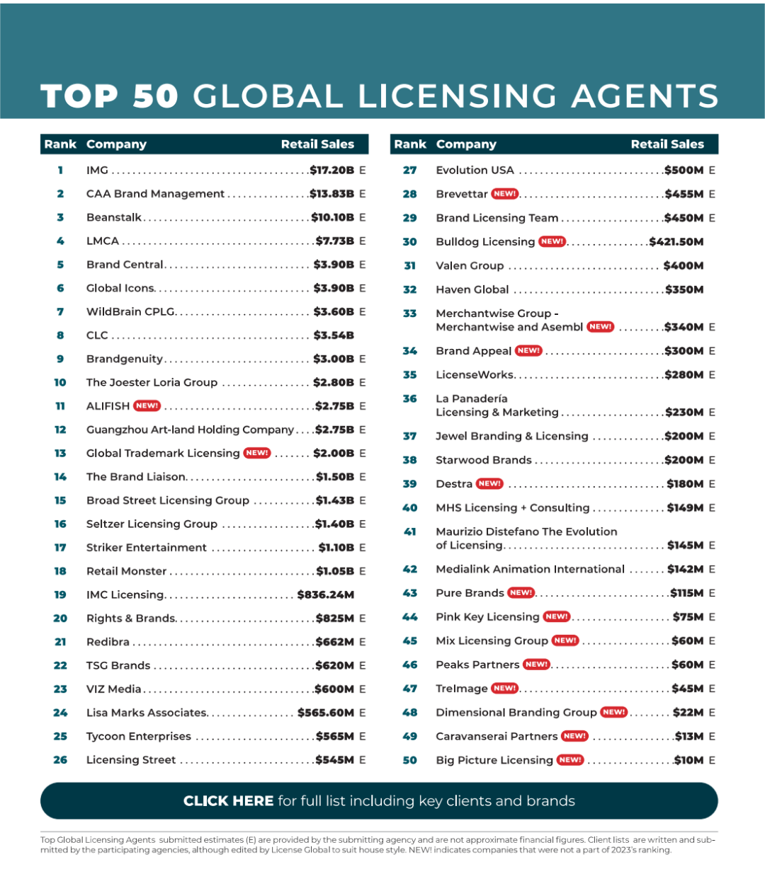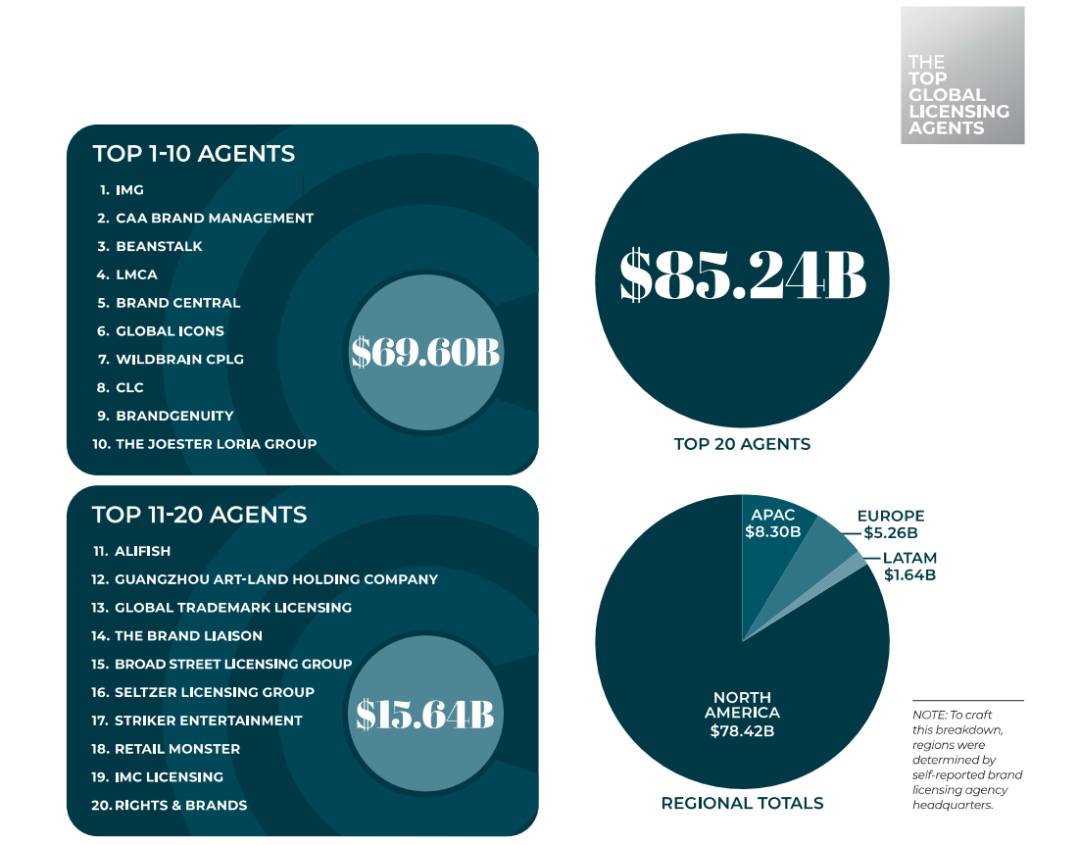 作者:段轻 编辑:努尔哈哈赤 来源:雷报 近日,全球授权展旗下授权行业杂志《LICENSE GLOBAL》发布了《2024年全球顶级授权代理商排行榜》(以下简称“报告”),雷报对该报告进行了翻译和整理。 报告显示,授权业持续经历巨大增长,2023年全球授权代理商的销售额增长了57亿美元,全年的零售总额为936.3亿美元。在这些授权代理商中,排名前10的企业总共创造了696亿美元的零售额,排名前20的企业零售额超过852.4亿美元。 ![]() 成功的授权代理商做了什么?有什么发展趋势? 授权行业正在蓬勃发展,License Global制作了全球授权代理商排名报告,旨在充分了解授权代理在全球品牌授权领域的影响力,并探讨这些公司、专家和工作室如何推进品牌授权事业的发展。 《2024年全球顶级授权代理商》对代表数百个家喻户晓的品牌的消费品行业的50家代理商进行了排名,揭示了相关代理机构的年度增长情况。 首先,简单了解什么是代理商?授权代理商是IP所有者(即授权方)和希望使用该IP开发产品或服务的潜在被授权方之间的桥梁。授权代理商的职责包括寻找潜在的授权机遇、授权协议谈判以及维护授权方与被授权方之间的长期合作关系。 总而言之,品牌及IP授权代理的目标是在维护品牌声誉的同时,帮助授权双方实现品牌价值的最大化。 License Global概述了全球顶级授权商能够持续增长的关键趋势战略,包括: 一,技术与创新。代理商们持续将资源用于尖端投资,例如生成式AI等技术;同时持续进行技术扩张,利用区块链集成和数据分析,优化品牌管理和识别新兴趋势。甲骨文公司2020年的一项研究发现,利用新兴技术的公司的年收入增长了58%。 二,可持续发展和以消费者为中心的战略。专注于环保实践和材料的长期合作伙伴关系与消费者保持一致价值观,提高品牌声誉和贡献。《福布斯》杂志称,92%的消费者更有可能信任具有环保或社会意识的品牌,88%的人会更忠诚于关注社会或环境问题的公司,66%的全球消费者愿意为可持续发展的产品支付更多的价格。 三,多样性、包容性和透明度。建立多元化的员工队伍,积极参与以前被忽视的细分市场,可以促进包容性,并释放未开发的市场机会。根据MeKinsey D&I全球市场报告,包容性团队的生产力高出35%,富有生产力和多样化的公司每名员工的现金流要高出2.5倍。 四,伙伴关系、协作和全球扩张。代理商倾向于全球扩张业务的持续趋势。 五,客户体验和参与度。优先考虑客户满意度,通过社交媒体提高品牌参与度,提高品牌意识,有助于整体化品牌管理和市场渗透率。62%的被认定为 “客户至上” 的企业表示,他们的全渠道客户参与战略比非客户至上的企业带来了更高的利润率。福布斯发现90%的社交媒体用户至少关注一个品牌。 六,市场趋势、灵活性和适应性。战略起源于市场的状况,代理机构必须迅速适应变化的市场需求,坚持以客户为中心,为客户和被授权商提供可持续的收入。 ![]() 全球排名前50授权代理机构:阿里鱼飙升至TOP11,艺洲人、羚邦持续在榜 今年,全球顶级授权代理商报告上的新上榜品牌足有15个,展现出全新的图景,反映了全球授权代理商带给全球市场的创新。 ![]() IMG公司已经是第六次蝉联榜首,其以百事、堡垒之夜、大众、刺客信条、小马宝莉、彩虹六号、玛莎拉蒂、变形金刚等等品牌为代表客户,2023年零售额为172亿美元(同比增长18亿美元)。 紧随其后的TOP2公司是CAA,全年零售额138.3亿美元,代表客户有可口可乐、网飞、我的世界、英雄联盟、捷豹等;TOP3为零售额约101亿美元的Beanstalk,其代表客户有动视暴雪(使命召唤等)、微软、育碧、U.S. Army等。TOP4-TOP10分别为LMCA、Brand Cental、Global Icons、WildBrain CPLG、CLC、Brandgenuity、The Joester Loria Group。这十家公司基本每年都处于榜单前十名的高位,只是部分公司的排名有所浮动。 榜单TOP11是中国授权代理商阿里鱼。去年,阿里鱼进入榜单并位列第25名,今年的排名飙升十四位,直接到达第11名,零售额高达27.5亿美元(上一年为4.3亿美元)。 ![]() 作为授权业头部品牌,阿里鱼是雷报的重点关注企业之一,雷报持续对阿里鱼的动向跟进报道。在最近的一次独家访谈中,阿里鱼副总裁江旭恒告诉雷报,自成立以来,阿里鱼做出了很多方面的尝试。2018到2019年,阿里鱼先是确立了要为全行业提供基础设施服务的战略方向,随后又提出“IP2B2C”这样一个独有的全链路服务模式,成为连接IP、品牌和消费者的桥梁。 阿里鱼提到,在当今社会限制行业整体发展的关键瓶颈,并不是“信息差”,即IP方和品牌方互相不了解、找不到;而是如何在授权合作过程中及合作之后给予商家更多的支持。这也与License Global在报告中概述的理念不谋而合。 榜单TOP12同样是来自中国的广州艺洲人,艺洲人已经连续三年入选全球顶级授权代理商榜单,并且持续保持在第12名,2023全年零售额达到27.5亿美元(2021年零售额16亿美元、2022年零售额21亿美元);羚邦动画连续两年上榜,这次以1.42亿美元的零售额排在榜单第42位(上一年以零售额1.13亿美元排名第38)。 亚太地区的“蛋糕”做到多大了?2023年的关键类别有什么? 据License Global去年的研究,全球授权商品的销售总额高达879.2亿美元,今年这个数据增加了60.1亿美元,达到939.4亿美元。 从零售额数据来看,排名前10名的代理商在全球零售额超过696亿美元,前20名则在全球累计零售额约852.4亿美元。 而