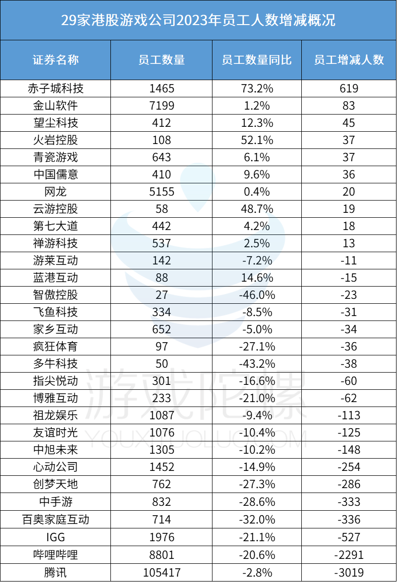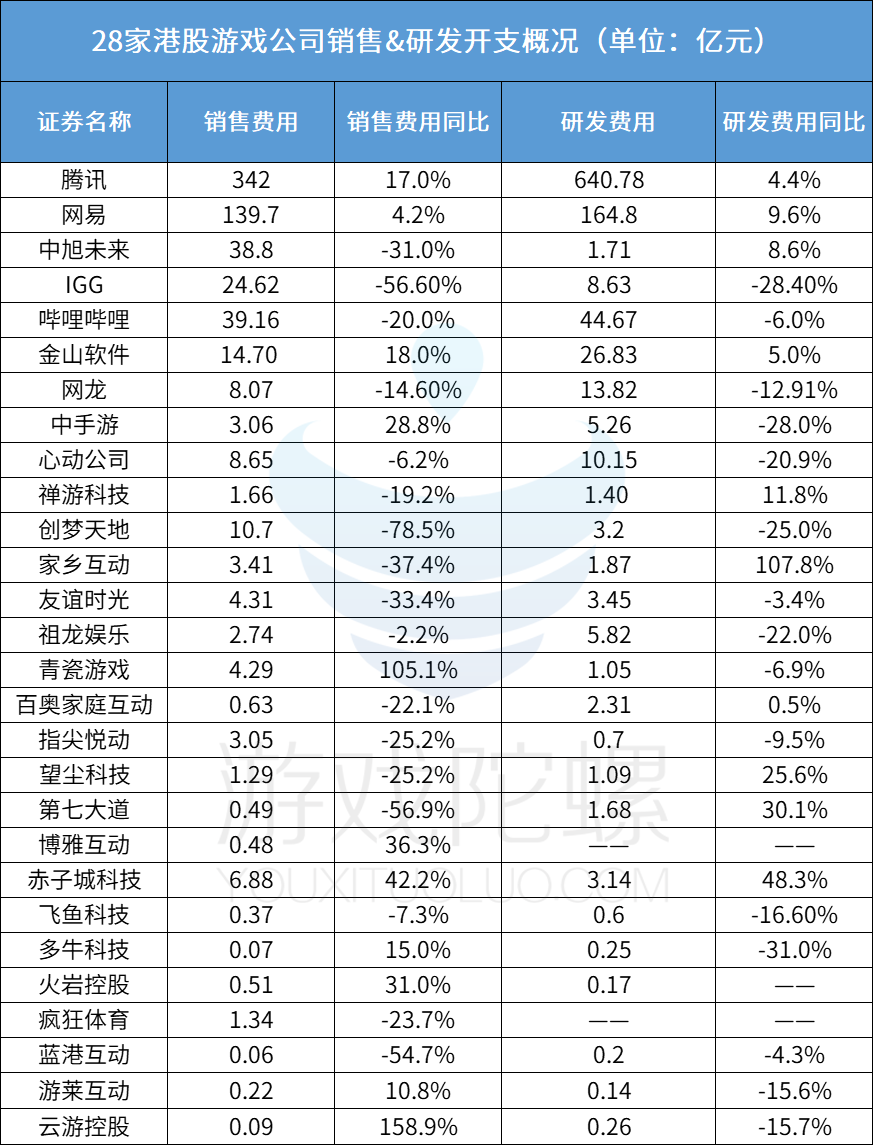 来源:游戏陀螺 近期,各大上市游戏公司陆续披露2023年年报。从披露的速度上看,港股游戏股的年报整体发布速度要快于美股和A股,因此本期陀螺君优先复盘30家港股游戏企业年报。并从营收、净利润、销售开支、研发费用、裁员情况等方面逐一分析,以期更清晰地看到去年港股游戏公司的经营状态。 整体来看,2023年港股游戏公司有6成营收同比增长,最高增幅达到703%;近7成盈利,多数扭亏为盈;过半削减开支和裁员,最高裁员超过40%。那么在这其中,谁在狂飙?谁扭亏为盈?谁在亏损边缘裁员削减开支?且看下文拆解。 游戏营收:6成增收,中腰部厂商收入增速加快,中国儒意增幅达703% 30家港股游戏公司中,游戏业务营收在20亿元(人民币,下同,注意部分公司年报披露货币为港元均换算成人民币,因汇率问题,数据或有小差距)以上的有10家,分别是腾讯、网易、中旭未来、IGG、哔哩哔哩、金山软件、网龙、中手游、心动公司、禅游科技。 ![]() 其中,腾讯与网易的游戏营收仍十分稳健。2023年,腾讯游戏营收1799亿元,同比增长5.4%;网易游戏营收816亿元,同比增长9.5%。从行业大盘来看,这两家虽实现营收正向增长,但略低于行业增速大盘(13.95% )。 中旭未来是20亿元营收阵列的新面孔,该公司于去年上市,旗下核心品牌为“贪玩游戏”,2023年该公司游戏营收63亿元。哔哩哔哩(B站)去年游戏营收40.2亿元,同比下滑20%。主要原因还是新游戏推出的数量及流水减少。 IGG去年虽然没有发行新产品,但是凭借《Viking Rise》和《Doomsday:Last Survivors》等产品实现了游戏营收同比增长4.5%至4.3亿元。同样的,金山软件也依靠《剑网 3》《尘白禁区》及《剑侠世界:起源》实现游戏业务同比增长6%至39.77亿元。 这30家港股游戏中,实现游戏营收正增长的有18家,占比60%。其中同比增长最高的为中国儒意,游戏营收4.46亿元,同比增长703%;其次是多牛科技,游戏营收1.46亿元,同比增长148.7%。 中国儒意是游戏行业的后起之秀,其在2022年开始发展游戏业务,并且与腾讯有着强关联。目前公司代理发行的产品也以腾讯的居多,旗下在运营的产品有《乱世逐鹿》《传奇天下》等。 今年中国儒意代理了欢乐互娱的MMORPG游戏《仙境传说:爱如初见》,表现不错。旗下储备新品包括腾讯研发的SLG产品《世界启元》以及策略游戏《战道》和《荒野国度》,后两款均出自中国儒意投资的中小游戏厂商。 除此之外,祖龙娱乐、青瓷游戏、赤子城科技游戏营收增幅均在30%以上。在这18家营收正增长的公司中有10家游戏营收在10亿元以下,说明中腰部游戏公司收入增速正在加快。 ![]() (注:因中国儒意游戏营收增幅超700%,远超其他厂商,为保证图表呈现观感,未将其纳入制图范围。) 仔细观察上述厂商游戏收入同比增长的原因,主要是产品侧的稳定输出,即保证老产品稳健生长,新产品高效上线。从业绩端看,去年不少公司依靠老产品混得有声有色。如IGG、金山软件、网龙等。 当然,也有部分公司去年游戏营收增速下滑。友谊时光、智傲控股、疯狂体育,游戏营收降幅超过30%。创梦天地、指尖跃动、哔哩哔哩、中手游等也有不同程度地降幅。 这些厂商游戏营收下降的原因大抵集中于两方面,一是,经典游戏产品收入回落,且未有新游及时接档;二是,公司新品在去年下半年或年末上线有较大的市场投入,但收益存在滞后性,需要今年才能体现。 净利润:7成盈利,火岩控股净利增幅1754%, 10家亏损,最高亏损48亿 去年港股游戏公司的盈利状态较去年要好些。在我们统计的30家游企中,有7成游戏厂商实现盈利。不过,总营收与净利润实现双增长的仅有6家,分别是腾讯、网易、禅游科技、博雅互动、赤子城科技、火岩控股。 ![]() 腾讯、网易、禅游科技的发展一直都是走稳健路线,营收、净利润同比起伏并不大。在净利润增幅方面,火岩控股的增幅最明显,该公司去年游戏营收1.24亿元,同比增长17.2%;净利润为5.17亿元,同比增长1754%。其次是赤子城科技,游戏营收3.36亿元,同比增长38.6%,净利润为5.13亿元,同比增长294%。 火岩控股的净利润增长仅小部分来自《捕鱼大乱斗》《零食大乱斗》及其他棋牌休闲手游的收入增长;大部分来自一次性非经常性其他收入(如投资和承兑票据)。其在公告中表示,德成国际控股有限公司收购项目之各卖方同意向本公司交出该等承兑票据及放弃尚未清偿本金额及其相关应付利息之权利,使整体溢利大幅上升。 与之相比,赤子城科技的收入增长更多的是来自游戏及社交业务。其在年报中提到,公司净利润同比增长,一方面得益于社交业务的发展,特别是中东北非市场的成功拓展及新社交产品SUGO和TOPTOP的商业化增长;另一方面是赤子城科技旗下基金 Metaclass Management ELP的财务报表及其所持公司的财务报表并入集团,给赤子城科技带来了1.6亿元的净利润贡献。 ![]() 目前,赤子城科技旗下有休闲益智类游戏《Alice's Dream: Merge Island》以及新游《Taylor's Secret》《MergeCove》和《Sudoku》等。其中,《Alice's Dream: Merge Island》已成长为全球Merge类游戏中的头部产品。并且这款游戏在 2023 年 拿到了游戏版号(《爱丽丝的妙趣仙境》),如若在今年上线,赤子城科技收入或将进一步增长。 6家营收净利润双增企业之外,还有6家游戏公司实现扭亏为盈。分别是金山软件、IGG、创梦天地、中手游、指尖跃动、飞鱼科技。前两者2022年亏损主要是计提了商誉减值;后