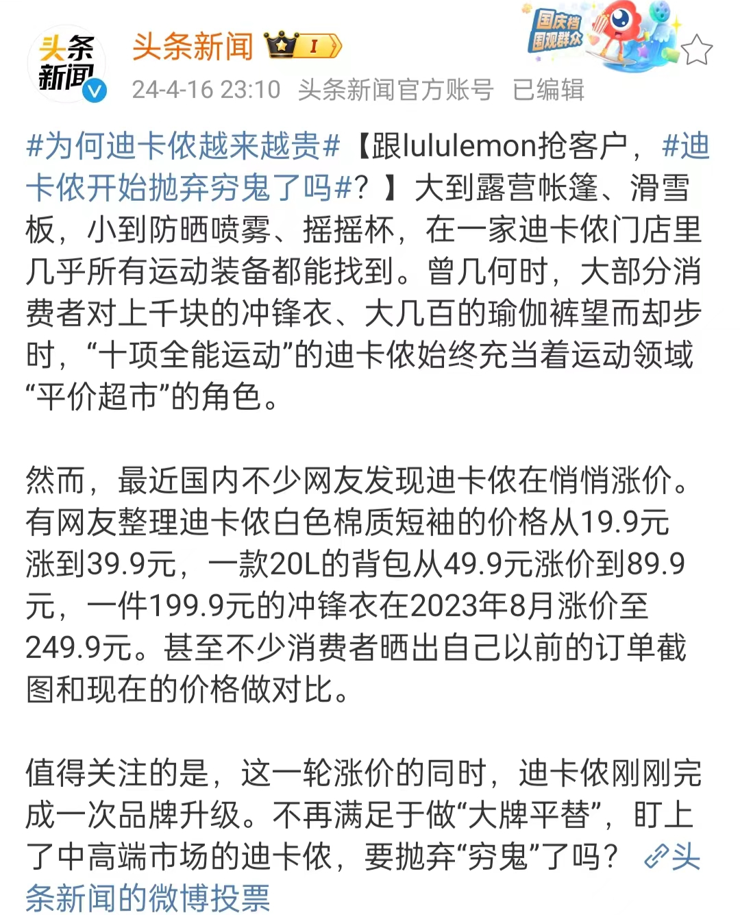来源:品牌头版 蓝白相间的英文logo标识,几乎不打广告不做营销。每次走进门店,都感觉误闯了一个古早粗糙的大超市。就连产品设计,也经常被吐槽“太丑”…… 这些,并不妨碍其在全球拥有上千家运动卖场,年零售额接近千亿。 没错,今天要说的,是被网友称为“平价超市”“直男天堂”的法国运动品牌——迪卡侬。 最近,这个曾以高性价比占领网友心智的品牌,却因一则#越来越贵#的话题引发热议。 01 走进迪卡侬,各种运动装备应有尽有:大到露营帐篷、滑雪板,小到防晒喷雾、摇摇杯。并且,价格都相当亲民。 然而,有网友发现,从创立之初就充当着运动领域“平价超市”角色的迪卡侬,悄悄涨价了。 ![]() 随着#迪卡侬抛弃穷鬼#的话题冲上热搜,网友纷纷上线吐槽。 大部分网友认为,值不值得购买,要看品质和价格是否相符合。如果产品没有提升,价格还涨了,那就没必要买。 ![]() ![]() 有网友表示,迪卡侬的东西有些性价比很高,但也有些产品,质量“一般般,无功无过”。 ![]() 前几年很便宜,看在价格的份上,款式不好看也忍了,但现在真的越来越贵。 ![]() ![]() 有网友直言:早就不买了,比以前膨胀了。价格高了,质量也还是以前那样。 ![]() 面对迪卡侬抛弃穷鬼的话题,有网友认为,下沉市场才是增长最迅猛的,谁抛弃它谁就是傻。 ![]() 况且,国内也有很多好的运动品牌,不是非得要选迪卡侬。 ![]() 关于迪卡侬涨价,还有网友将“锅”甩给了大中华负责人。 ![]() 难道,未来迪卡侬将lululemon化?越来越贵的迪卡侬,又会不会像网友说的:这是最后的挣扎呢? ![]() 02 在竞争激烈的运动市场,迪卡侬,算得上是现象级的存在。 如果让经常组织户外运动的老司机,给户外小白推荐入门的装备,不用说,必然首选迪卡侬。 一是因为这个品牌的高性价比。另一,除了性价比之外,产品功能也是可以满足基本需求的。 从跑步、登山、瑜伽到游泳、网球,迪卡侬的门店有着几乎涵盖各个领域的运动服饰、装备及各种创意类运动产品。 再看价格,简直比家门口的地摊还接地气—— 19元的便携收纳双肩包、29元的速干背心、99元的登山鞋……甚至,还有号称比市面同类产品价格低了20%的自有“蓝标商品”。 从2018年开始,迪卡侬在“万物皆上涨”新消费浪潮中逆势调价——中国市场的平均单品销售价格下降了8%。 其他媒体有过报道,“如果一款产品的毛利率不错,迪卡侬就会尝试再次降低价格”,这看起来简直不可思议。 走平价路线的迪卡侬,还自有能为产品力提供保障的法国第二大产品开发和设计中心。 ![]() ●图源:迪卡侬微博 既有亲民的价格,又有不错的产品,这对大部分刚入门的运动爱好者而言,简直不要太友好。 至于没有鞋盒的新鞋,以及略显简陋的外包装,看在性价比的份上,也就大概率释怀了。 特别值得一提的是,迪卡侬将体验营销做到了极致。 迪卡侬的卖场,有别于耐克、阿迪等运动巨头店面陈列的秩序感满满。 不仅看起来就像一个大型健身房,甚至还有些“奇葩”。然而,这却是迪卡侬最大的品牌特色。 在迪卡侬的门店内,有供顾客体验的跑步机、动感单车、椭圆机。甚至还有滑雪模拟机、攀岩墙面、高尔夫模拟屏、模拟网球场等等。 ![]() ●图源:迪卡侬微博 当小朋友在户外帐篷展示区嬉笑打闹时,他们的父母,可能正在体验动感单车,或在店员的带领下组队踢足球…… 所谓的“让顾客尽情体验”,就是你想买的任何装备,都可以在迪卡侬体验使用。 “只要消费者来了,获得了好的体验,他什么时候买、在哪儿买,这都不用担心。”这句话,出自迪卡侬CEO孙元文。 对广告费用仅占营业额1%,大半新顾客都是通过口碑相传来到店里的迪卡侬而言,规模化扩张的成功实现,体验营销功不可没。 03 看上去“不务正业”,只想让大家玩个够的体验营销,真正目的是获客,更是卖货。 据官方数据显示,门店的7万多件试用产品,有70%实现了最终购买。 然而,无论怎样的体验,价格仍是影响消费者买单的重要因素。 迪卡侬的中文名来自于Decathlon的音译。而Decathlon的英文释义,是十项全能运动。 这个品牌名,也代表了迪卡侬的市场定位:在同一个商场内,为所有的运动爱好者提供价格最低的运动产品。 从1986年迪卡侬开出属于自己的生产公司起,就执行“先定价再生产,面向成本做设计”的发展思路,并尽可能从源头上控制生产成本。 这种围绕价格展开的品牌策略,使迪卡侬的设计看起来不够时尚,却也因为“死磕”价格,让掌控全产业链的迪卡侬能够在终端市场表现不俗。 毫无疑问,在新品牌迭出的当下,产品的性价比、功能体验、社交货币价值等,都会影响到顾客的复购选择以及忠诚度的构建。 尽管有研究表明,源自店内环境的唤醒和体验感,会产生50%的无计划购买行为。但是,对运动品牌而言,性价比始终影响着“有计划”的购买。 曾经,消费圈是这么形容迪卡侬的:用50分的价格,卖70分的产品。 迪卡侬的品牌定位,正是通过入门普及型运动产品,吸引新人尽快投入到某一项运动中。 ![]() ●图源:迪卡侬微博 在迪卡侬,既能买到几千块钱的高尔夫球杆、冲浪板或山地自行车,也能29.9元买下一件运动速干衣,不到200块钱拿下一双跑鞋。 迪卡侬旗下的每一条产品线,都会有几样产品被放在“蓝色货架”上。这个蓝色货架,是迪卡侬每个系列中最划算、最畅销的产品。 而迪卡侬的品牌愿景,正是把运动带