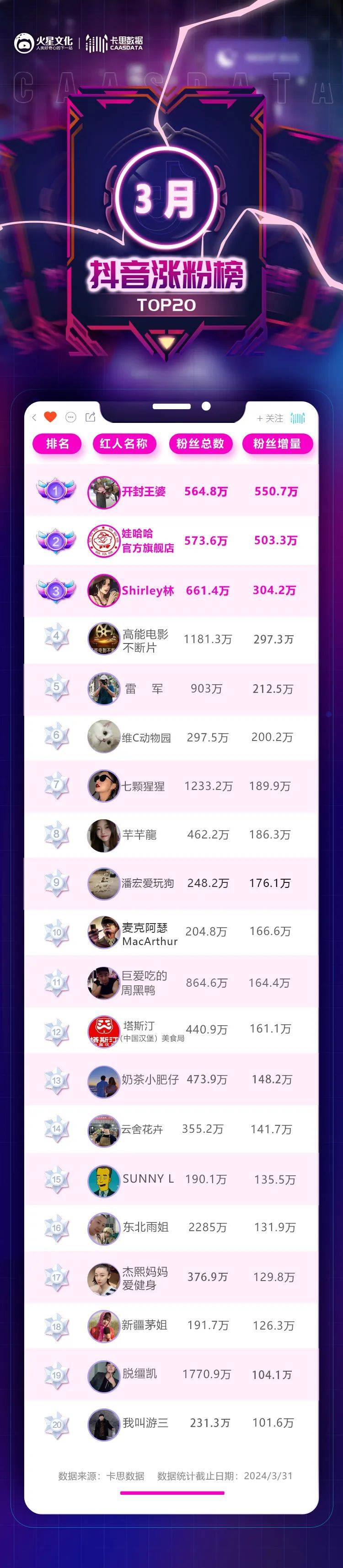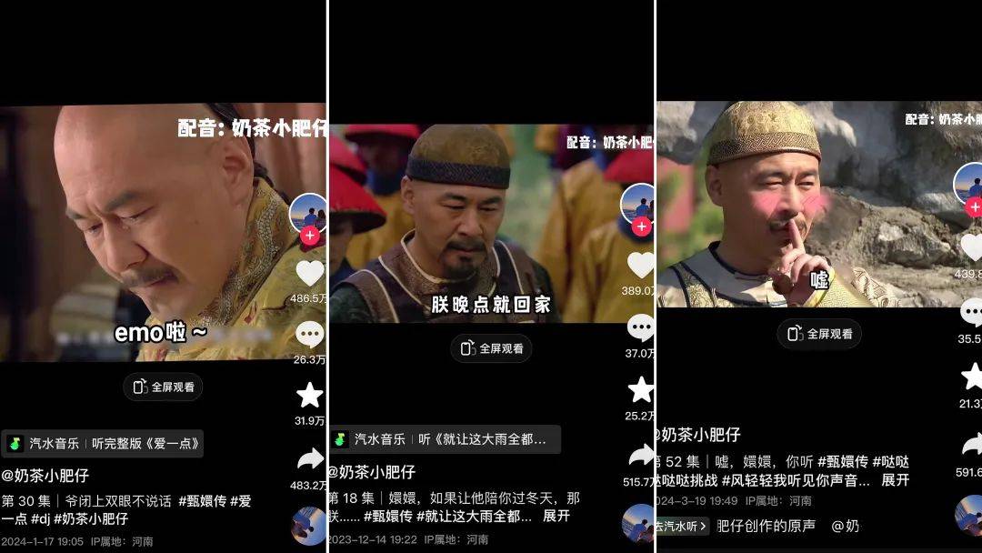 来源:卡思数据 抖音3月涨粉榜已出,我们先一起看榜: ![]() 从整体涨粉走势来看,3月的抖音和2月相比,并无太大差别: 增粉量在500W以上的账号有两个,一个是杀入年轻人相亲场、为现场游客说亲的“媒婆”@开封王婆;(“王婆说媒”降温,但互联网遍地红娘)另一个是品牌号@娃哈哈官方旗舰店,因其创始人宗庆后离世,众多粉丝涌入直播间为其哀悼,账号单月增粉503.3W。 这两个账号之外,增粉量在300W-500W之间的账号还有一个,是美女音乐达人@Shirley林。和一般的音乐达人不同,@Shirley林 除了分享自己唱歌的视频外,还会分享自己的生活日常:去联合国总部吃午餐、在自家花园里骑马、参加比尔盖茨的晚宴等等,奢华高端的做派引来一众网友对其身份背景的猜测,账号也由此笼罩上了一层神秘色彩,从而吸引了更多人群关注。 ![]() @Shirley林 抖音视频截图 剩余账号中,增粉量在200W-300W的账号还有3个,其余14个账号的涨粉量则均在100W-200W之间。 整体来看,3月的涨粉走势维持着近两年来惯有的“波澜不惊”,并不出彩。但值得关注的是,3月涨粉榜不仅覆盖了音乐、影视、宠物、美食、户外、运动健身、剧情、vlog等多个垂类,上榜账号还呈现出了新鲜面孔占据半壁江山、风格化账号层出不穷的特点,这也意味着,只要内容有亮点、有特色,依然能在抖音内容生态中冒出头来。 接下来,卡思将重点挑选一些典型账号,对它们的涨粉原因进行分析。 @巨爱吃的周黑鸭:个性化标签越突出,涨粉速度越快 美食达人@巨爱吃的周黑鸭 走的是吃播路线,而和不久前崛起的另一位吃播达人@敦煌老马(羊头)类似,周黑鸭能够走红,同样是因为其吃出了自己的一套流程和风格,并通过一些差异化操作,打造出了让用户印象深刻的个性化标签,由此带动了账号的知名度不断提升。 据卡思观测,周黑鸭从2018年4月就已经开始发布吃播视频。此时,他还是一个尚未离开校园的青涩学生,吃的食物主要来自学校食堂。由于这段时期他的镜头表现能力还很薄弱,加上吃的食物并没有明显特色,且食量也和普通人无太大差异,因此在很长一段时间内账号不仅涨粉速度缓慢,评论区中还总是会出现不友好的声音。 ![]() @巨爱吃的周黑鸭 抖音视频截图 此后,在日复一日的坚持之下,周黑鸭的镜头表现力逐渐增强——一方面表情越来越放松,另一方面口条越来越顺,与此同时,选择的食物也越来越丰富、越来越有特色,吃东西时的表现也愈发有感染力,而其视频模式也逐渐固定: 沙发前放置一张木头桌子,激情满满的周黑鸭往下一坐,拿出一个出镜率极高的金色大碗,随即便开始了一次又一次的大快朵颐之旅,由于偏爱麻酱辅料和黏黏糊糊的拌饭,周黑鸭便借此将两种吃法发展成了自己的个人特色,不少粉丝戏称其为“黏黏糊糊国王”。由于偏爱肉食、米饭,他还收获了“汤拌饭小王子”“碳水达人”“绿色蔬菜绝缘体”“脂肪收纳机”等一系列标签。此外,他每次吃饭时的表情,被很多网友认为像猫和老鼠中的杰瑞,甚至还有人觉得像汉字“答”。 ![]() @巨爱吃的周黑鸭 抖音视频截图 鲜明的风格特色和众多标签的打造无疑让其账号有了明显起色。而今年以来,@巨爱吃的周黑鸭 更是迎来了爆发式增长。据卡思统计,2023年,其账号共增粉251.2W,而2024年不到5个月的时间,其增粉量已经达到440W,截至目前,其粉丝量已突破千万。 分析其原因,一方面,是因为周黑鸭加强了与粉丝之间的互动——他会在评论区中置顶“点菜区”评论,由粉丝来决定他吃什么,这种做法让粉丝的参与感更强,也让他和粉丝之间的联系更加紧密。 ![]() @巨爱吃的周黑鸭 抖音评论区截图 另一方面,则是因为他在视频中埋入了更多“小心机”,让账号的看点变得更足,传播性也变得更强。 具体来看,在很多视频中,周黑鸭都会在正式开吃前来一句“米饭依旧是一小碗”,但嘴上说着一套,行动却截然相反:每次他都会使出各种手段出其不意地给自己加饭,不是在加食材的过程中莫名其妙从四面八方降下数个饭团,就是将饭团藏在各个角落,有时甚至直接从脖子上搓下一团米饭,或是嘴里藏一块米饭,不少网友因此称呼他为“米饭投手”,甚至有粉丝戏称“新粉在看他吃饭,老粉已经在找米饭了”。 ![]() @巨爱吃的周黑鸭 抖音评论区截图 在这种“小心机”的加持之下,“米饭依旧是一小碗”逐渐演变成一个热梗,周黑鸭的账号也因此再添一重特色,在此基础上的找米饭玩梗热潮,进一步助推了账号的出圈。这也印证了卡思之前在分析@敦煌老马(羊头) 时得出的结论:让自己的内容具备梗的基因、成为梗、加入梗,无疑是短视频账号走红的一大利器。 @奶茶小肥仔:二创《甄嬛传》,吸粉500W 3月28日,在上海大学草木人间路演现场,受邀出席的音乐达人@奶茶小肥仔 在“四郎”陈建斌和其妻子蒋勤勤面前“贴脸开大”,演唱了自己精心创作的歌曲《爱一点》,这种大胆的举措不仅让四郎的专属歌曲有了更高的传唱度,也让@奶茶小肥仔 这个配音歌手被更多人所熟知。 据观测,@奶茶小肥仔 于2021年7月在抖音上发布了第一条对镜头唱歌视频,随后便一直以这种分屏合拍的形式演唱各种风格的歌曲。而除了以自己的声音演唱外,他还会模仿不同歌手的声线演唱他们的歌曲,比如模仿凤凰传奇的玲花唱《全是爱》,模仿rapper法老唱《百变酒精》等,由于他的声音模仿都十分到位,且展现出了不俗的