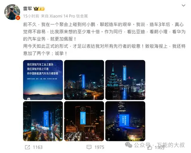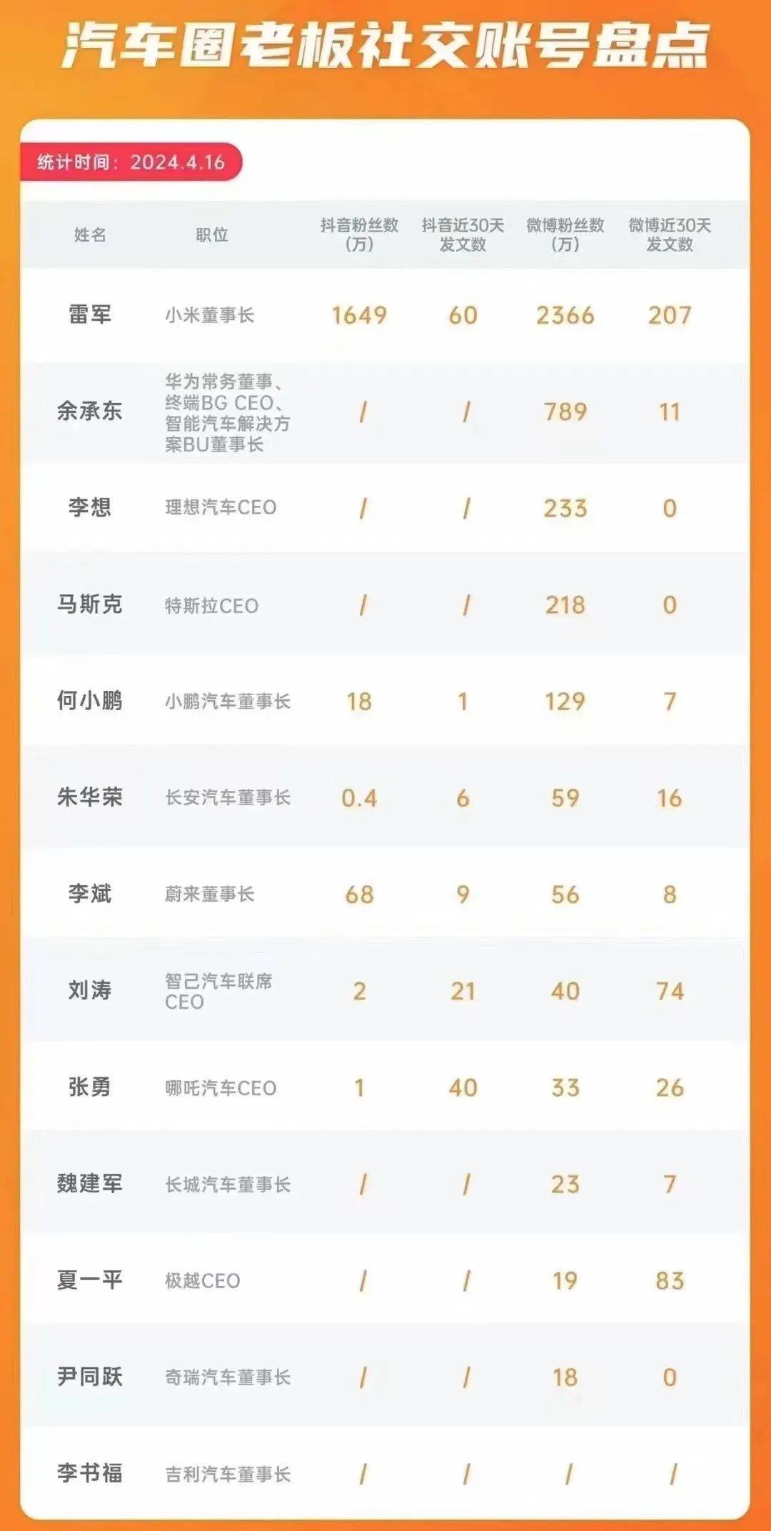 来源:万能的大叔 “被(雷军)逼着我这个60多岁老汉出来了。” 前几天,奇瑞汽车董事长尹同跃在新车测试直播间,如此感慨。 在雷军“炸圈”后,几乎所有车企老板,都开始向雷军学习营销! 多年前,京东创始人刘强东曾在一档节目上说:“千万别和雷军比营销。” ![]() 言下之意,雷军的营销太强了。 到底有多少强? 1、雷军“断崖式领先”车圈老板! 新榜最新公布的一组“车圈老板社交媒体账号盘点”数据,正好印证了这点。 媒体甚至用了一个及其夸张说法,叫: 雷军“断崖式领先”! 到底多“断崖”? 大叔看到,截至2024年4月16日,雷军的抖音+微博粉丝,分别是1649万和2366万,排名第二的余承东呢,只有微博账号,粉丝是789万。 余承东微博粉丝正好是雷军的三分之一。这一次,“遥遥领先”输给了“断崖式领先”。 李想、何小鹏、朱华荣、李斌分别排在第三到第六,粉丝数分别从200多万到56万,且基本以微博粉丝为主。 而前几天,在微博上和小米“干架”的智已汽车联席CEO刘涛,微博粉丝40万。被周鸿祎“批评”的哪吒汽车CEO张勇则是33万。 借着小米汽车SU7发布会,开通个人微博的长城汽车董事长魏建军,微博粉丝涨到23万。 这几天,因为员工买小米SU7被开除上热搜的极越汽车,其CEO夏一平的微博粉丝是19万,而开篇提到的尹同跃,其微博粉丝是18万。 吉利汽车董事长李书福虽然至今未开通任何个人社交媒体,但也专门挑小米SU7上市发布会当天,蹭了东方甄选一把直播的流量。 具体数据请看下图: ![]() (图片来源:新榜) 为什么车圈老板要在社交媒体拼命搞流量呢? 大叔觉得,核心是传统营销模式变了!如果你不搞,流量就都被“爽文男主”雷军搞走了。一晚拿下10万大定,把其他车企老板的眼,逼得通红! 小米汽车“以案例教学”的方法,给所有车企上了一趟“营销课”,结论就是:流量开始“约等于”关注度和销量了! 2、不是雷军营销强,而是“热点营销”最具性价比 传统车企的营销,过去的三板斧,是:广告轰炸+明星代言+经销商模式。 这套营销打法,和大叔当年在某智能手机很像,但正如小米手机改变了传统手机营销一样,小米汽车也彻底改变了汽车营销。 以小米汽车为首的新能源汽车的营销,则变成了:社媒流量+老板代言+直营模式为主。 具体如下: 1、流量并不来自广告轰炸。 因为传统媒体的广告越来越没效果,而是把流量全部“压”在以微博和抖音为主的社交媒体上,拼命在社交媒体制造热点和追逐热点,小米汽车即便是在传统媒体打广告,本质也是为了在社交媒体获取流量。 ![]() 2、老板自己就是最好的代言人。 因为大家要看老板亲自讲解产品,要让老板亲自给用户开车门……而不是梁朝伟、刘德华、郭富城、周杰伦,更不是什么小鲜肉,这些人虽然很有辨识度,但他们由于代言过多,品牌已失去辨识度,反而变成花钱给明星“推广”。 最关键吧,汽车和用户之间的距离感太远了,还不如小米手机的代言人张颂文在微博上“暗示”雷军要车,更能出圈和更接地气;还不如蔚小理的三位CEO出席小米发布会更能制造话题。 ![]() 1和2,证明了“公关第一,广告第二”的价值,在去中心化传播时代,只有在社交媒体能“生根发芽”的热点流量,才是有效的流量,才能形成新的属于自己的“中心化传播”。在所有广告主都在降低费用的大背景之下,基于社交媒体流量的“热点营销”最具有性价比。 举个简单例子,小米汽车从第一次技术发布会到第二次最终发布,光“辟谣定价”这一项就几乎每周上热搜,据不完全统计,小米汽车光靠这一项就从社交媒体收获超过15个亿的流量。 3、经销商模式被直营打破。 这个不赘述了,新能源车开进了商场,体验和服务为王。 因此,大叔认为,其实并不是雷军个人的营销能力有多强,而是传统营销模式已经变了,恰好雷军在数码手机时代就做足了准备,并把这套模式又在智能汽车时代做了一个加强版而已。大叔猜测,估计是看准了“热点营销占主导”这个趋势,才逼得退网许久的刘强东,以“数字人直播”的形式“回归”。要记得,当年的电商大战,刘强东是最会在微博引战的,而周鸿祎公开鼓励所有老板都要当网红,也是同样的逻辑。 ![]() 不让大家学雷军营销,刘强东自己却“学”了起来,可见,老板圈又多“卷”。 3、“学雷军营销”可不是“开微博+做直播”! 这其实是大叔最想说的。 “复制”一个雷军几乎不可能,但你可以学小米汽车的热点营销。 大叔看到,不少车圈老板都在学雷军营销,基本上就两条: 开微博(或者发微博)+做直播。 这显然是方向偏了。 其中,长城汽车董事长魏建军最为“卖力”。在注册微博13年之后,他终于在3月26提(小米汽车发布会当天),发出第一条微博,并很快在微博又做了一次直播。 但对于不少网友(甚至是用户)的留言和咨询,魏董在过去很长一段时间都基本都不理,终于在最近开始有互动了。 ![]() ![]() 大叔认为,学“雷军营销”本质是“伪命题”,因为雷军也是整个“小米热点营销”的一环而已,我们不能忽视小米高管的账号矩阵,更不能忽视小米市场营销和品牌公关体系在微博等社交媒体的长期投入,从蹭热点到制造热点形成了一套方法论。基于此,学雷军营销,不如学“小米热点营销”! 大叔概括了6个字,分别是:姿态、亲自和热点。 1、姿态。 这是所有老板最难过的一道“心理”之门。 雷军亲自给车主关门,上了热搜;雷军给