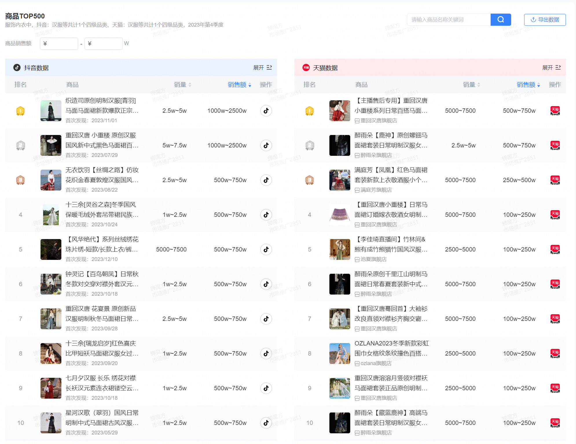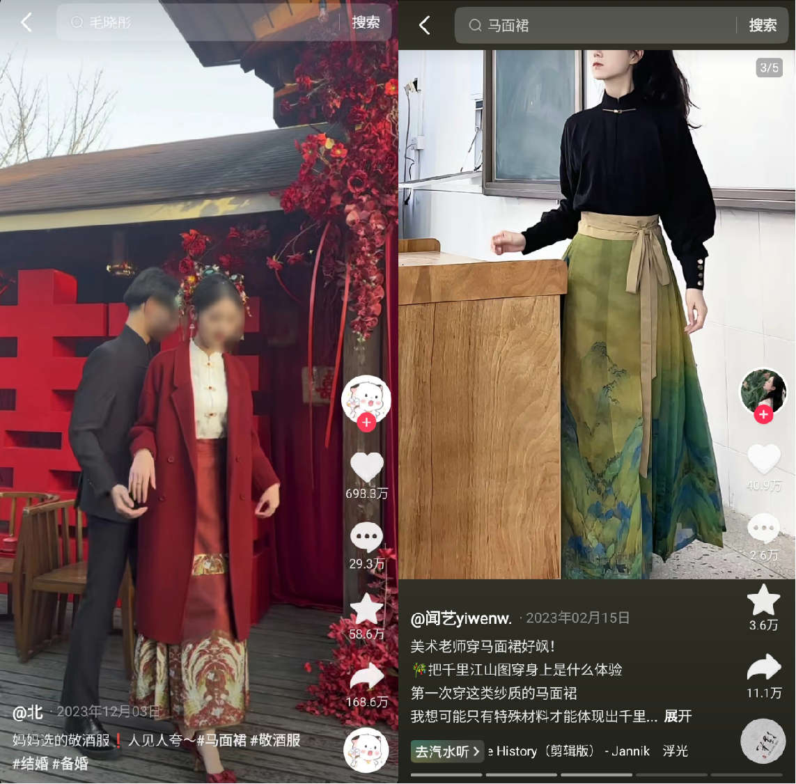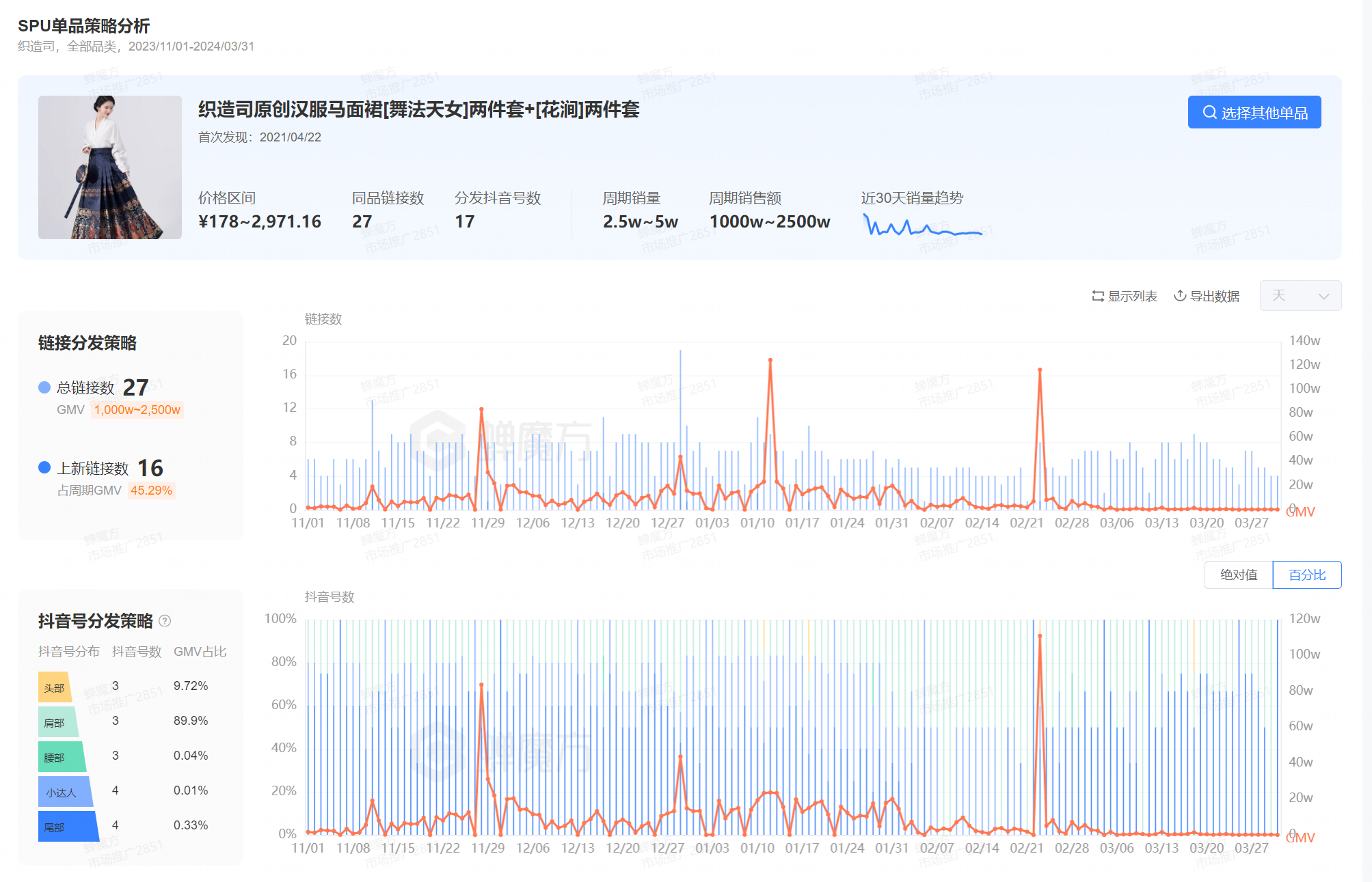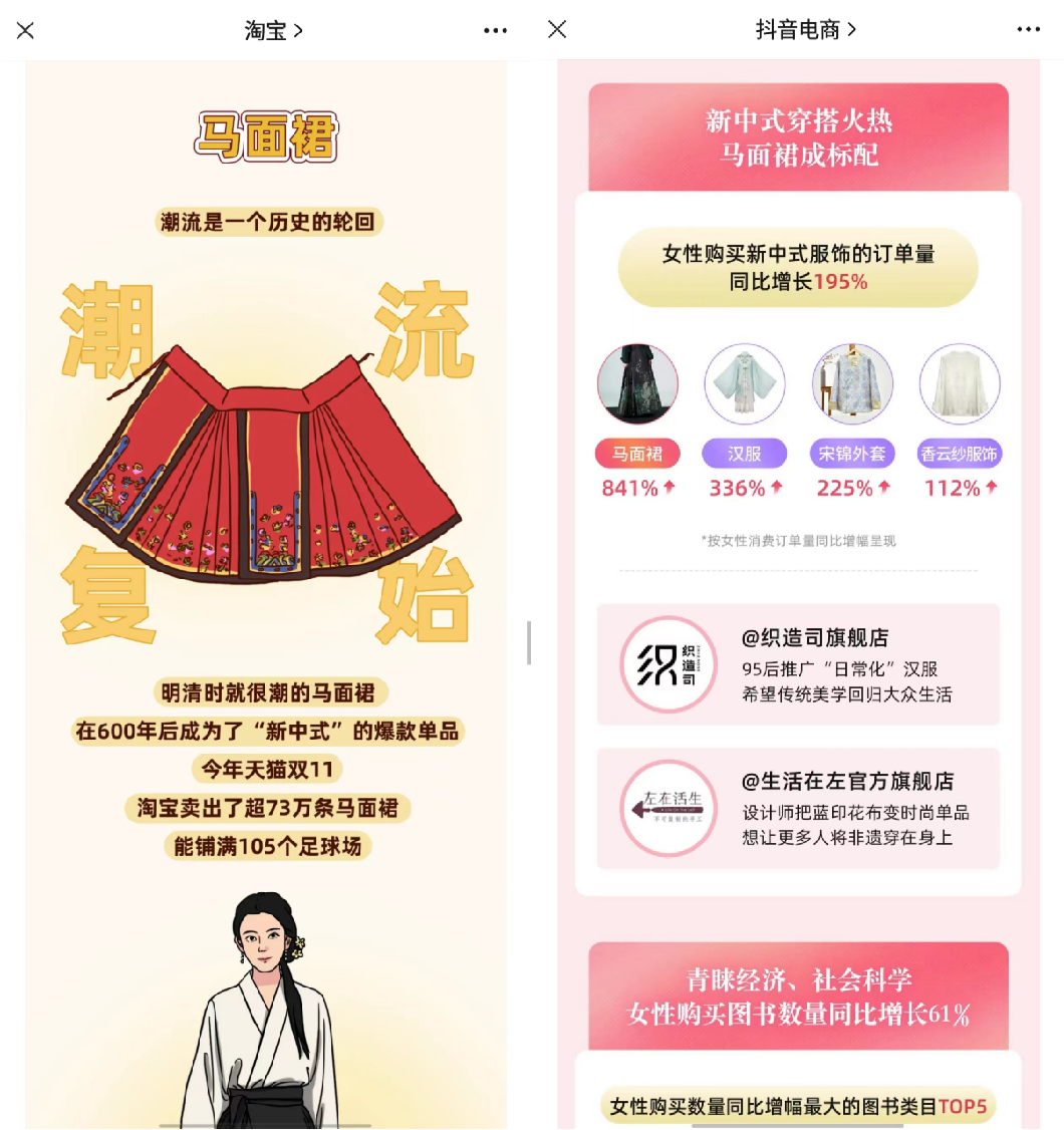 这个春天,马面裙又火了。 你发现了没有,最近在人潮涌动的大街上、地铁上、商场里,总能看见不少马面裙的身影。 根据央视财经报道,今年春节期间,作为汉服生产基地的山东曹县,生产的马面裙销售额接近5.5亿元,工厂的加班加点也赶不上订单的速度。 为什么马面裙会成为这个春天顶流?有哪些品牌分到了红利?新中式营销到底赚不赚钱? 今天,我们要聊的是:马面裙 X 新中式营销。 01 马面裙成为黑马,老祖宗审美太高级了 马面裙的历史有近千年,但是从冷门到出圈仅用了短短2年。 2022年7月,Dior发布了一条售价高达2.9万元的中长半身裙。随后被网友发现,这款裙子与马面裙几乎一模一样,一场有关抄袭、文化挪用的全民讨论由此展开。 ![]() ▲图片来自网络 Dior未对此事做正面回应,也很快下架这款裙子。但是不久后,演员徐娇就身着马面裙走在了金鸡奖的红毯上;不少明星也将马面裙作为日常私服,成为了野生的代言;越来越多的汉服爱好者也自发地穿上马面裙,出席各种场合。 ![]() ▲图片来自微博 “最好的保护方法就是穿出去”,成为马面裙的复兴口号。 现在,当你打开抖音,除了中产热爱的冲锋衣、瑜伽裤,马面裙已经是日常穿搭下的热门话题。话题#马面裙 在抖音播放量超过210.1亿,#马面裙搭配 超过1.1亿。 ![]() ▲图片来自抖音 从婚礼现场,到巴黎卢浮宫,马面裙亮相于每一个角落;从潮流萌孩,到银发一族,马面裙也受到不同年龄层的用户青睐。 在相关视频的评论下,一生要链接的中国女孩,纷纷留言“蹲一下店铺”、“有链接吗”,马面裙红得彻彻底底,逐渐走出了汉服圈,从小众走向大众,成为日常单品。 ![]() ▲图片来自巨量算数 截至2024年3月底,抖音#马面裙 话题投稿数量超过157万条,并且其相关话题的在过去一年内热度持续增长。 内容火热出圈,很快带动商品销量的增长。根据蝉妈妈显示,在抖音“马面裙”相关商品销量近一年来持续攀升,尤其在23年底至24年初,近3个月的时间内销量有着大幅增长。 ![]() ▲图片来自蝉妈妈 马面裙的一路狂飙,带动着汉服市场成长为一个年销近百亿的市场。 新中式营销爆火,品牌如何接住热度? 2023年双11,淘宝卖出了超过73万条马面裙,可以铺满105个足球场,马面裙也被评为2023淘宝年度十大商品;2024年抖音发布《2024抖音电商女性消费趋势数据报告》显示,在抖音电商,女性购买新中式服饰订单量翻倍,其中,马面裙尤为亮眼,订单量同比增长841%。 ![]() ▲图片来自淘宝、抖音电商公众号 2023年,抖音女装汉服赛道总销售额超过10亿元,同比增长488.7%,TOP5品牌集中度为20.93%。2023年第4季度,抖音、天猫双平台商品TOP10 中,各有7款马面裙商品。 在抖音,目前新中式女装行业的头部品牌依旧是早期原创的汉服品牌。如织造司,爆款单品均为23年爆火的马面裙。织造司在抖音、天猫平台双双上榜,双平台各有一款马面裙销售额排进TOP3。 ![]() ▲蝉魔方-商品TOP500 织造司将品牌定位为“谁都可以穿的汉服”,将马面裙经营成日常化的服饰。从织造司抖音账号的内容中,能看见模特穿着马面裙穿梭在商场、地铁站等通勤场景。 ![]() ▲图片来自抖音 汉服品牌在抖音经营方面,更多采用“内容引流+品牌自播”的打法。 以“织造司原创汉服马面裙[舞法天女]两件套+[花涧]两件套”为例,这款商品最早在2021年4月发布,而近3个月,这款产品的总链接数只有27条,分发抖音号也只有17个。重回汉唐、冬下等汉服头部品牌几乎都采用相同的单品策略。 ![]() ▲蝉魔方SPU单品策略分析 传统与现代混搭,马面裙为何出圈 汉服的基本款式,从形制上主要有“上衣下裳”制、“深衣”制及“衣裤”制等类型。在基本款式下,又因为其领口、袖型、束腰、裁剪及搭配等方式的不同变化,演化出数百种款式。 那么,在这么多的款式中,为什么只有马面裙能够火出圈,穿越千年,再次成为人们的日常单品呢? 一、穿搭场景趋向日常 起源于宋朝马面裙,早期是为了方便女性骑马而设计,具备简洁、便捷的特点。从款式上来看,传统马面裙的前后有4个裙门,两两之间互相重合,光面则由中间裙门部分重合而成。 现在马面裙则在此基础上进行了改良,在裙门处增加暗扣,还在裙褶里增加了内袋,更加符合人们日常的穿衣习惯。 ![]() ▲图片来自抖音 在新中式复兴的潮流中,马面裙更加符合人们日常生活、工作、学习的生活场景。 从抖音的内容来看,越来越多人将马面裙作为婚宴的敬酒服、旅行穿搭,甚至是走向课堂、通勤、日常办公,马面裙正在逐渐渗透至日常生活中。 二、搭配简单多样 传统汉服有严格的制式要求,一套完整的汉服分为领、襟、衽、衿、裾、袖、袂、带、韨等10部分。穿着整套传统汉服出门,并不是一件简单的事情。 随着越来越多的人被种草入坑,马面裙开启了现代与传统的混搭,对于不曾深入了解汉服的外行人看来,马面裙更加接近“加长版的百褶裙”,日常可以搭配毛衣、衬衫等服饰。 此外,马面裙对于身材的包容性很强,无论是什么样的身形都能够穿,甚至已经有不少男性开始在社交媒体上发布自己穿着马面裙的内容。 ![]() ▲图片来自小红书 对于汉服圈内而言,这样的穿搭方式实在是有点“不伦不类”、“不尊重传统”,甚至在小红书等平台引发争议。 但同时也意味着马面裙越来越受欢迎,正在走出小众圈子,走向大众的日常生活当中。 三、价格亲民 曾
