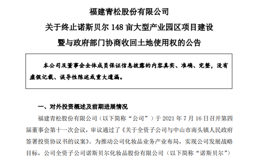 记者丨王杰仁 见习生丨卓西峰 出品丨鳌头财经(theSankei) 放弃松节油深加工业绩,成为一家化妆品企业,青松股份(300132.SZ)的转型赌对了吗? 4月12日,青松股份发布公告显示,公司拟终止148亩土地项目建设。 此前,青松股份收购的企业诺斯贝尔,拟将上述土地用于生产车间、办公及研发大楼等的建设。 不过,由于业绩不佳,青松股份的产能利用率并不高。此时,青松股份的148亩土地项目成了公司“累赘”。 不仅如此,青松股份转型后业绩表现“满目疮痍”,公司旗下诺斯贝尔在对赌期后业绩“翻脸”,使得上市公司近三年净利润累计亏损超17亿元。 有业内人士表示,面膜、护肤品和湿巾毛利率较高,技术门槛并不高,市场上品牌较多,企业之间竞争激烈。 青松股份的前景如何,现在来看还难言乐观。 诺斯贝尔对赌期后业绩翻脸 4月12日,青松股份发布公告显示,公司董事会对148亩土地项目进行了充分讨论,认为在化妆品行业未全面复苏的背景下,终止148亩土地项目建设,并与政府部门协商有偿收回土地使用权,有利于公司降低生产经营成本,减轻资金压力,降低公司借款规模和资产负债率,符合公司在行业环境未明显好转的情况下实施降本增效、努力提升生产效益的经营目标。 青松股份所说的148亩土地项目,来自2021年的一场项目。 ![]() 青松股份透露,截至2023年12月31日,148亩土地项目已完成土地平整,并已完成12000平方米的基础桩工程,累计建设投入约1335万元。 2021年7月,青松股份公告称,为推动公司化妆品业务产业布局,实现公司发展战略目标,公司全资子公司诺斯贝尔化妆品股份有限公司(简称“诺斯贝尔”)与中山市南头镇人民政府签署了《南头镇工业项目投资协议书》。 投资协议书约定,中山市南头镇人民政府将位于南头镇一块总面积为98858.7平方米(折合148.288亩)的工业用地土地使用权通过公开出让以有偿、有期限的方式提供至诺斯贝尔参与竞拍,用于建设集生产车间、办公及研发大楼、智能仓储、员工生活中心于一体的大型产业园区。诺斯贝尔承诺项目固定资产投资不低于9亿元,达产后年产值达到18亿元,年税收达到9000万元。 2021年11月,诺斯贝尔竞得了位于中山市南头镇穗西村编号为G02-2021-0057的国有建设用地使用权(上述148亩土地),成交总价为1.14亿元。 资料显示,2019年2月28日,青松股份以24.3亿元收购诺斯贝尔90%的股份。2020年,公司又追加4.3亿元,完成剩余股份的收购。 诺斯贝尔专注于面膜、护肤品、湿巾和无纺布制品等产品的设计、研发和制造,是中国本土规模最大的综合型化妆品生产企业之一,公司业务经营模式以ODM为主,为下游的品牌商提供从创意到产品、设计与制造等全案服务。 收购时,诺斯贝尔承诺,2018年至2020年公司扣非归母净利润合计不低于7.28亿元,实际累计完成业绩7.4亿元,对赌成功。 然而,2021年,青松股份实现营业收入36.93亿元,同比下降4.44%;净利润亏损9.12亿元,同比下降297.85%。 其中,诺斯贝尔实现营业收入25.09亿元,同比下降6.05%;实现归属于诺斯贝尔所有者权益的净利润-5489.56万元。 同时,青松股份对与诺斯贝尔相关的商誉计提归属于母公司的商誉减值准备9.13亿元。 销售费不减研发费大降 豪赌化妆品业务,使得青松股份业绩持续下降。 需要提及的是,2022年末,青松股份完成松节油深加工业务剥离,公司主营业务结构同比发生重大变化,从化妆品制造、松节油深加工两大业务板块变成化妆品单一业务,公司的主要收入与利润集中于化妆品业务。 2022年,青松股份实现营业收入29.17亿元,同比下降21.01%;归母净利润亏损7.42亿元,同比下降18.56%。 其中,诺斯贝尔实现营业收入20.78亿元,同比下降17.17%;实现归属于诺斯贝尔所有者权益的净利润-2.3亿元。 同年,青松股份对诺斯贝尔计提了商誉减值准备4.53亿元。本次计提商誉减值准备后,公司商誉账面价值为零,两年累计减值13.66亿元。 ![]() 业绩下滑之下,青松股份产能利用率也随之下降。数据显示,2020年至2022年,公司面膜系列产品产能利用率分别为41.03%、38.54%和32.14%,护肤品系列产品产能利用率分别为76.30%、38.04%和28.34%,湿巾系列产品产能利用率分别为73.46%、36.24%和18.69%。 在甩掉商誉后,青松股份并未实现盈利。 近日,青松股份发布2023年度业绩预告显示,公司营业收入预计19亿元至20亿元,同比下降31.44%至34.87%;净利润预计亏损5000万元至6300万元;扣非净利润预计亏损4800万元至6100万元。 青松股份表示,2023年以来,公司部分客户的面膜和护肤品订单需求仍有待复苏,海外市场对湿巾产品需求进一步减弱,湿巾出口订单同比仍有较大幅度下滑。 综合来看,青松股份近三年净利润累计亏损超17亿元,而且公司产能利用率大概率进一步降低,这也是公司终止148亩土地项目建设的主要原因。 实际上,在业绩大幅下滑之时,青松股份在销售上的花费并没有降低。 2023年前三季度,青松股份销售费用达3519.91万元,同比增长4.65%。同期,公司研发费用达5093.52万元,同比下降44.19%,研发费用大幅下降并不利于公司长期发展。 二级市场上,2021年4月,青松股份股价一度达到了24.96元/股,如今不足4元/股,连一个零头都不到,三年的降幅达高达84%。 有业内人士表示,化妆品市场上,面膜、护肤品和湿巾毛利率较高,技术门槛并不高,市场上品牌较多,企业之间竞争激烈。 以主要生产面膜的企业为例,2023年前三季度,敷尔佳实现营业收入13.39亿元,同比增