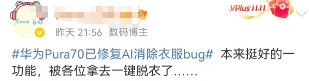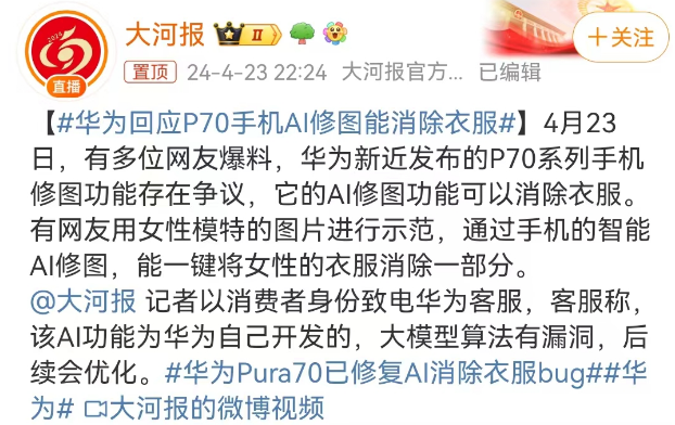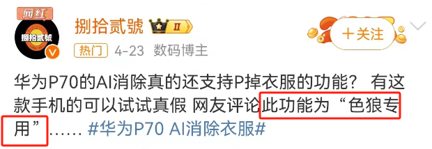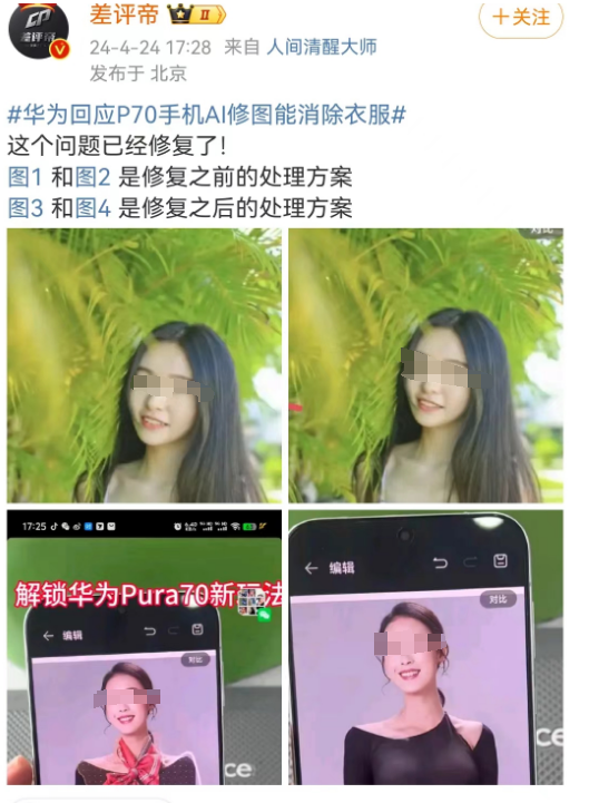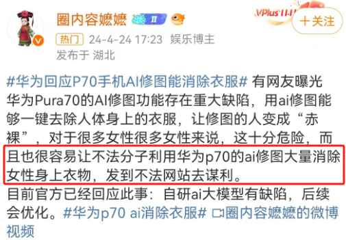 作者 | 杨阳 来源 | 顶尖广告 自从华为将P70改名Pura70后,可以说热搜不断。 前有Pura70被曝“不讲武德”。 先是搞突袭开售,数码圈都沸腾,感觉所有华为门店都在大排长龙,据说不少人现场排队3小时。 后有Pura70被曝“不讲伦理”。 华为Pura70开售刚火,P70系列手机的修图功能因为“一键脱衣”火了。 虽说只要我不尴尬,尴尬的就是别人,但P70系列的修图实属火得尴尬。 ![]() ![]() 图源:@大河报 01 一个修图还能多复杂,调调光美美颜也够用了。但华为Pura70手机修图的功能,有亿点点炸裂。 网友反馈,当用Pura70的图像编辑时,可以移除不想要的障碍物、调整图片元素。 于是接着往下扒发现,这玩意儿居然可以“一键消除衣服”。 有人就做了示范,对照片中的女生胸口处衣服涂抹,随后华为AI消除会对照片进行处理。 ![]() 图源:@大河报 接下来神奇的一幕出现了:原来胸部部位裹得紧紧的,突然变暴露了。 ![]() 图源:@大河报 你说这个功能,本来形容“消除衣服”还没啥。 但随着舆论的发酵,风评的走向逐渐变了,演变成“一键脱衣、色狼专用”,这话题的性质就彻底变了。 ![]() ![]() 也有人替修图功能喊冤,毕竟主要看人怎么用。 ![]() ![]() ![]() 新机刚发售就遇到这种事,华为当然急了,赶紧回应: 是自研AI大模型有漏洞,后续会优化,是属于功能 BUG。 目前根据用户反馈,华为Pura70的AI漏洞已经修复,相关消除功能现在已经被禁。如下图显示,会提示图片无法使用消除功能。 ![]() 图源:@新浪科技 还有相关博主也进行对比,晒出修复前后的不同方案。 ![]() 图元:差评帝 02 技术问题一下子变成社会伦理问题,华为手机的修图热搜,再次把AI推到了风尖浪口。 ![]() 这几年AI彻底火了,还带火“AI换脸”、“AI绘画”、“AI复活”等。 毫不夸张的说,有时候砖家和专家之间,就差一个AI而已。 但就像一把刀,落在厨师的手上,只是切菜刀。如果落在坏人身上,可能就变成砍人刀。 AI技术是一把双刃剑,用对了,是化腐朽为神奇的武器;用错了,是伤人伤己的利剑。 正如看到AI修图“一键脱衣”的功能,有人担心不法分子利用华为p70修图谋利。 ![]() 图源:圈内容嬷嬷 不过话说回来,AI“一键脱衣”并不陌生。 2019年一款名DeepNude的应用刷屏全网,很大程度上是其“脱衣”功能引争议。 给它一张照片,它就可以分辨出照片人物图像中的衣物纹理,通过合成处理,生成看似脱去衣物的图像,据说斯嘉丽·约翰逊、盖尔·加朵等女明星都遭过殃。 ![]() 图源:职场博物馆 可以说,AI技术被用于恶意传播,女明星是重灾区,这里就不得不提杨幂。 作为内娱女菩萨,杨幂是流量担当的话题女王。AI的出现,也让杨幂沦为网友调侃和蹭热度的对象。 ![]() 你可能在1994年版《射雕英雄传》看见杨幂。 B站一个叫“换脸哥”的用户,曾将94年版《射雕英雄传》黄蓉饰演者——朱茵的脸,换成杨幂的脸。 ![]() 图源:界面新闻 从脸型到表情,可以说过度十分丝滑,看起来一点都不违和。 别以为AI换明星脸的灰色产业,只是涉及侵犯隐私和误导他人,最恐怖的是让明星变成不可描述片子的主角。 比如有人通过AI换脸技术,制作女明星不雅视频不雅照进行售卖,所以你可能还在某些网站里看见女明星被明码标价。 ![]() 在直播时代女明星也躲不过AI。面对动辄几十万的明星坑位费,换来只有几单交易。明星带货沦为走过场,坑位费变成被坑费..... 终于有人开始整顿直播行业,干脆把主播改头换面。 不是明星请不起,而是ai技术更有性价比。 女装品牌SDEER和八马茶叶的直播间,就试过通过AI实时“换脸”技术,把普通主播换成杨幂、迪丽热巴等明星样。 ![]() 图源:法制日报 03 AI不仅被用来代言,还打得了广告,这就要说到被疯狂吐槽的ai海报。 这两年文心一言、chatgpt、Sora等崛起,创意设计坐不住了。 今年春晚,当央视春晚设计搬出吉祥物龙辰辰,网友吐槽一股子ai味。 ![]() ![]() 图源:央视新闻 春晚吉祥物你可以选择不看,但如果当ai广告出现在你通勤的地铁上,出现在你回家的电梯里时,那叫一个无处可逃。 坐电梯时,有品牌建议你过年,要吃预制菜,看ai春晚,过加班除夕,品赛博人生。 ![]() 图源:@深圳张逸轩 这广告营造了一个人过年吃一桌子预制菜的场景,和AI生成的家人视频,看完不知道是过年还是过鬼节。 坐地铁时,深圳报业地铁传媒夸你:认真工作的样子真精彩。 ![]() 图源:设计圈 咱不确定是不是公司把美工全辞退了,但可以确定的是,看完这无神的大眼睛,恐怖谷效应犯了。 说起来这些AI创意之所以被diss,很大程度上是出品过于失真,人物形象和造型看起来不够真实,画面缺乏温度和情感,跟传统节日和生活场景的气氛严重脱离,让人喜欢不起来。 所以哪怕技术再强大,缺乏诚意的广告,很难把创意做进网友的心里,被骂也就不冤了。 04 AI的技术发展虽然存在争议,但我们也看到了AI赋能行业的可能性。 你的下一个头部主播,又何必是真主播? 你的下一个创意,又何必是广告人做的? 眼看淘宝有李佳琦,抖音有小杨哥,东方甄选有董宇辉。 京东也急了,不久前发布刘强东数字人形象开启直播首秀,不到1小时直播间观看量超2000万,整场直播累计成交额超5000万。 ![]() 图源:零售商业评论 之前薇娅公司也被曝进军AI 数字人直播业务,打造AI“薇娅”野心藏不住了。 不可否认,比起真人直播,数字人直播可以节省下人力物力财力,降低直播运营成本; 还能做到随