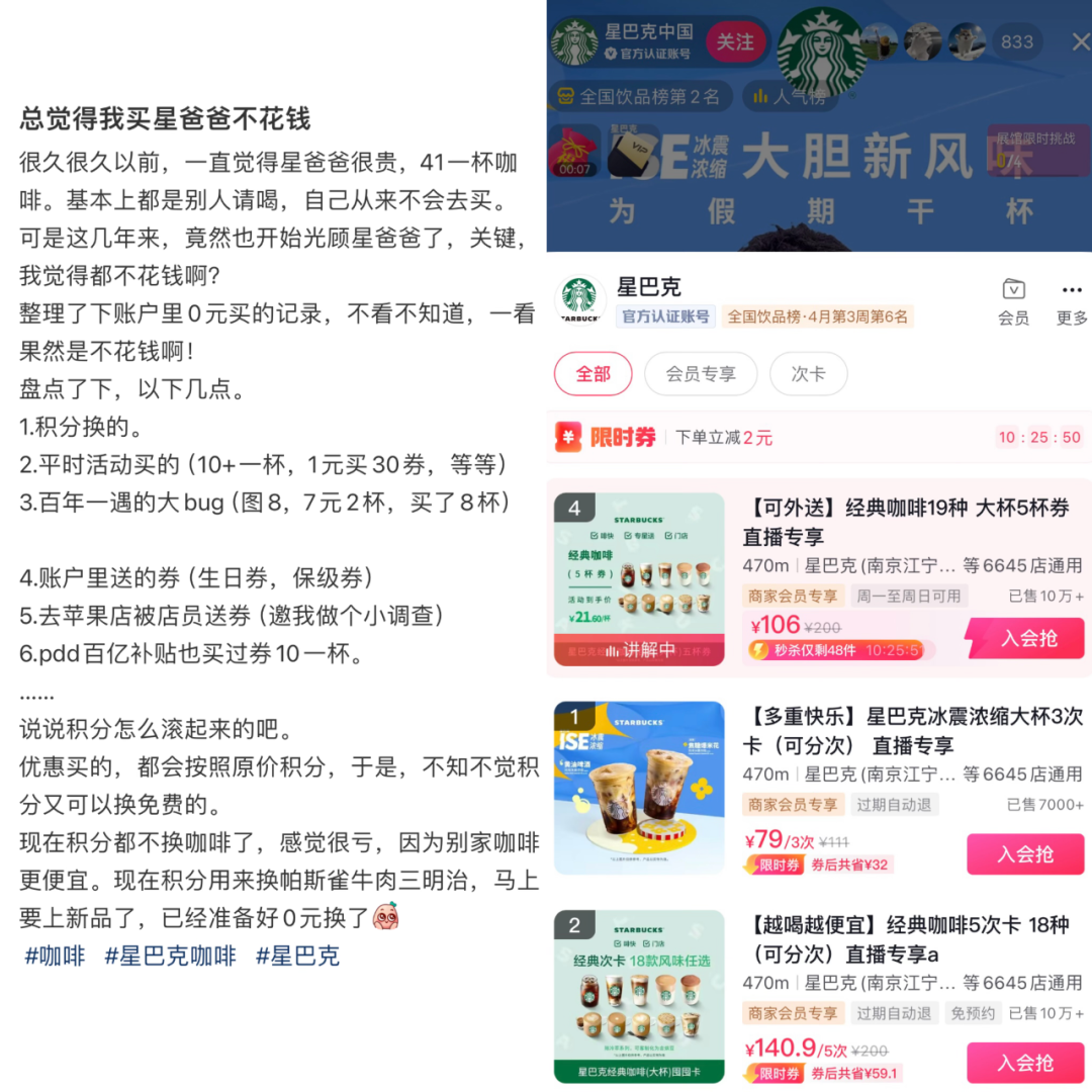 来源:财经无忌 越来越多的打工人发现,曾经让他们付款时感到囊中羞涩的星巴克,正在悄悄降价。 多位星巴克多年忠粉的消费者告诉「财经无忌」,他们的星巴克卡包里被派送了很多“39.9两杯”、“49.9两杯”的优惠券。在不少电商平台上,星巴克也推出了“106元、103元/5杯”、拼团等优惠。“平均下来一杯20元不到,和9.9肯定还有差距,但和星巴克之前的定价相比已经降很多了。”一位消费者这样评价。 ![]() 星巴克大力促销,图源:社交媒体、电商平台截图 在小红书等社交媒体平台上,也出现了诸多“星巴克如何买更便宜”的薅羊毛教学贴。不久前星巴克一年一度的“地球日免费咖啡”的活动更是引发了不少门店的排队打卡现象。 在中国咖啡9.9元的商战中,星巴克的价格下探已成既定事实。但就在不久前,来访中国的星巴克创始人霍华德·舒尔茨却又再次嘴硬地表示:“(星巴克)没兴趣加入价格战”。这种言行不一的“双面态度”越来越多地展现在星巴克对中国市场的布局上——不管是加大县域的布局,还是产品、营销的中国本土化尝试,二十多年来,星巴克一直很努力,但却似乎成为了最不懂中国的存在。 双面星巴克,究竟何以至此? 01.“嘴硬”的星巴克,偷偷降了价 过去一年间,由库迪率先推出、瑞幸跟进,随后成为行业基本操作的“9.9元”低价策略,让中国咖啡行业成为了竞争红海。但区别于竞争对手们的坦诚态度,星巴克在“降价”这件事上一直都显得十分“嘴硬”。 不止是创始人霍华德·舒尔茨,星巴克中国首席执行官王静瑛也在公开场合多次表明:“星巴克对卷入价格战不感兴趣”。 但财报数据却在悄悄打脸。星巴克中国2024财年Q1财报显示,尽管整体收入、同店销售额、同店交易量都呈现正增长,但该季度中国门店的平均客单价却同比下滑9%。量上去了,价却在下滑。尽管针对“客单价下滑”,星巴克中国反复强调是在“尝试有针对性的促销、个性化的优惠鼓励消费者增加购买频次”,但这也说明了其实星巴克已经在中国自降身价。 一边说自己不参与咖啡行业的价格战,但另一边实际通过各类促销和布局新兴渠道,悄悄降价,口嫌体正直的星巴克自降身价的原因是多重的,既是无奈地被动卷入,当然也是有意为之。 首先,当前消费市场正在经历低价周期,对于相对高频刚需的饮品行业而言,低价已成为必需的武器。过去一年至今,打了一年的咖啡行业“价格战”声势虽有放缓,比如瑞幸等巨头对价格策略进行了针对性地调整,但低价显然已成了行业新人最直接的引流手段,老人提升老客消费频次的关键动作。 不久前,百胜集团旗下的肯悦咖啡KCOFFEE就通过“全场9.9”的限时活动,在消费者中赚了一波好感。据「财经无忌」观察,至少在营销和产品侧,库迪、瑞幸等玩家也并未停止强调“低价策略”,只不过玩家们在“降价”上的玩法和动作更加多元与隐蔽,具体表现为以下两点: •在产品端,“组合式降价”越来越多。咖啡玩家们擅长通过“明星产品+其他产品”的组合式促销,带动不同梯度产品的销量。•在营销侧,通过匹配企业的典型品牌活动将“降价”包装成为一种品牌价值的宣传。典型如MANNER的“咖啡送杯”活动、星巴克的“地球日免费喝咖啡”活动等。 ![]() MANNER的“送杯”活动和星巴克的“地球日免费喝咖啡”, 图源:品牌公众号 其次,线上电商和本地生活巨头的低价补贴大战,也给星巴克的“低价”带来了东风。 星巴克在上季财报中,特别提到了其数字业务(专星送和啡快)的持续增长。星巴克中国入驻抖音已有多年时间,目前,官方账号粉丝已超500万。早在2021年,据媒体报道,星巴克中国直播GMV就超过1200万,是抖音咖啡行业的“头部梯队”。 「财经无忌」观察“星巴克中国”抖音直播间发现,趁着抖音本地生活的东风,星巴克中国吃到了团购的红利,据“抖音团购全国周榜”显示,在今年4月前三周,星巴克中国的排名分别为25/39/77位。 ![]() 星巴克中国抖音直播间,图源:抖音截图 星巴克也同样很早与美团外卖合作,打通了会员数据,双方合作也不止在配送上,更衍生到美团的直播内容端。去年4月,美团开启首场外卖直播,6月打出首个餐饮618。在去年618美团的神券节活动中,星巴克就推出美团外卖专属新品,靠着19.9元的美团神券,收割了一波新客。 ![]() 星巴克参与美团618神券节活动,图源:网络 可以说,在美团和抖音的本地生活的竞争中,官方流量倾斜和大笔补贴下,巨头大战,作为头部商家的星巴克吃饱红利。 不过,在上述外因下,星巴克选择“自降身价”也离不开内因。 星巴克中国曾在2022年发布其2025中国战略愿景,在这一规划中,星巴克立下了“中国总门店数量达到9000家、净收入翻倍、营业利润为当前四倍”的激进目标,这也倒逼星巴克必须要对中国市场做出更多的转型尝试。 回到价格策略上,低价其实不是一种战略,低成本的低价才是战略。客观来说,星巴克在中国咖啡行业的“价格战”中,优势和劣势其实都很明显。 优势在于,星巴克具备完备的供应链,因此能更好掌控成本,同时随着星巴克加快在下沉市场拓店的节奏,依靠品牌力可以拿下相对少的租金,重资产成本降低,规模优势均摊成本,确保盈利。 但劣势也摆在台面上。低价所带来的后遗症其实是星巴克对高端定位的损耗。高端定位是星巴克品牌的区隔性所在,但也正是其如今在中国市