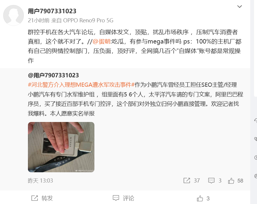 作者 | 赵普 编辑 | 趣解商业 "理想MEGA遭网络水军恶意攻击"一案,最近又有新进展。 3月1日,理想MEGA新车上市当天,有人将“奠”和“新能源殡仪车”等字样贴于车身进行恶意P图,随后该图在社交媒体形成传播,对理想MEGA营销造成较大负面影响。最终理想MEGA3月交付量仅 3000多辆,未达公司预期。 近日,“财新网”报道称,河北衡水警方正对涉事水军公司和公关公司进行调查,财新多方核实确认上述消息,另据了解,在MEGA上市期间,涉嫌参与打压的车企有三至四家,衡水警方展开多人次询问,小鹏汽车一名中层员工正在配合调查。 ![]() 图片来源:微博截图 对此,小鹏汽车立即做出回应,称“小鹏汽车也在积极配合警方对于供应商的调查”,并提请大家“不信谣、不传谣,不影响公安机关侦办案件。” “趣解商业”注意到,小鹏汽车上述回应中提到了“对于供应商的调查”,与“财新网”文中称“警方正对涉事水军公司和公关公司进行调查”互相对应。 到目前为止,这次理想MEGA被黑一事中,水军公司和公关公司已经成为重点调查对象,下一步是否要找出这些公司背后的“金主”也成为公众关注的重点。 有河北警方相关人员分析,类似这种网络信息的案件,一般都是共同犯罪,此外从舆论来看,已经对理想汽车形成较大负面影响,属于违法既遂。 01.小鹏汽车“冤不冤”? 因为“财新网”的报道中提及有三四家车企参与打压理想MEGA,但只点名了小鹏汽车配合调查,导致公众对小鹏汽车的关注比较集中。这让小鹏汽车有点委屈,并在上述回应中表示,“非常支持警方打击网络水军的行动。” 小鹏汽车还称,“小鹏X9上市以来也广受网络水军恶意攻击,相关负面报道多达5000余篇。针对此类水军攻击,小鹏汽车已经收集证据并向公安机关进行了报案,目前公安机关已受理。如有更新的信息,我们也会及时向公众披露。” ![]() 图片来源:微博截图 另据了解,“财新网”上述报道,还引发了自称小鹏汽车前员工的人士发文“爆料”。 当天有微博用户发文称,自己曾担任小鹏汽车SEO主管、经理,在他任职期间,“小鹏汽车有的专门水军维护组,组里有5、6个人,有专门的产品经理、程序员,有近百台手机,几千账号对自媒体号、论坛贴吧、微博置顶、发文点赞等进行控评。” ![]() 图片来源:微博截图 他还称,这个水军维护组从垂直汽车门户网站挖来专门的文案,还从某巴招聘程序员,“这个部门对外独立,归何小鹏直接管理,每年都有专门预算用于相关工作。” 随后,这位人士又发文声明,“理想和小鹏的事我也不清楚,今天看见小鹏水军的业务才进来的,只是告诉我知道的。” 上述人士认为,小鹏汽车通过群控手机在各大汽车论坛、自媒体号发文、顶贴,压制负面评论可以理解,但工作中有时“用力过度”,影响汽车消费者了解真相,这个就不对了。 不过,上述人士并没有公开个人信息,也没有进行相应的平台认证,目前小鹏汽车还没有公开回应上述言论。 此外引发网友热议的是,理想MEGA上市前后,有很多视频、帖子或自媒体文章拿理想MEGA价格对比小鹏X9价格,比如“一辆Mega=X9+G6”,一辆Mega=X9+小鹏P7,一辆Mega=X9+一块劳力士…… ![]() 图片来源:小红书截图 有接近小鹏汽车、理想汽车的业内人士谈论此事时表示,新能源车企彼此之间都非常重视“友商”的动作,比如新车上市、调整价格、优惠措施、人事变动等等。 也许是小鹏X9和理想MEGA的对比吸引了较多关注,这次“河北警方介入理想MEGA遭水军攻击事件”中,小鹏汽车也被“财新网”单独点名,不知道小鹏汽车“冤不冤”? 事实上,新能源车企之间的舆论战并不是新鲜事,不光是广大网友看到的“热闹”现象,很多车企也为此为公关公司、水军公司花费了大笔经费,但一旦被发现就触犯法律。 02.车圈品牌“乱战” 品牌联盟董事长、北京车友协会会长王永表示,业内共晓的是,不止一家汽车厂商设有相关的部门或团队在从事与友商相关的公关工作,尤其是一些新势力车企,持续大量公关做动作,针对多个厂家,理想应该也不例外。 王永还举例道,很多车企在发布新品时都会对比其他车企的同类产品,比如智己L6对比小米SU7,小米SU7对比特斯拉Model3,对比营销也无可厚非,但恶意诽谤就令人不齿了,甚至会受到法律的制裁。 “鹤蚌相争,渔翁得利,汽车厂商互相攻击最大的受益者恐怕是那些公关公司。”王永表示。 ![]() 图片来源:罐头图库 而“受伤”最大的可能就是“品牌战”中落败的一方,理想MEGA在这次风波中就“很受伤”。理想汽车CEO李想甚至在朋友圈发文称,“理想Mega被恶意抹黑事件”是“有组织的违法犯罪行为”。 专注于舆情监测的第三方机构“苗建研究院”监测数据显示,自2024年2月26日至2024年3月27日,“理想MEGA被黑“的全网相关舆情累计扩散4.48万条,舆情热度指数MJSI为70.56。 此外,#理想向平台投诉殡仪车P图等内容# 、#理想股价暴跌是因为MEGA销量不好吗#、 #理想MEGA遭遇“滑铁卢”说明什么#等话题登上今日头条、抖音、百度等6个平台热搜榜,累计在榜时长32小时。 ![]() 图片来源:苗建舆情 从苗建研究院梳理的MEGA事件时间轴不难看出,理想MEGA事件是比较有层次的发展。 先是2024年2月27日,网络上有文章评价理想MEGA在2023年11月广州车展亮相时过度营销;然后在3月1日理想MEGA上市当天,就有将“奠”和“新能源殡仪车”等字样贴于车身的恶意P图流出