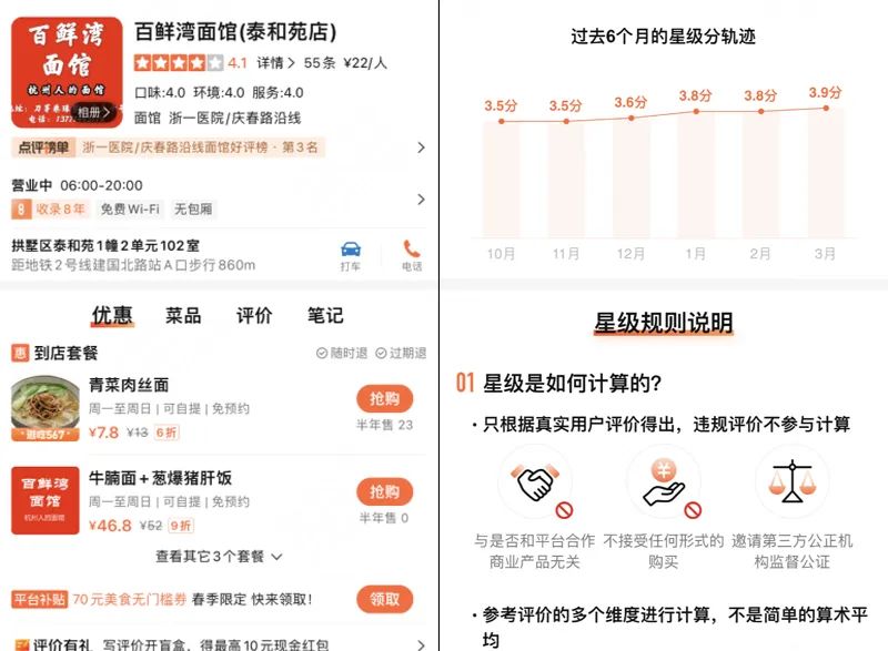 来源:新立场NewPosition 去年11月30日有用户发笔记称:“只有我发现了吗,好多评分低的店真的很好吃”。 一石激起千层浪,这篇笔记很快获得更多用户的感同身受,热评区还给出了具体可以参考的标准和评分区间:“大众点评收录五年以上”,“3.4-3.8”或“3.8-4.2”。后来在传播过程中,评分档位逐渐演化成统一的名词:3.5分餐厅。 这无疑是互联网时代的一种典型缩影:消费者自发形成的生活智慧,又通过互联网发酵形成了共振,并被更大范围地讨论、借鉴参考。 而此次“3.5分”现象来源于评分系统,最终直接作用力也在评分系统上。因果纠缠之间,不难催生出这样一个问题:在“3.5分”浪潮影响下,之前的3.5分,跟热潮过后的3.5分还是一回事吗? 为此我们接触了这个现象的主角,一些3.5分店铺(或曾经是)、关注过3.5分的消费者、以及平台,通过这三方的视角,来探究在发酵了一个多季度后,“3.5分”现象演变成了什么样子。 01、3.5分,从哪里来到哪里去 为了能够了解更全面真实的情况,我们选取了杭州、哈尔滨、湖南株洲这三座规模和气质迥异的城市,对这三座城市中一季度评分显著上升的店铺进行了探店。 杭州有家美团收录八年的“百鲜湾面馆”,去年11月份时店铺评分仅3.5分,到探店时已经来到了4.1分,基本信息十分符合上述网友所讨论的标准,因此这家店成为了我们的重点关注对象。 ![]() 得知我们的意图后,老板娘吴红华很热情。据她介绍,这家店已经开了九年,面是定做的,浇头也用料新鲜,面馆本身不算大,但除了最基本的卫生,还加了花花草草做点缀,“这样客人感受会好一些”。 “我们是那种典型的居民区街边老面馆,以前顾客大多数一些街坊邻居,或者在附近的上班族,把我们家当成‘片儿川(一种杭州本地的面食)食堂’。”当谈起服务意识时,老板娘举出以前的创业经历:“我以前是在杭州大厦做女装销售的,当时每天都让我们牢记‘客人走进来就是给你带钱来的’,所以我待客服务意识比较强。” 一家不仅口味得到本地人认可,服务、环境也都还不错的社区小店,为何在去年10月份之前的这么长时间内评分都没有超过3.5分? 吴红华坦言道:“我们以前都做老客生意,即便不做线上平台也能维持。可是受疫情影响,线下生意一直没完全复苏,直到前不久我们才开始注重起大众点评线上评分。” 一开始面馆评分却始终卡在4分以下,客流增幅也不明显。吴红华在询问平台工作人员后,得到的回复是:“评分没有变化,主要是因为评价量不够”。 恰好,今年年初,平台有工作人员给店里送来了评价二维码。起初,吴红华抱着试一试的心态,在每张桌子都贴上二维码,有老客人来了,便提醒他们方便的话可以留个评价。“以前我们做熟客生意,大家虽然喜欢我们店,但都没有习惯写评价。现在新老客人通过评价码,多少都会留下一些真实感受。”久而久之,小店靠正宗的口味,舒服的环境和暖心的服务,收获了一批好评,评分自然也就上去了。 与此类似的,还有湖南株洲的本地日料品牌——星野屋料理。 据这家店的彭老板介绍,他们在株洲已经做了十几年日料,虽然不乏年轻顾客,但仍然是熟客居多:“大家没有线上写评价的习惯,所以店开了一年多,评分一直维持在3.6分。” 后来彭老板通过大众点评免费申请了“评价码”,小店评分也从去年6月的3.6分,已经涨到了今年1月的4.4分。“现在我们在桌上贴了评价码,大家看到了,用手机一扫就能写,方便很多,我们线上评价量有显著的提升。” 由这两个案例不难看出,部分真的优秀的“3.5分”店家只需稍微注意评价积累,就能跟食客产生正向反馈,以优化自身运营能力,达成评分上涨。 几乎和“3.5分餐厅”浪潮发酵的同一时间,全国正掀起“尔滨”旅游热,有大量新食客涌入当地“3.5分餐厅”。 因此《新立场》将视角转换到了一家位于哈尔滨新阳路的地锅鸡烧烤店,店长告诉我们,“为了更好承接流量,迎接游客,店里对菜品做了些升级,还换了一批新的餐具,增加了几位服务员。” 去年12月初这家店线上还只有3.8分,不到一个月便上涨到4.4分。经统计,去年12月,随着一大批游客涌入哈尔滨,平台上有超过500家这样的哈尔滨本地宝藏小店提升了自己的评价量。过程中,一些真的好的小馆子,评分就能同步上涨,反之亦然。 这是大众靠嘴投票的结果。 当然在3.5分热潮期间有明显涨分的店铺之外,《新立场》也找到了一些早已达到高分的店铺。简言之,这些店铺先一步完成了评分上涨的历程,也即此次“3.5分”并非是一种特殊的社会现象,更像是网络情绪的一次偶有爆发。 广州的多福美食馆在2015年之前被收录到了大众点评,只不过一直到18、19年才开始做线上化经营。但后来的两三年,总评分一直卡在4.1分上不去。 老板根据食客留下的评价,分析问题或许出在环境上,于是决定从消费者率先感知的地方去改善,例如:换新台布,灯光换了更加光亮透明的,更新碗筷消毒设备,同时还花了大半年的时间调整了老员工的服务习惯。从去年年中开始,评分便开始缓慢上涨,来到了4.7分。 从上述几个案例不难看出,有的店铺原先在口味、环境、服务等基础条件上并无硬伤,他们所欠缺的只是通过提升运营承接流量的能力。据相关数据显示,大众点评平台上3.5分到3.9分的商户数量接近6成。这样及格以上优秀未满的分数段,其实是大多数还不错的餐饮店成长的必经阶