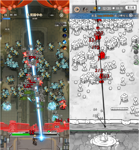 文/ET 来源/罗斯基 去年年底,由大梦龙途发行的黑白简约画风的塔防游戏《国王指意》成绩亮眼,在小游戏畅销榜Top20维持了一段时间。今年1月中旬,同样由大梦龙途发行的同玩法产品《向僵尸开炮》在国内上架APP端。根据七麦数据显示,《向僵尸开炮》iOS版在近3个月内,畅销榜排名稳步上升,稳定在Top10的位置。 ![]() 同时,在小游戏端《向僵尸开炮》也获得了不俗的成绩。以4月17日数据为例,《向僵尸开炮》位列微信小游戏畅销榜第3名。 ![]() 放眼国内的产品,能在小游戏端和App端同时实现成绩稳定上升的产品,实属凤毛麟角。 作为迭代之作,《向僵尸开炮》的成绩已经超越了《国王指意》。那么,产品侧新品制胜的点在哪?我们认为总结为三点:卷玩法卷对了弱点,卷美术卷对了方向,卷数值卷对了细节。 卷玩法:为什么《国王指意》类产品比其他同类更受青睐? 《国王指意》与《向僵尸开炮》无论在玩法规则思路、养成框架等方面,都十分近似。但是《向僵尸开炮》做到了同类产品所无法拥有的成绩排名,更多还是割草体感差距。但是细微体感差距,还是根据多个细节实现调整。我们在前提出过:当高度近似玩法下进行多个微改动后,即便是相同玩法在体感上会存在显著的差异。 如果将割草塔防游戏(包含如《怪物联萌》此类不具备roguelike属性的游戏)视为一个“涵盖RPG属性的消除游戏”,这类游戏在数值侧的关键点在: