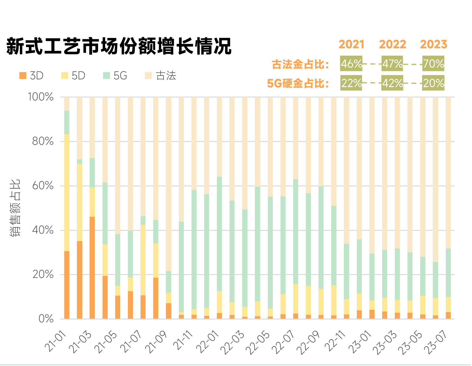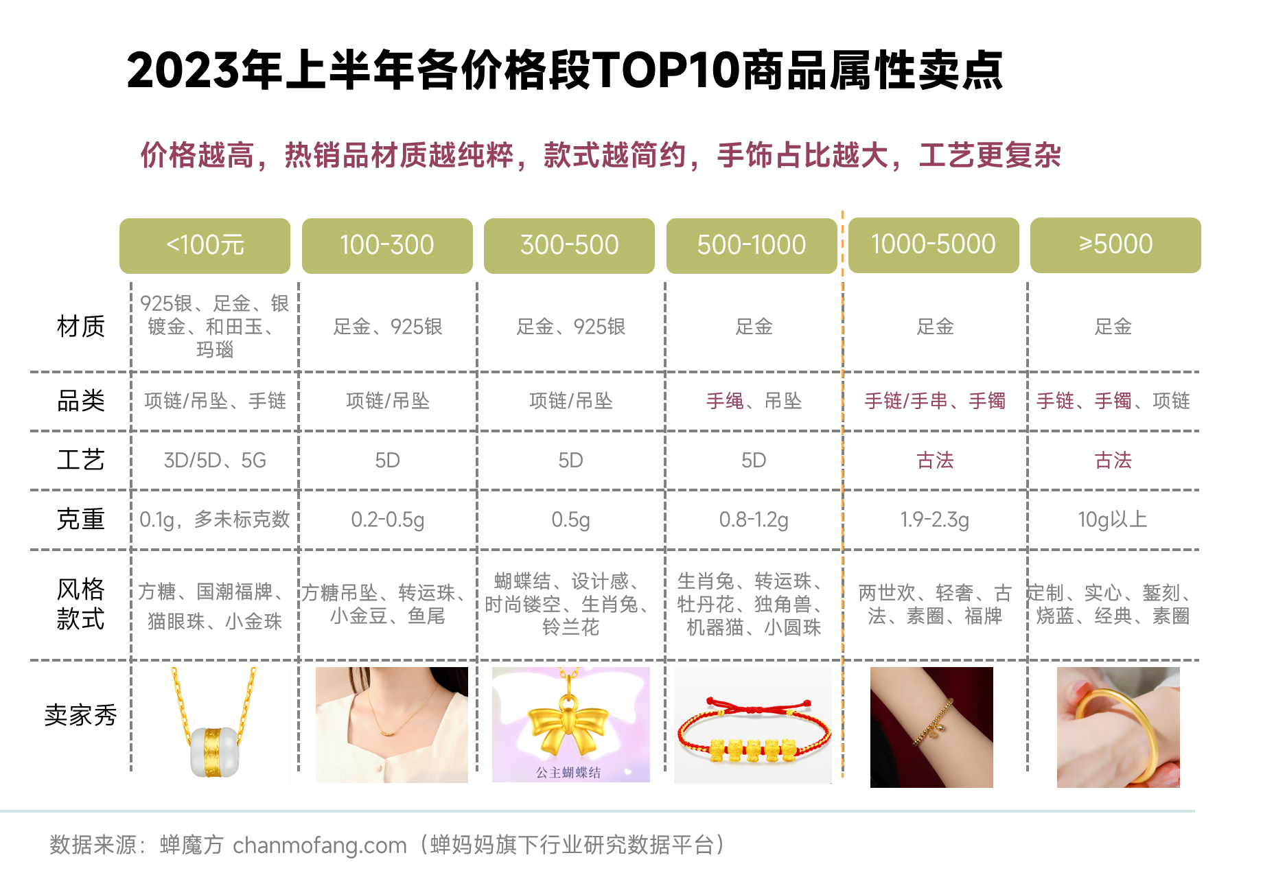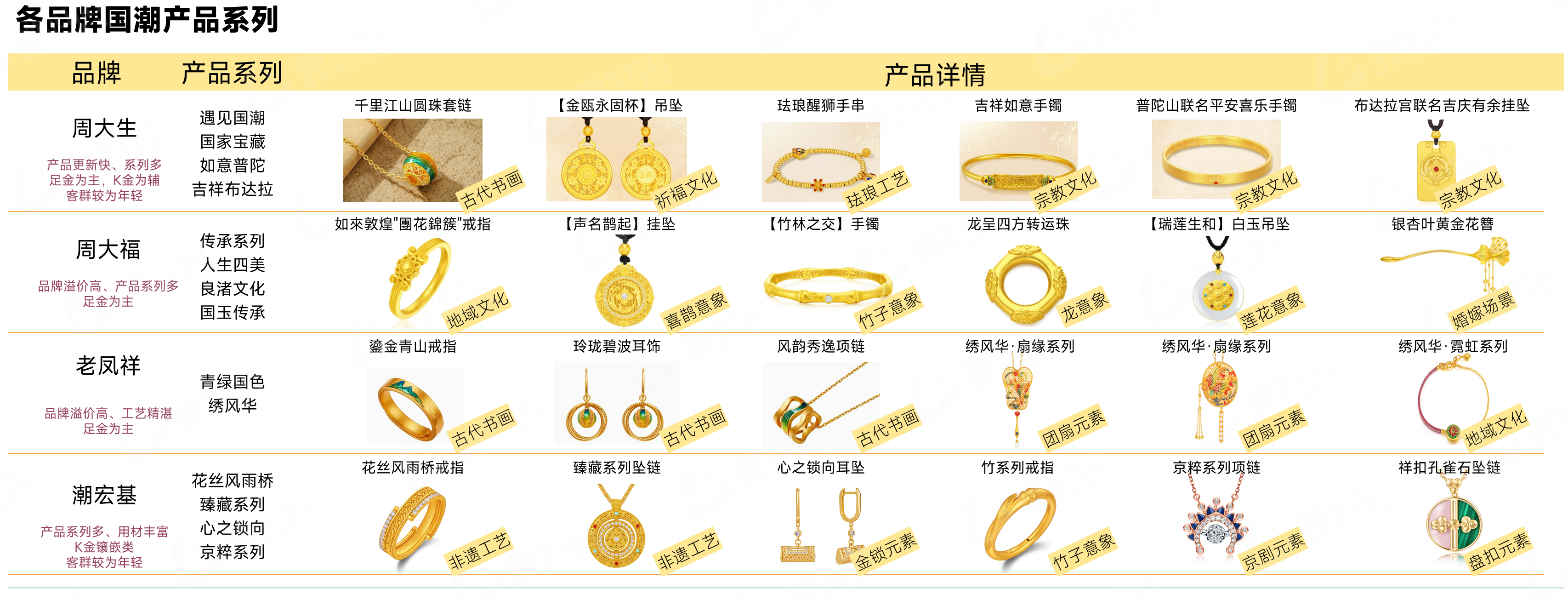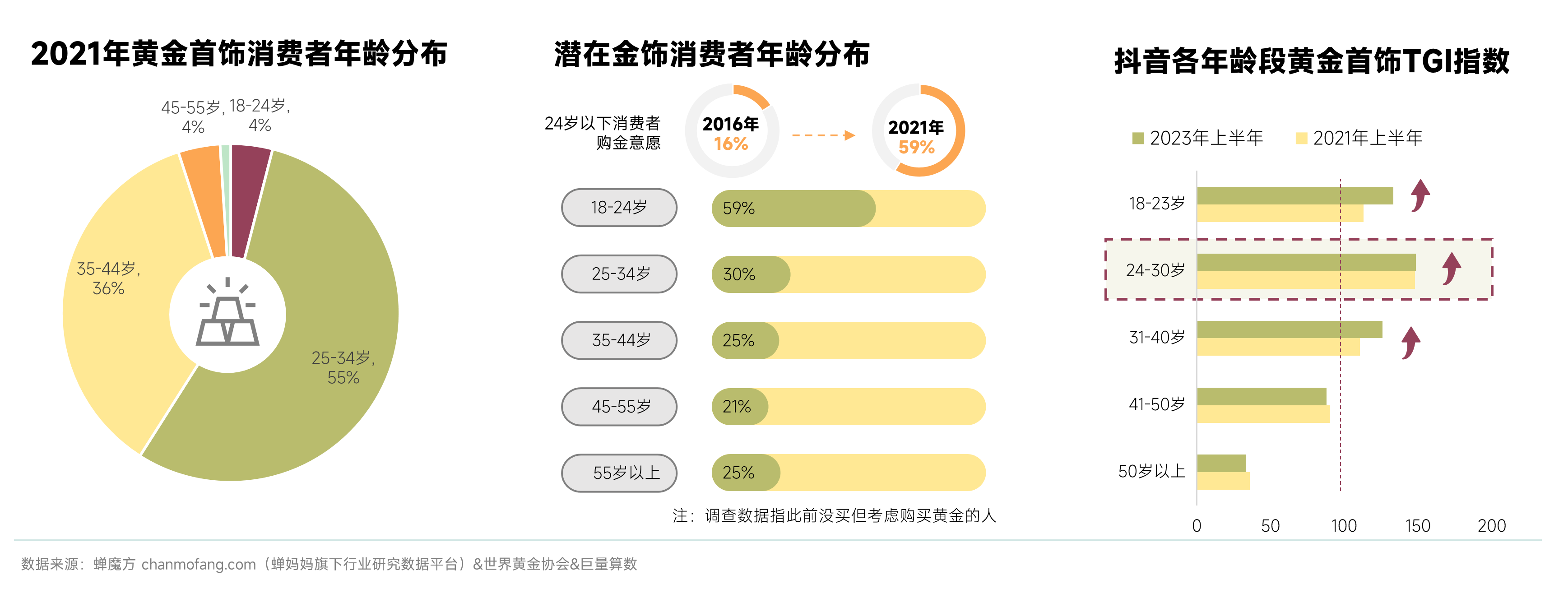 当地时间4月22日,伦敦现货黄金价格收于2327.01美元/盎司,当日跌幅达2.65%,国际金价创近两年单日最大跌幅。 这是黄金最近三个月以来,首次因为降价登上热搜。 ![]() ▲图片来自周大福官网 自2月以来,国际金价一路高歌猛进,频频刷新历史新高,也带动了黄金热销。 早在2月初,黄金品牌周大福,就因“平均每天入账2.5亿元”,引发社媒关注。 根据黄金品牌周大福官网显示,4月22日足金价格为733元/克,到了4月23号金价已下跌为715元/克。 ![]() ▲图片来自周大福官网 而在一个月前足金价格是650元/克,再往前推1年,足金的价格是580元/克左右,一个月涨幅超过10%,一年涨幅超过26%。 在这个追求理性消费,奢侈品纷纷吃瘪的时期,黄金到底有何魅力拿捏消费者?开始回落的黄金价格,会吸引更多人购买黄金吗? 01、黄货压邪,年轻人的“保值”投资 就像电视剧《繁花》中,玲子名场面喊出的那样,人们坚信“黄货压邪”。 ![]() ▲图片来自豆瓣 在经济增速放缓的环境下,人们对于“保值”的焦虑也越来越大,黄金作为硬通货,有着极高的抗风险能力,因此成为了最佳的投资选择。 根据蝉魔方显示,在刚过去的24年第一季度,抖音上黄金钻石类目,销售额超过50亿元,环比增长14.73%,同比增长34.89%。黄金销售额增长,离不开年轻人的一份力。 在小红书“黄金首饰”的相关话题下,也有不少“女大学生勇闯金店”、“00后大学生的第一枚金戒指”等标题的笔记,甚至还出现了「买金特种兵」的群体,他们在四处的寻找划算的黄金产品,并在分享攻略。 ![]() ▲图片来自小红书 根据《2023抖音电商黄金首饰行业观察报告》显示,黄金珠宝消费者集中于25-44岁,24岁以下未购将购黄金的消费者占比从2016年的16%增长至2021年的59%。 ![]() ▲2023抖音电商黄金首饰行业观察报告 国人黄金消费意识强烈,且具有持续增长空间,黄金的保值避险属性让消费近乎“无痛”,也是变相“攒钱”。 02、头号玩家遥遥领先,新玩家迎头直追 据不完全统计,仅23年上半年,抖音就出台超12条行业相关规范条例,并定期发布劣质货盘或商家违规行为专项治理公告,提高行业,尤其是黄金玉石产品准入门槛,优化运营生态环境。 ![]() ▲2023抖音电商黄金首饰行业观察报告 此外,抖音推出产业带溯源系列活动“宝藏文化行”,走进源头产地,提高商品在消费者心中的透明度和可信度,搭建消费者与产地优质商家、好物的桥梁。 ![]() ▲2023抖音电商黄金首饰行业观察报告 根据蝉魔方显示,2023年抖音平台黄金珠钻石类目 TOP5 品牌的整体集中度为32.75%,TOP5品牌分别为中国黄金(17.16%)、周大生(6.23%)、潮宏基(3.68%)、周六福(2.91%)、周大福(2.77%)。 黄金在抖音的带货销售方式还是以直播为主,2023年“直播”带来的销售额占比超过100亿元,占比超过91%。带货渠道上黄金钻石类目的品牌,基本以品牌自营号、商家自营号为主,占比均为40%左右。 以中国黄金为例,作为中国黄金行业唯一央企 —— 中国黄金,以超过40亿的市场规模遥遥领先,曾经连续13个月蝉联抖音电商黄金首饰销售额 TOP 1。 作为国内黄金的第一品牌,中国黄金在抖音上搭建了近百个官方授权的加盟商、直营店账号组成品牌自播矩阵,其中5个百万级粉丝账号,34个10万+粉丝账号,直播频率高,覆盖度广。 直播及账号突出央企背书、售后保障等信息,建立消费信任;统一直播风格、话术以及上架策略,保持直播热度,加大曝光量。 ![]() ▲图片来自抖音 另一个黄金行业较为显著的特征是较高的成交价。黄金行业有两个重要的价格段,100~300元价格段,商品销量占比最大;1000~5000元价格段,商品数量井喷式增长超过78万款,且销售额占比接近50%。 100-300元内的低价位引流款销量最高,产品款式和用材较为丰富,以普通工艺、硬金工艺为主,品牌以该价格段撬动流量;千元以上高客单价款承担盈利任务,产品材质纯粹,款式简约大方,以手部饰品和古法工艺为主。 ![]() ▲2023抖音电商黄金首饰行业观察报告 当然,黄金市场的繁荣,不单单源于黄金品牌们积极拥抱线上渠道,更多的是营销思路的转变,黄金去“土”化,是拿捏消费者的关键。 03、云鬓花颜金步摇,走向年轻的黄金市场 大金链子小金表,人人都知道黄金好,但过去的年轻人总是嫌弃黄金的“土”味。 但时代变了,黄金产品的选择变得繁多,无论形状款式,设计风格,工艺手法,还是品牌故事,总有一款让人眼放金光。 1. 买金条、囤金豆,是消费,也是投资; 在“保值”动力的驱使下,消费者的购买理念悄悄发生了变化,人们在选购黄金产品时,更加关注的是其稳定的“价值”。 购买黄金,不仅是为了“美”,更多的是为了“财”。据蝉魔方显示,2023年黄金钻石类目商品TOP10中,有6款商品是投资金条,但是在2022年,仅有一款“金豆”产品上榜。 IP联名,是品牌年轻化的有效途径。这也让一批黄金品牌,开始闻风而动。 IP联名具备情绪价值、强互动性和社交属性的萌系/治愈系IP,以及链接民族内涵、朝代文化的艺术IP是目前产品IP联名的两大趋势。 ![]() ▲图片来自微博 周大福X「迪迦奥特曼」 黄金品牌也在努力地通过把自己跟年轻人喜欢的元素绑定,努力让Z时代认同自己。 ![]() ▲2023抖音电商黄金首饰行业观察报告 另一方面,品牌针对年轻时尚人群和高消费力的中年人群推出兼具时尚与传统的珠宝首饰。 比如,抖音平台国潮与金饰兴趣人群年龄分布重合度高,在触达主