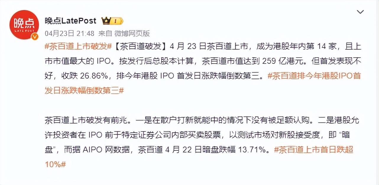作者 | 刘钦文 编辑 | 趣解商业 21岁男孩“胖猫”向网恋女友转账51万,自己却每天只点10元外卖,最后因不堪分手折磨选择跳江自杀,成为这个五一最让人难过的新闻之一。 为了祭奠胖猫,5月3日凌晨,大量网友通过在线外卖下单,点汉堡和奶茶送到重庆长江大桥寄托哀思,却意外引发“外卖空包”事件,多个相关话题霸榜热搜。其中,茶百道、蜜雪冰城等奶茶品牌因产品“装白水”“空包”,被网友指责“太没底线”。 ![]() 图源:微博截图 事后,茶百道和蜜雪冰城均发表了声明并道歉,宣布对涉事门店进行闭店或解约、退还订单金额十倍等措施。 “外卖空包”事件对茶百道(2555.HK)而言,可谓“雪上加霜”。 4月23日,茶百道刚刚登陆港交所,但上市首日即破发,当天跌幅达26.86%;一天便跌去69亿港元,相当于其三年净利润。截至5月5日,茶百道(2555.HK)报收11.84港元/股,较发行价下跌32.34%。 无论是已上市的奈雪的茶(2150.HK)、茶百道(2555.HK),还是正在冲刺IPO的蜜雪冰城、沪上阿姨、霸王茶姬等,这些新茶饮品牌在近年来以惊人的速度扩张;新茶饮市场也如同一场武林大会,各路英豪纷纷亮剑争夺霸主地位。 随着市场竞争进入白热化阶段,行业日益“内卷”,急速扩张后的一系列问题也开始显现;各大新茶饮品牌中,最终谁能“笑傲江湖”? 01.疯狂开店,争相上市 自2010年代初,以喜茶、奈雪的茶为代表的新茶饮品牌横空出世,迅速颠覆了传统茶饮市场,开启了饮品行业的“新茶饮时代”。这些品牌凭借独特的口感、时尚的包装以及创新的营销策略,吸引了大量年轻消费者的追捧,市场急剧膨胀。 ![]() 图源:罐头图库 随着新式茶饮消费场景更加多元化,品类不断创新拓宽,消费者对新式茶饮的热情持续上升,预计2025年中国新式茶饮市场规模达到3749.3亿元。 但高速增长的同时也意味着竞争的白热化,新茶饮赛道逐渐由“蓝海”转变为“红海”,甚至是“深红”。 据中国连锁经营协会新茶饮委员会联合美团新餐饮研究院共同发布的《2023新茶饮研究报告》显示,截至2023年8月31日,在业的新茶饮门店总数约51.5万家,比2020年年底37.8万家,增长超36%。 据“趣解商业”了解,2020年,蜜雪冰城净增门店数5897家;2021年净增门店数达到7382家;2022年,蜜雪冰城开店10022家;而在2023年前9个月,蜜雪冰城新增门店数约4992个。平均每天落地20.67家。 茶百道2020年新增加盟门店1712家,2021年新增2843家,2022年新增1358家,三年时间新增5913家加盟门店;平均每天落地5.5家。 ![]() 图源:罐头图库 据中商产业研究院统计,2023年我国新式茶饮品牌门店数量排在前十的品牌为:蜜雪冰城、古茗、茶百道、沪上阿姨、益禾堂、书亦烧仙草、甜啦啦、CoCo都可、喜茶、霸王茶姬、1点点、奈雪的茶。 其中,截至2023年12月,古茗的门店网络共有9001家门店,较上年同比增长35%;截至2024年4月5日,茶百道门店数已经达到8016家,遍布全国31个省市。 ![]() 图源:中商情报网 除了加速开店外,各大茶饮品牌还纷纷选择向资本市场前进,争相上市。 2022年蜜雪冰城寻求在A股上市;2023年8月,茶百道向港交所递交《招股书》;2024年1月2日,蜜雪冰城和古茗同日向港交所递交主板上市申请;2月14日,沪上阿姨向港交所递交上市申请。此外,还有霸王茶姬、新时沏、甜啦啦等,均有被传出在美股或港股上市。 但与茶饮品牌对资本市场的热情相比,资本市场对奶茶似乎有些“腻了”。 2021年6月30日,奈雪的茶顶着“茶饮第一股”的名号登陆港交所时,上市首日就破发,收盘报17.12港元,较发行价下跌近14%。截至2024年5月5日,奈雪的茶报收2.8港元/股,相较发行价已跌去了85.86%。 2024年4月23日,茶百道作为“茶饮第二股”刚刚登陆港交所,与奈雪的茶命运相似,上市首日即破发,当天跌幅达26.86%,一天便跌去69亿港元,相当于其三年净利润;截至5月5日,报收11.84港元/股,较发行价下跌32.34%。 ![]() 图源:微博截图 实际上,对于茶百道的破发和大跌,有行业人士早已预料到,因为在茶百道新股认购时,公开发售市场散户打新热情不高,甚至出现未足额认购情况。 对于已经砸下真金白银的投资人来说,上市几乎就成了唯一的退出之路;但问题是,资本市场还能“喝下”多少“奶茶”? 02.狂飙背后的“红与黑” 因为投资门槛低、标准化程度高,可复制性强,现制饮品可以说是所有餐饮品类中连锁化率最高的品类。据《2023新茶饮研究报告》显示,新茶饮2022年连锁化率高达55.2%;在多个城市核心商圈的抽样调查中,新茶饮的连锁化率超过80%。 门店数量遥遥领先的蜜雪冰城、茶百道、古茗、甜啦啦等均为以加盟模式为主;刚刚上市的茶百道,截至2023年底,茶百道营收来自加盟店的收入达到56.59亿元,占比99.1%。 曾经只做直营的喜茶、奈雪的茶、乐乐茶,也在2023年相继宣布开放加盟。 但上千家乃至上万家门店的管理,绝不是件轻松事。 首先,因加盟店管理不到位而引发的食品安全事件,也屡见不鲜,今年“3·15”期间,就有书亦烧仙草、古茗和茶百道等品牌,因频改食材效期标签、过期继续使用、新旧食材混合等行为被点名。 ![]() 图片来源:微博截图 据“黑猫投诉”官网显示,线下餐饮机构的红、黑榜中,奶茶品牌占据大多数位置。红榜前十名中,7家为茶饮品牌,包括茶百道、瑞幸、霸王茶姬、星巴克、喜茶等;8家黑榜企业中,5家为茶饮品牌,包括益禾堂、甜啦啦、茶颜悦色、一点点、书亦烧仙草。 值得注意的是,“