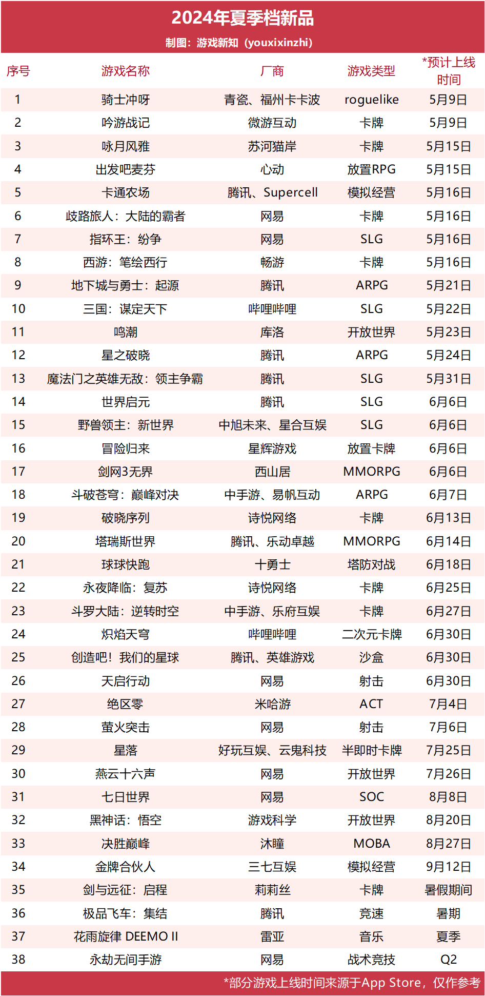 来源 | 游戏新知 作者 | 鳗鱼 2024年的夏季档将有不少新游戏扎堆上线。 其中有的游戏早就吊足玩家胃口,如《鸣潮》《地下城与勇士:起源》《歧路旅人:大陆的霸者》等,现在都定档在5月份上线。《绝区零》《星之破晓》《七日世界》等游戏都在App Store上开启了预订页面,也敲定了上线时间。今年还有《黑神话:悟空》《燕云十六声》这样的主机/PC游戏格外受到瞩目。 有几家实力雄劲的厂商还会相互打听友商产品的上线时间,虽然他们的产品应该不存在核心用户严重重叠的情况,但是选择上线时间点依然非常重要。这关乎于泛用户是否会被抢夺、上线声量是否会掩盖,甚至于是否能够借助早期的积极市场反响带动后续的用户进场。时间都起到了一个关键的作用。 游戏新知根据预订页面及公开信息整理了一部分预计在5至9月上线的产品(游戏可能会在App Store上调整日期或下架,上线时间仅作参考)。另外按照惯例,腾讯和网易都可能会在暑期之前开展游戏发布会,可能还会有更多游戏产品参与到夏季档竞争中。 ![]() 以下是部分值得关注的游戏新品: 1、《鸣潮》 《鸣潮》是库洛游戏旗下首款二次元开放世界游戏,已定档在5月23日上线PC及手游版本。目前游戏的全球预约量已经突破了2000万。 动作要素是《鸣潮》明显区别于其他开放世界游戏的内容。库洛在完成了《战双帕弥什》的开发之后准备做一款具有技术壁垒的动作游戏产品,于是选定了开放世界这一方向。根据制作人李松伦在TDW2022开发者沙龙上透露的信息推测,《鸣潮》研发了将近3年时间。 从2022年7月开启首次技术测试,到今年3月结束的「奏鸣测试」,《鸣潮》经历过不少的改动。今年年初制作组曾透露,团队用了不到一年的时间对《鸣潮》的剧情进行了将近90%的迭代,重做了包括台本、配音、美术等内容。 ![]() 2、《绝区零》 《绝区零》是米哈游旗下ARPG新作。当前《绝区零》尚处于三测阶段,其App Store页面显示预计在7月4日上线。 此前《绝区零》将动作战斗部分打磨得足够完善,在角色连携的基础上加入了极限援助系统,让战斗节奏更加平衡。在三测版本中则进一步围绕游戏体验做优化,比如在空洞探险过程中加入了动画加速的功能、在UI界面中加入收集物的提示。 《绝区零》在美术方面别具特色。前阵子官方放出了首篇创作笔记,其中制作人李振宇表示个人最擅长的包装和平面设计,所以在研发初期就决定了利用视觉平面设计和动画转身演出来刻画角色形象,放大展示角色的特点。这也给二次元角色的形象传达带来了新思路。 ![]() 3、《星之破晓》 《星之破晓》是腾讯天美工作室旗下的「王者荣耀」IP动作手游,也是IP矩阵下进展比较快的一款产品。《星之破晓》3月底结束了终测,其TapTap页面显示在Q2首发,App Store页面显示预计在5月24日上线。 《星之破晓》在角色设计方面也参考了《王者荣耀》中的原型。比如角色百里玄策还是以钩镰为武器,命中敌人后可以将其甩到身后,对于受众群体来说保留了人物特色。在和百里守约、铠等角色对战时,游戏还会有相应的特殊语音,符合世界观下的人物关系。 目前平台格斗手游在国内市场还没有比较成功的产品。《星之破晓》能够借着IP知名度扩圈,现在更着重玩法上的公平性,并表示公测时会将所有英雄以50%的胜率为目标进行调整。 ![]() 4、《地下城与勇士:起源》 《地下城与勇士:起源》是《地下城与勇士》的手游版本,今年2月拿到版号后在月底开启了一轮先遣测试,前段时间定档在5月21日上线。 《地下城与勇士:起源》在2022年由NEXON在海外上线,Sensortower数据显示当年游戏在韩国畅销榜排名第5(iOS+Google Play收入总和),至今也仍保持在韩国iOS畅销榜TOP60,2年来的运营成绩比较稳定。 国服版本在经过测试之后,制作组依然计划做出针对性调整。比如在公测版本中计划暂时删除的职业羁绊功能,避免强迫玩家去玩指定的职业,未来在调整过后再上线这一功能。 ![]() 5、《极品飞车:集结》 《极品飞车:集结》是天美工作室下的赛车竞速手游,游戏制作人薛皓晟曾任《QQ飞车》手游项目的副制作人。4月初《极品飞车:集结》宣布在今年暑期上线,TapTap页面显示会在Q3上线。 《极品飞车:集结》在赛车竞速品类中还没有严格意义的对标产品。游戏玩法保留了《QQ飞车》中关于漂移和氮气加速的设计,保证了竞速的爽快体验;同时又在漂移操作中融入了反打等设计,为玩法增加了拟真性。《极品飞车:集结》中制作了拟真车型、大世界地图和爽快驾驶体验,既还原了「极品飞车」IP系列的特点,也让这款手游的定位较具差异化。 ![]() 6、《萤火突击》 《萤火突击》是网易旗下的生存夺金手游。制作组透露表示游戏将在2024年内上线,3月底测试了公测冲刺版本,App Store页面显示预计上线时间为7月6日。其海外版本《Lost Light》在2022年9月上线,海外成绩相对平淡,不过运营了半年后出现了一波回暖,猜测积累了一定运营经验。 《萤火突击》是网易第二次入局国内生存夺金赛道了。去年6月份网易上线了同类的《超凡先锋》,很快就掉出iOS畅销榜TOP200名,这一赛道始终被腾讯的《暗区突围》占据。 作为后来者,《萤火突击》承诺所有枪械皮肤都将免费投放,玩家可以通过游戏中「镭钻竞技场」等玩法免费获得。靠着新颖的商业模式和之前累积起的玩家生态,《萤火突